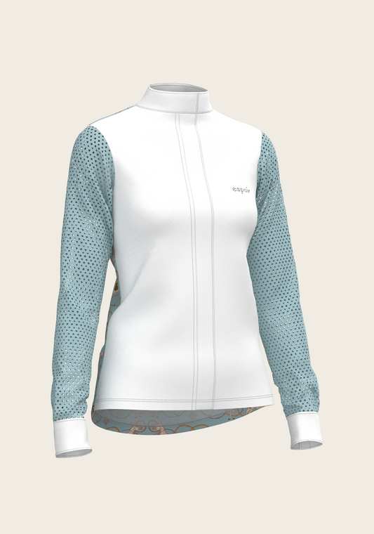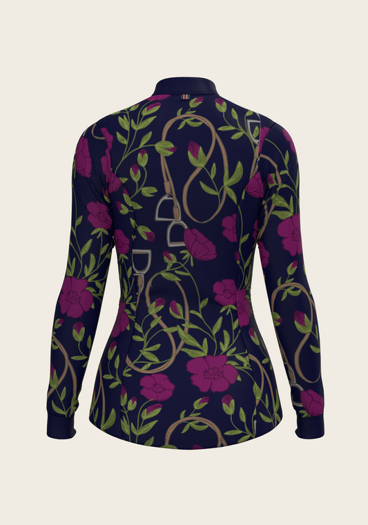 Peony in Blue on Tan Quarter Zip Sun Shirt
