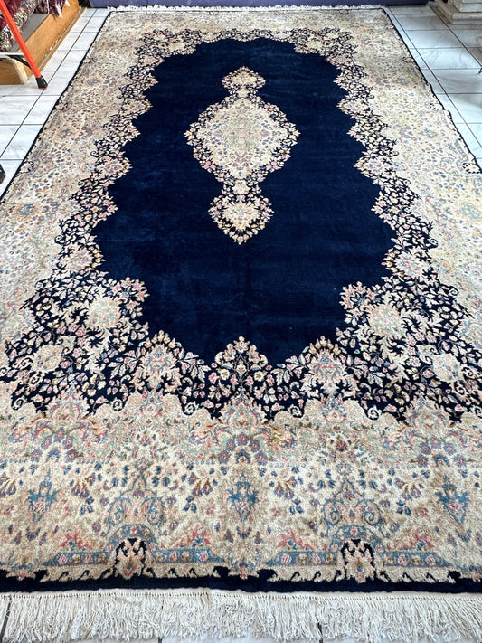 Palace-Size Vintage Royal Kirman Wool Rug – 9’9” x 17’2” – Hand-Knotted Persian Elegance with Deep Navy Field