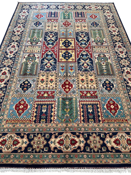 6'9″ x 10' Hand-Knotted Afghani Bakhtiari Wool Rug – Persian Garden Design – Blue & Cream