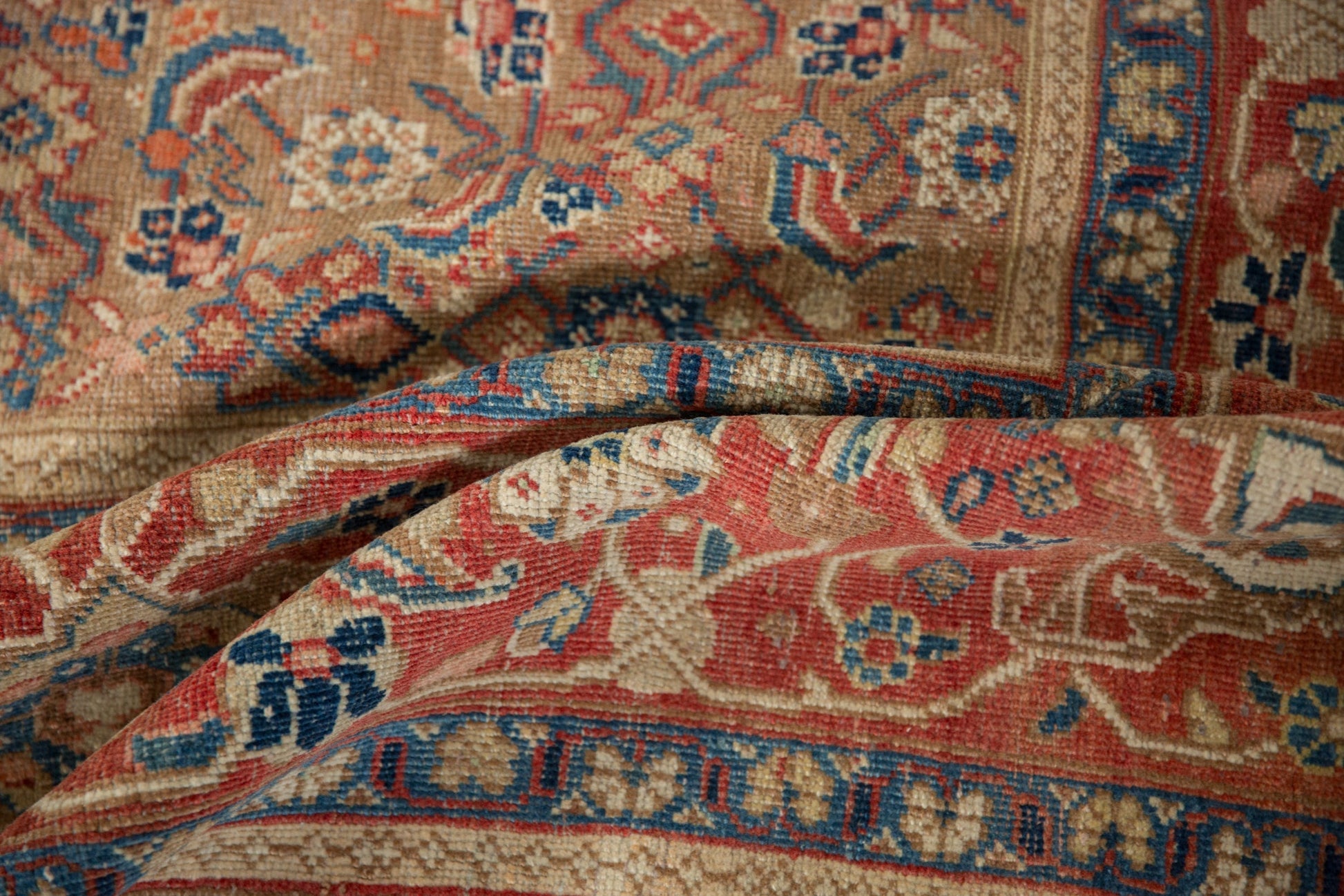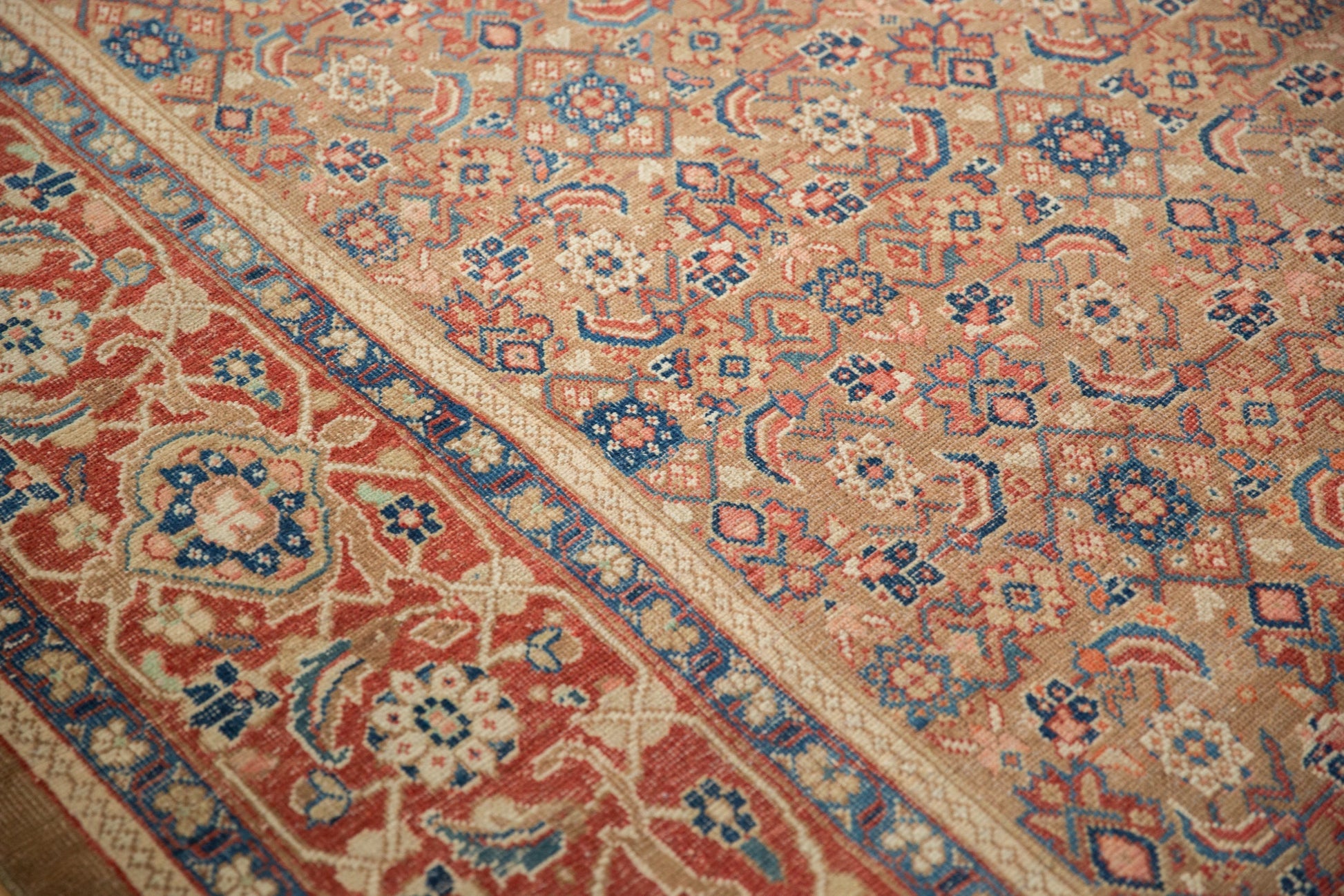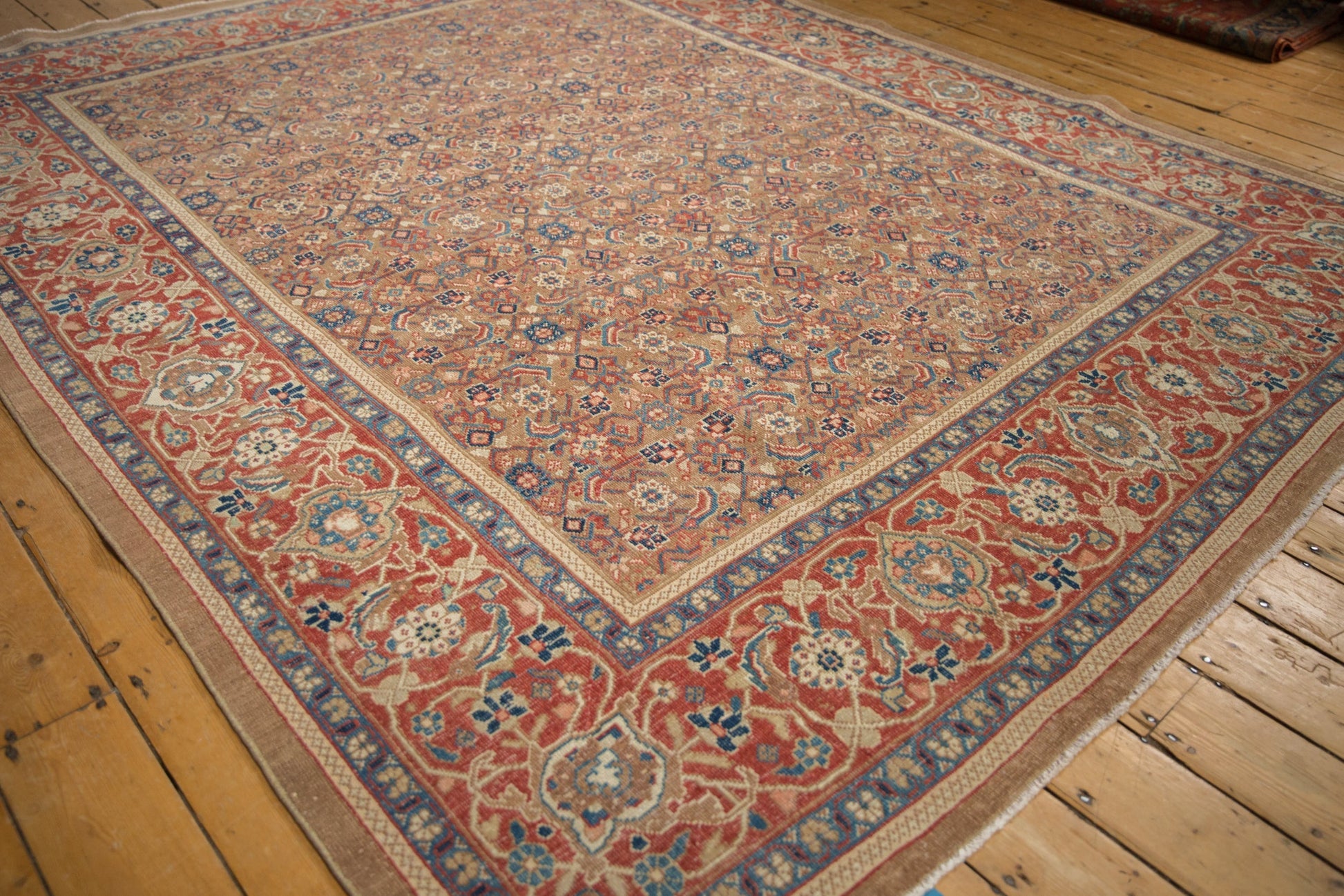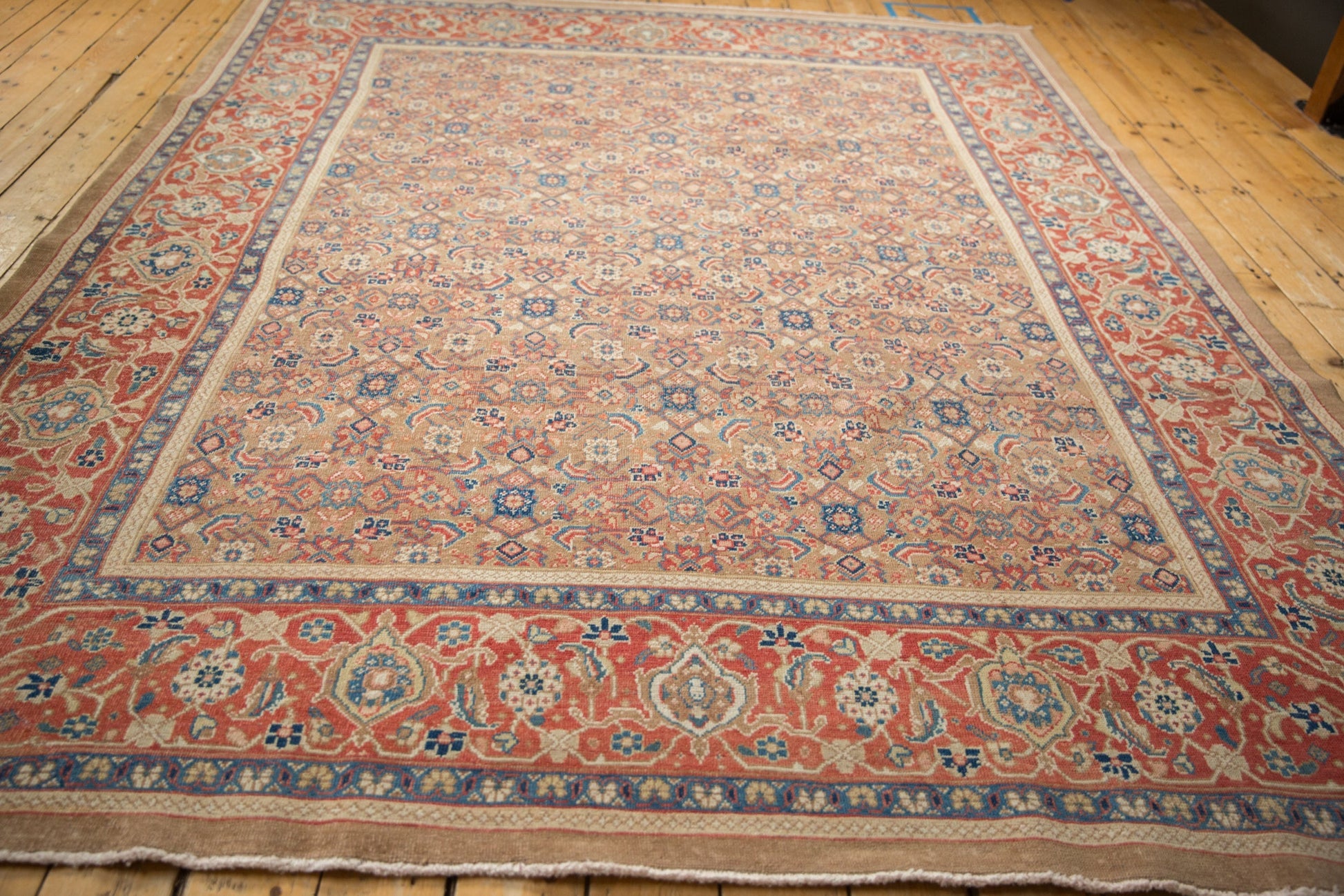 :: Allover covered Herati main field with a wide banded Turtle Samovar main border and unusual outer wide stripe solid color border matching the interior field. Colors and shades include: Camel, sapphire blue, sky blue, beige, sand, cherry red, and more. Condition notes: Mostly even wear across to knot heads with faint foundation showing through. Fully secured sides and ends. Machine binding. Scattered expert restorations throughout. Some light localized oxidation. Recently professionally cleaned ready for in-home use! Many years of enjoyment to come with this hand knotted Northwest Persian carpet made in Persia circa 1920's vintage. Size measures 8' x 10'1".