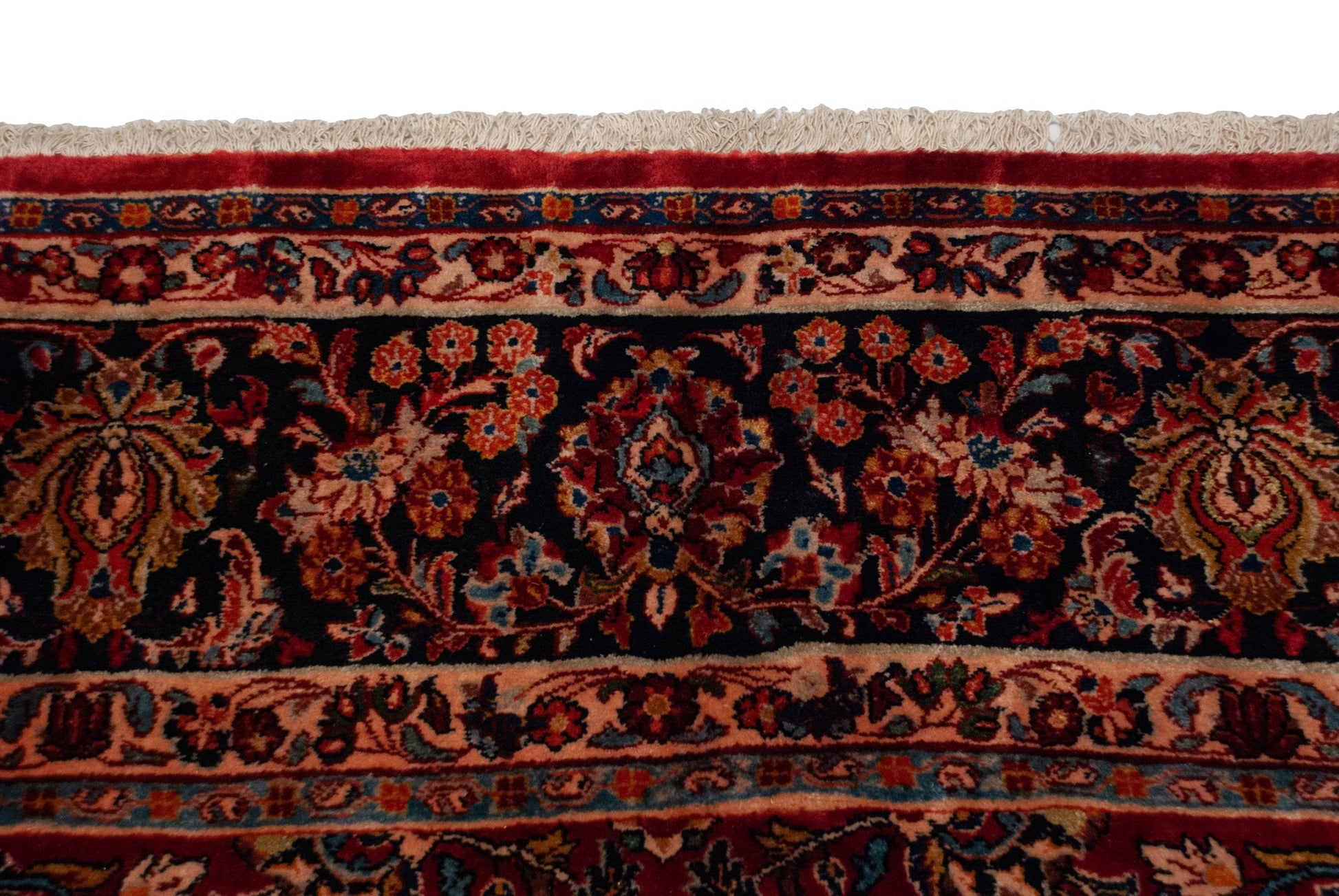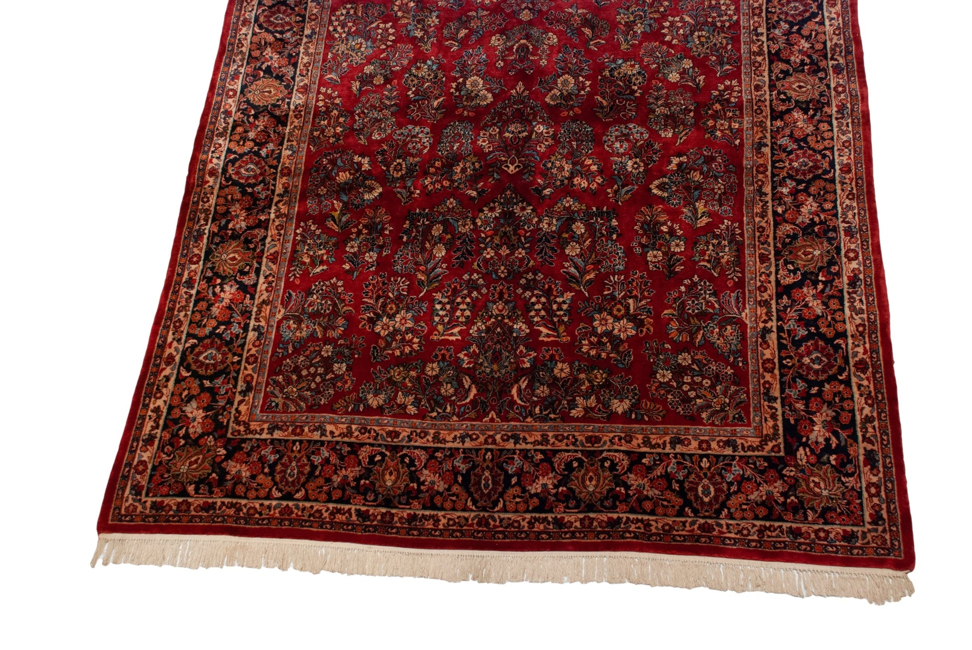 :: Unusual size, scale, proportion and condition allover covered field in floral spray bouquets wrapped by an intricate palmette and blossom main border. Colors and shades include: Cherry red, ivory, navy blue, sapphire blue, sky blue, coffee brown, blush, gold, and more. Condition notes: Like-new, original full pile height even across. Original side cord selvages intact. Fully secured sides and ends. Slight contour to shape, within normal margin for type and age. Recently professionally cleaned ready for in-home use! Many years of enjoyment to come with this hand knotted Persian American Sarouk carpet made in Persia circa 1940's vintage. Size measures 8'10 x 17'10".