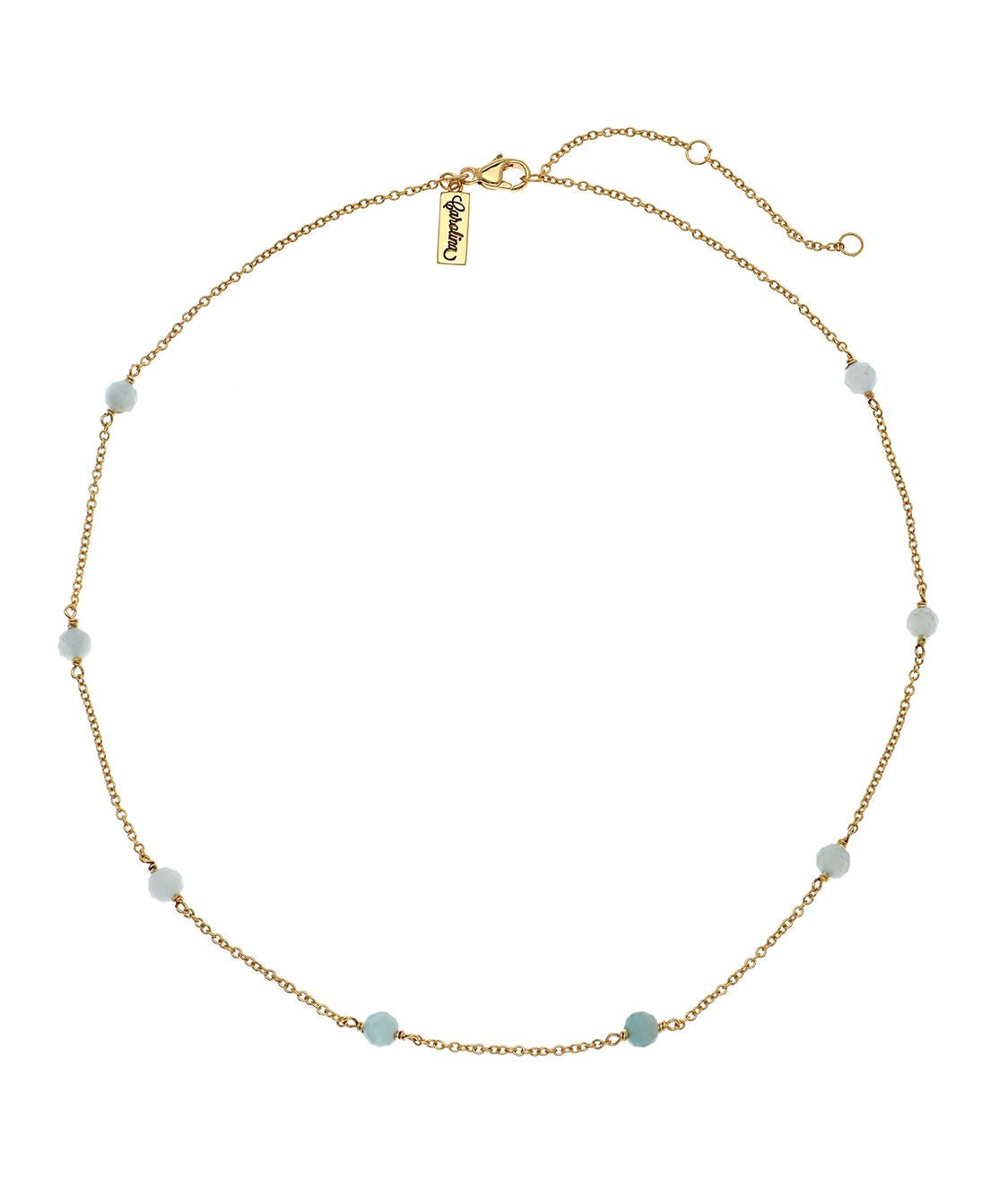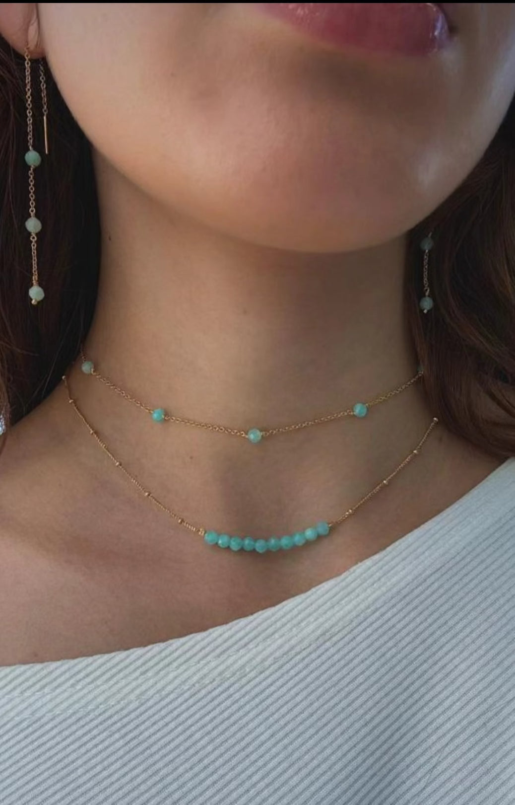 AMORA is an 18k goldfilled choker necklace of 14" plus 2" with natural stone accents (rose quartz, amazonite, and black onyx). The exquisite design is a stunning addition to any jewelry collection.