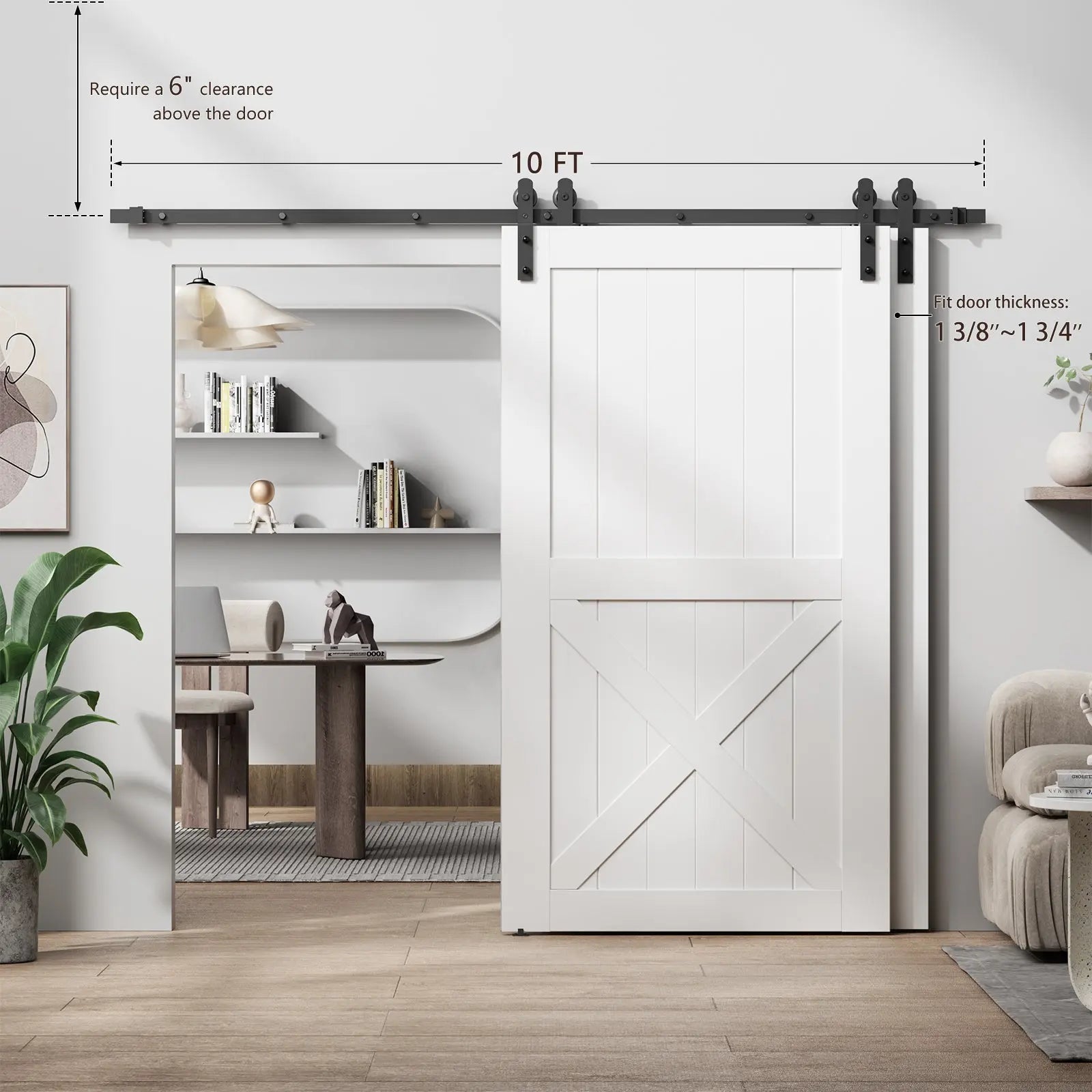 - SINGLE TRACK BYPASS SYSTEM : Upgraded One-Piece single track bypass sliding barn door hardware is low ceiling design, only need 6 inch ceiling space from top of the door to ceiling; Wall-mounted is very easy to install, no tedious installation steps, saves more space than a side pull door and traditional double track bypass kit