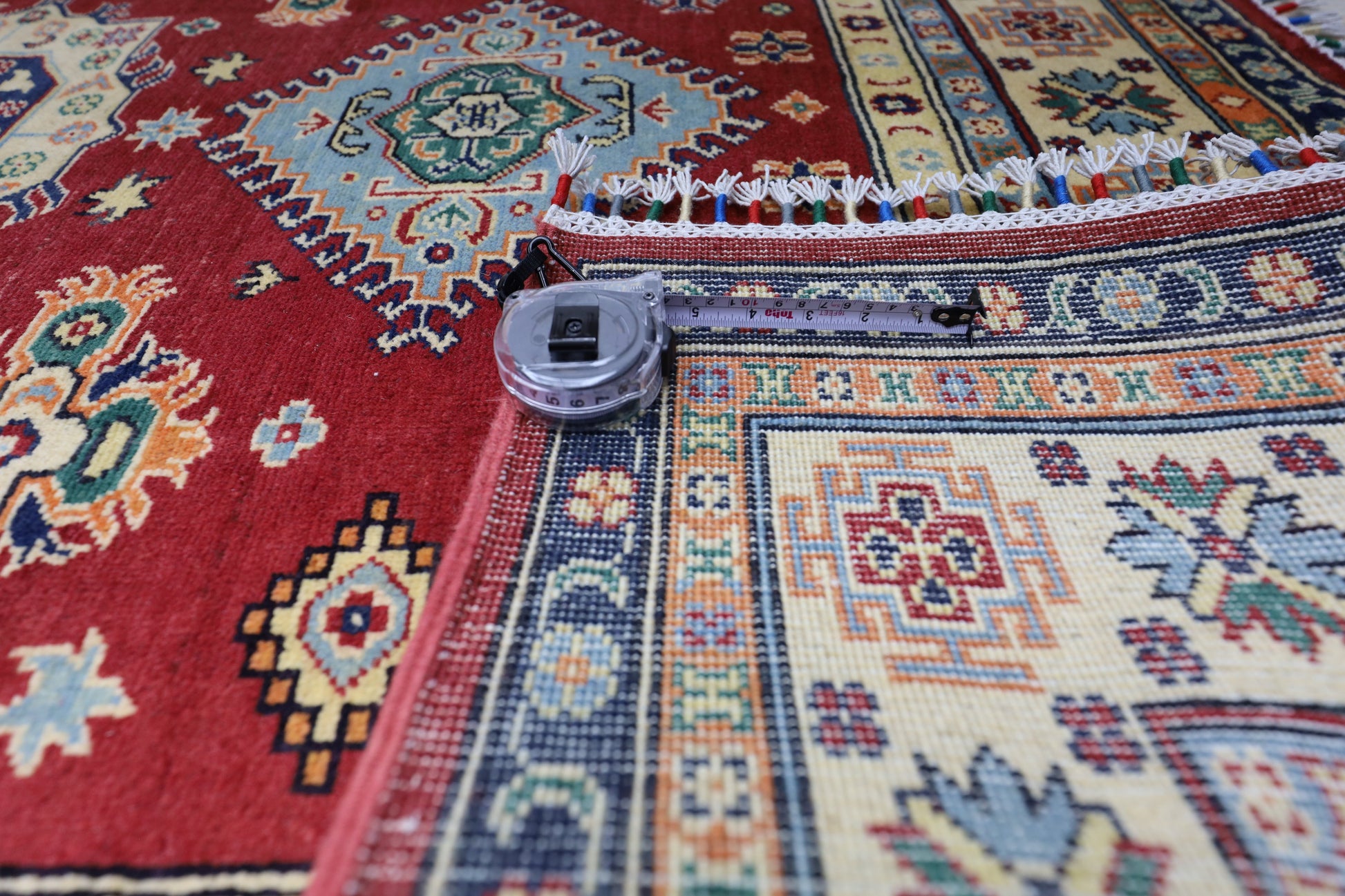 This hand-knotted kazak rug features rich color tones and traditional Afghan weaving. Made with high-quality wool on a cotton foundation, it offers both beauty and durability. Ideal for adding character and texture to entryways, living rooms, or studies.