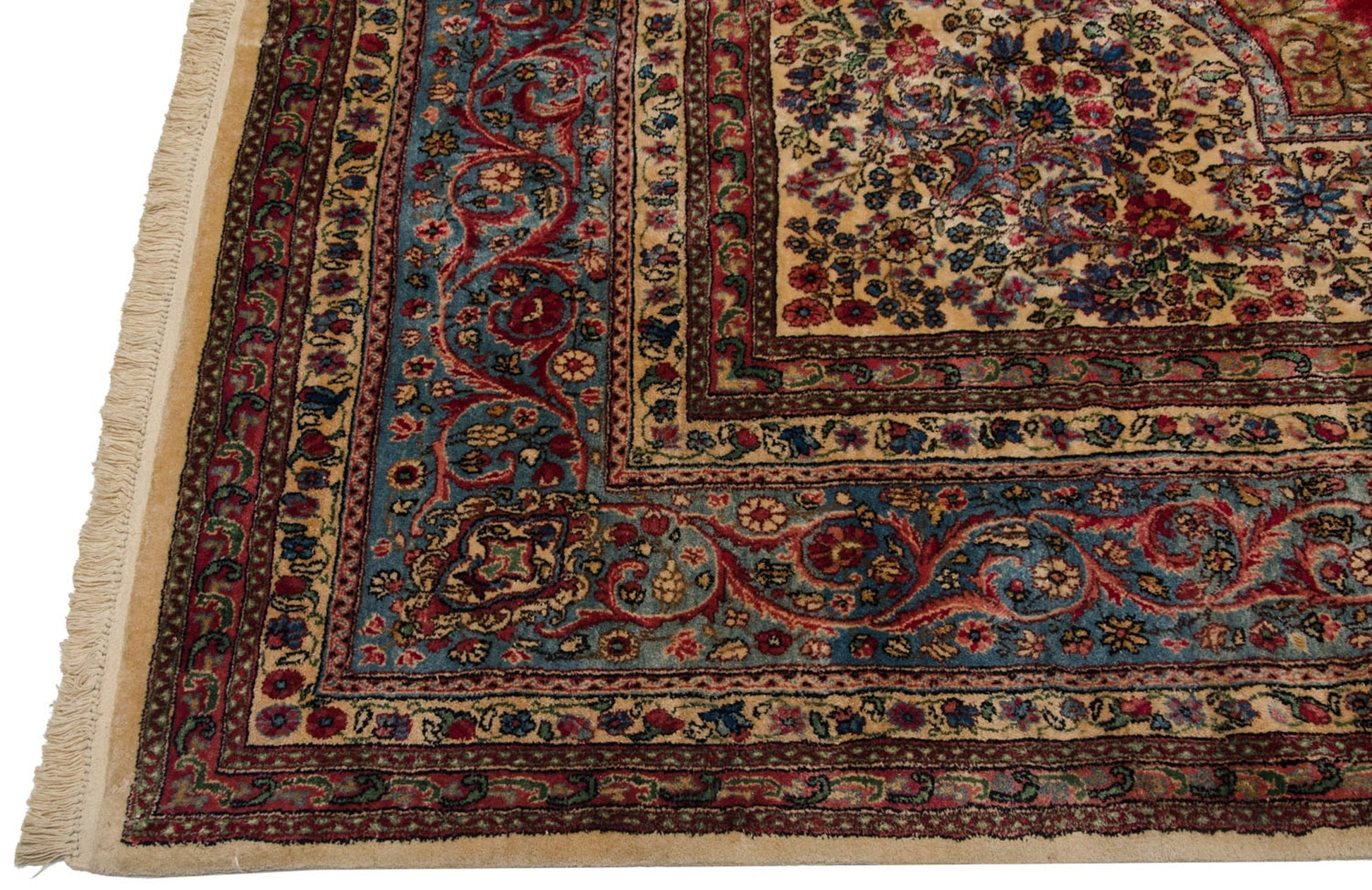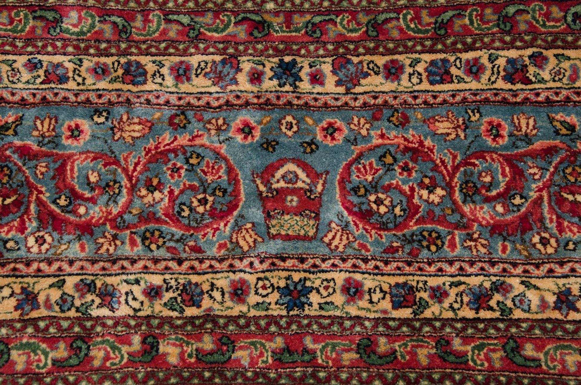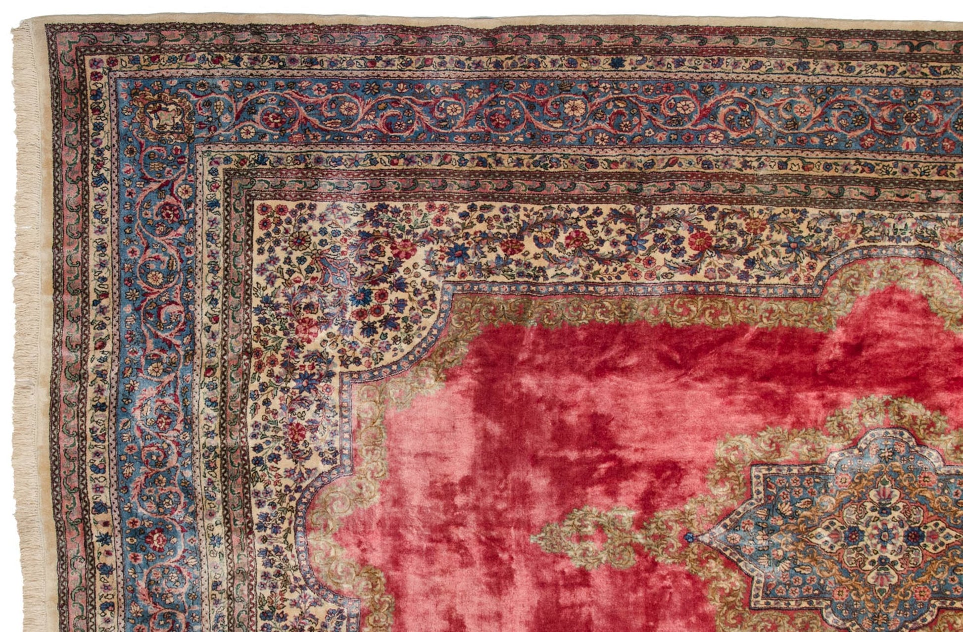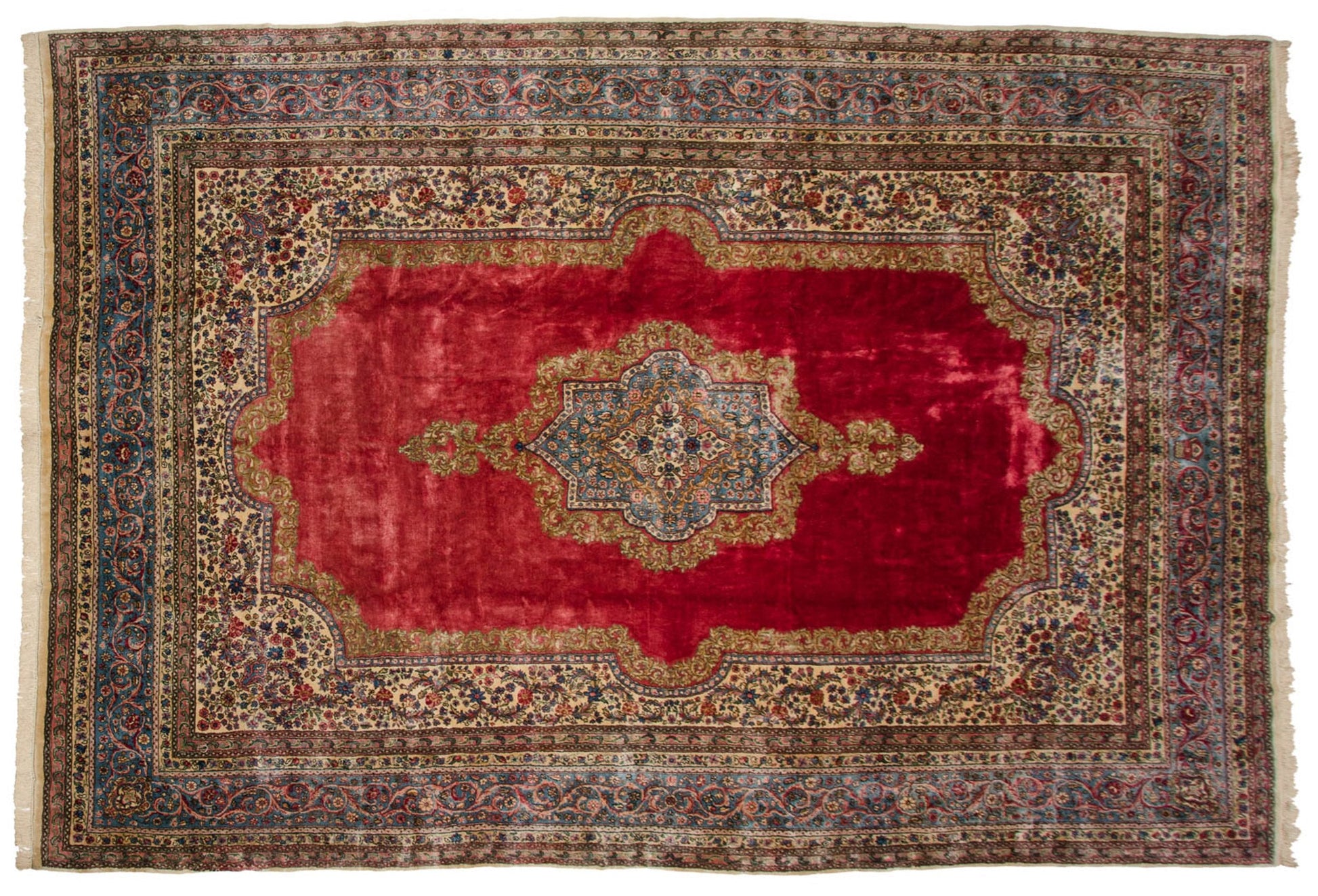 :: Center medallion with enveloped Rococo stylized outline atop an open deeply saturated main field and book cover field overlay buffered by a reciprocating Rococo stylized meandering vine bearing an interior densely ornamented diminutive floral design motif in a millefleur style. Main border comprised of an elaborate scrolling vine and arabesque design motif. High quality carpet with exceptional wool and tight weave. Cyrus Crown® insignia found at the top center of the main border. Colors and shades include: Cochineal red, sky blue, ivory, navy blue, blush, powder blue, mint green, sand, beige, rose, and more. Condition notes: Like-new, original full pile height even across. Original side cord selvages intact. Fully secured sides and ends. Recently professionally cleaned ready for in-home use! Many years of enjoyment to come with this hand knotted Persian Kerman carpet made in Persia circa 1940's vintage. Size measures 9'11" x 14'7".