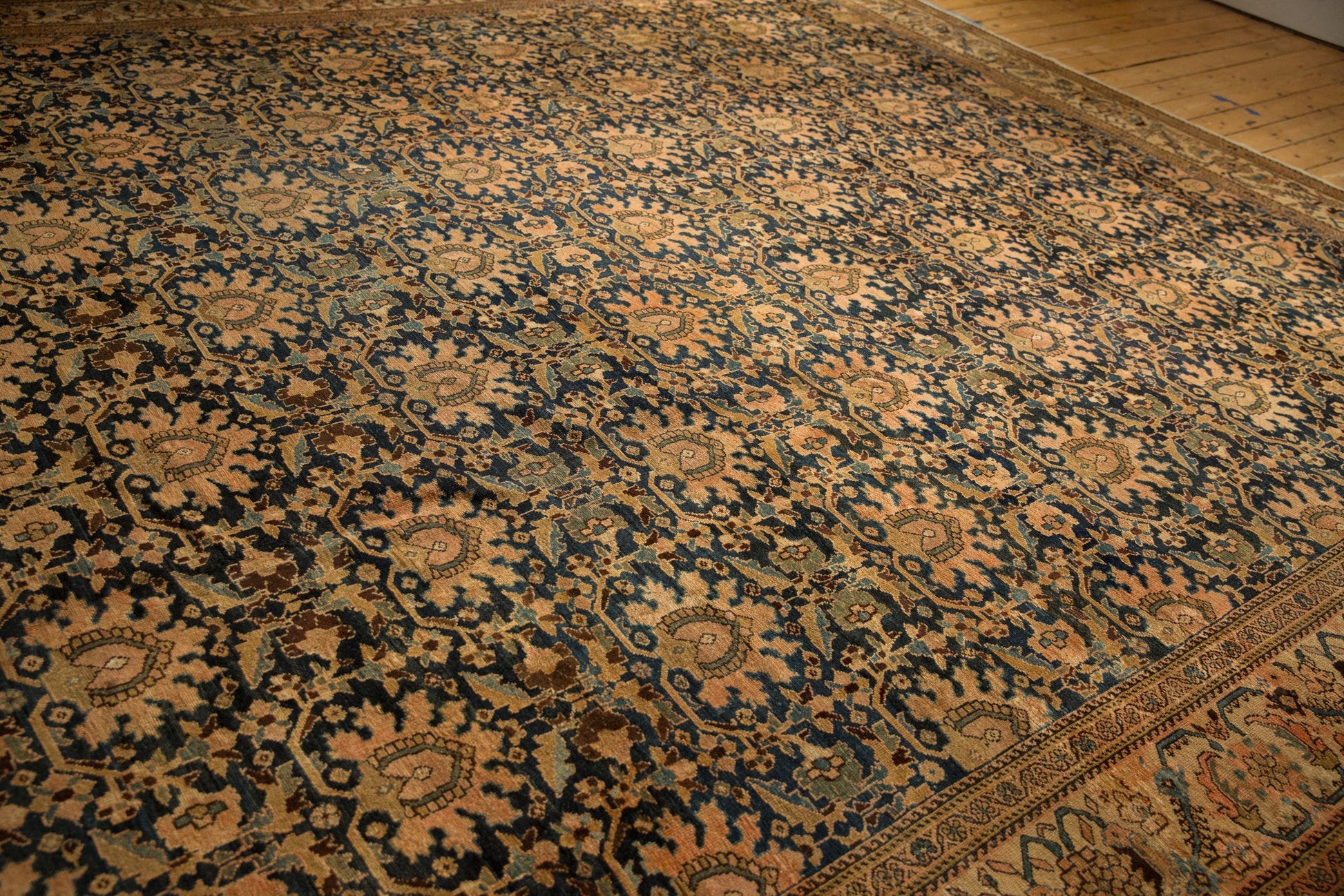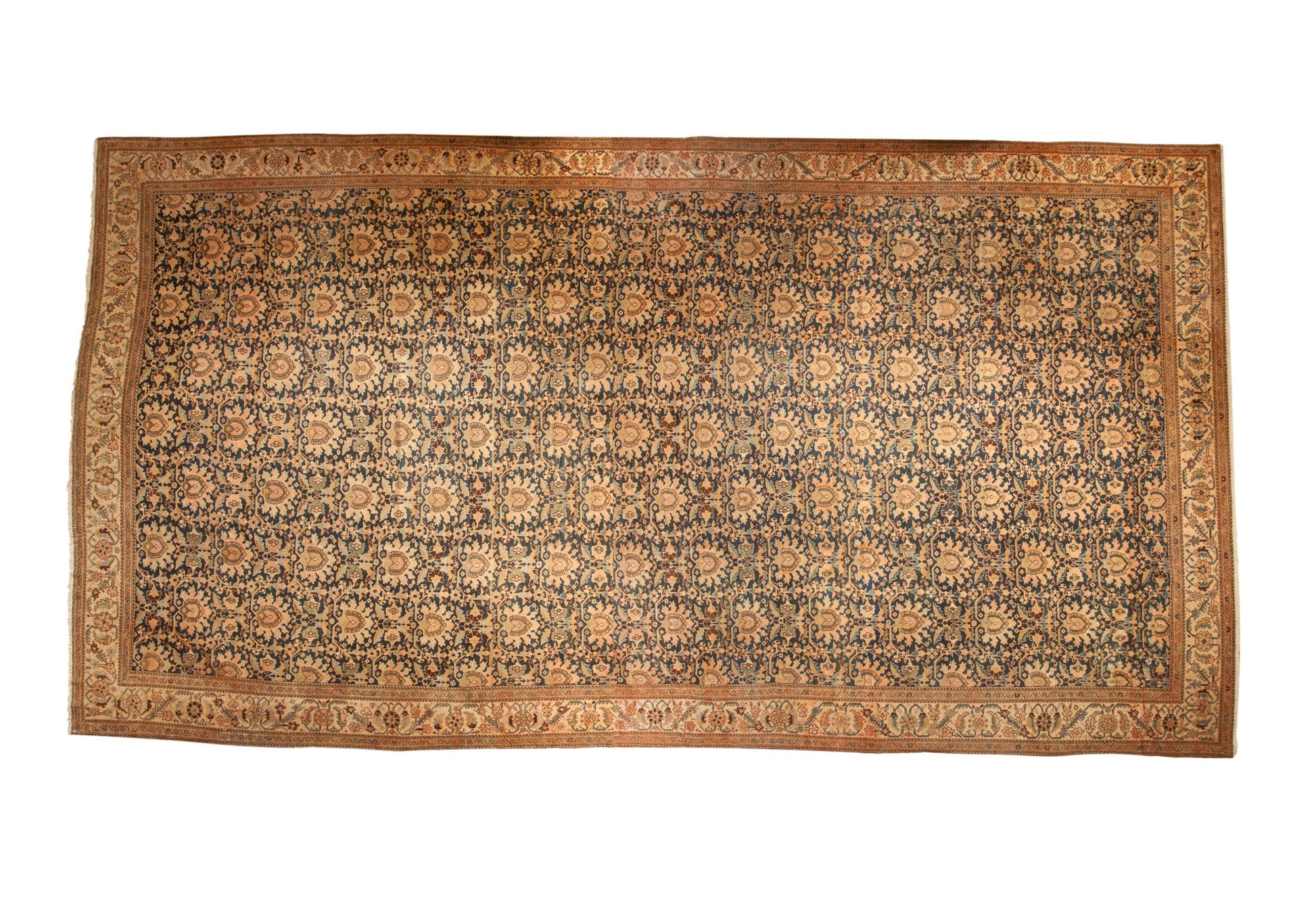 :: Allover covered field in palmette design motif arranged in staggered rows and lattice orientation. Colors and shades include: Navy blue, cobalt blue, chocolate brown, antique ivory, beige, sand, dusty jade green, dusty powder blue, dusty blush, and more. Condition notes: Mostly even wear across to knot heads. Most of the original side cord selvages are intact or restored. Fully secured sides and ends. Recently professionally cleaned ready for in-home use! Many years of enjoyment to come with this hand knotted Persian Malayer carpet made in Persia circa 1920's vintage. Size measures 12'3" x 23'3".