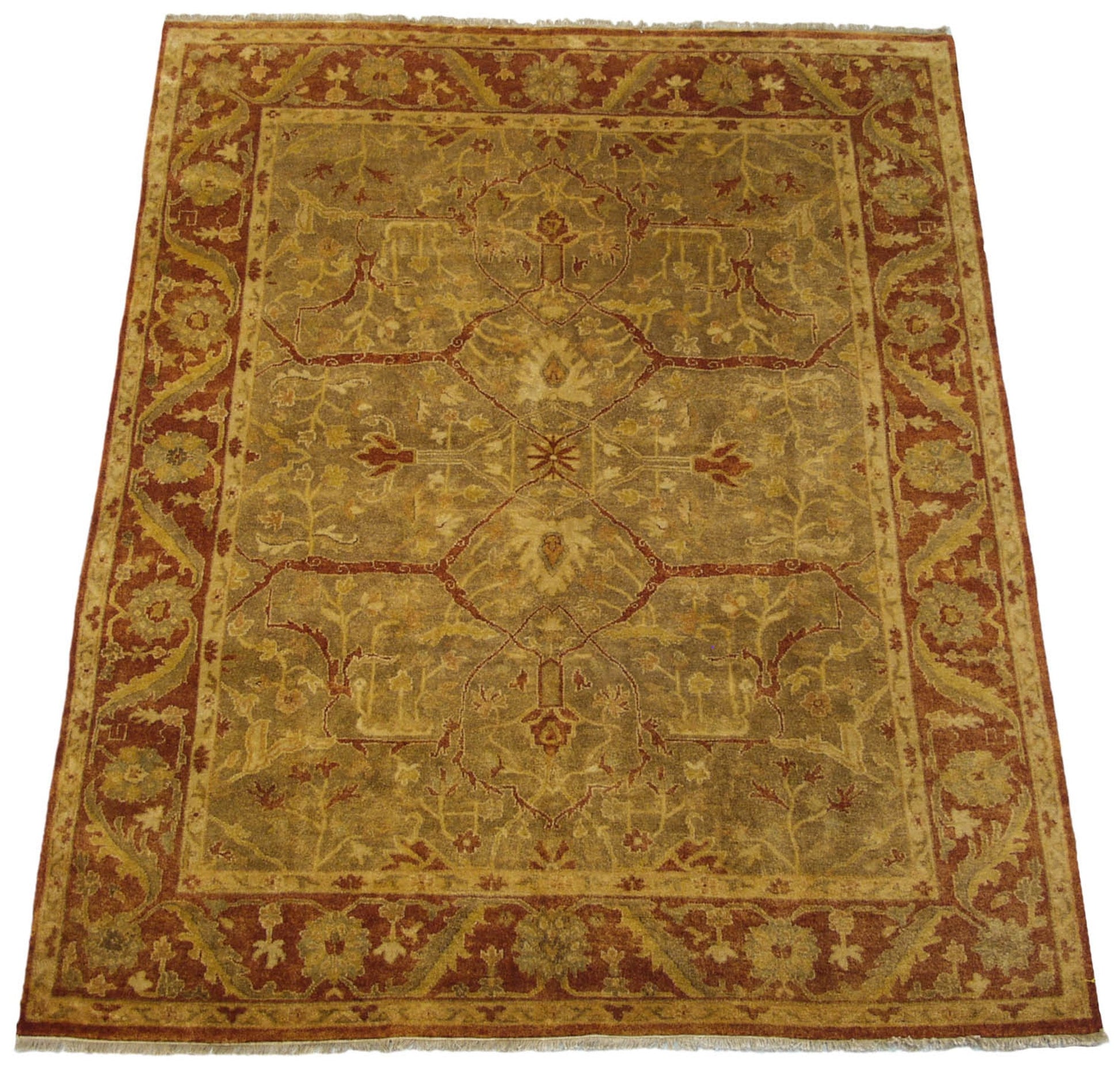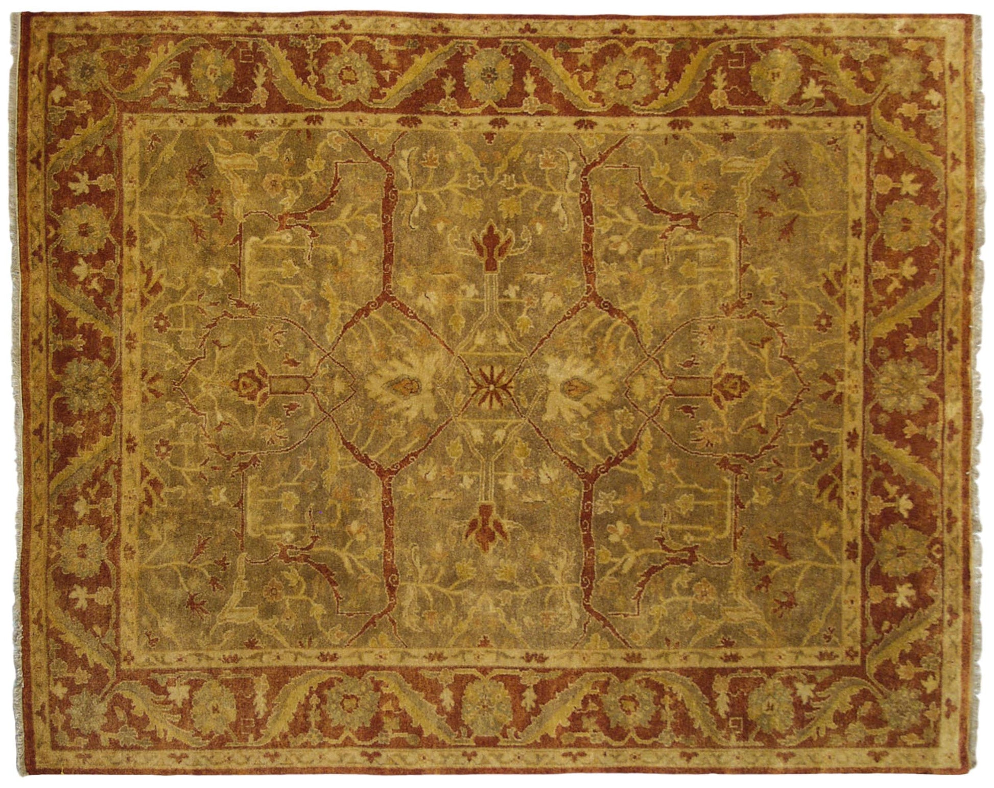 :: Allover covered field in a classic Oushak, bearing large scale Samovar turtle design shadow arabesques, wrapped by a fluid elongated meandering vine and serrated leaf main border. Soft pile with high luster and polished sheen, adding to the dynamic in disparity in coloration to the light and dark sides. Colors and shades include: Sage green with a gold cast, dusty olive green, copper, burnt orange, rust, antique ivory, and more. Condition notes: Like-new, original full pile height even across. Original side cord selvages intact. Fully secured sides and ends. Recently professionally cleaned ready for in-home use! Many years of enjoyment to come with this hand knotted Indian Oushak design carpet made in India circa 2000-2010 vintage. Size measures 8'1" x 10'1".