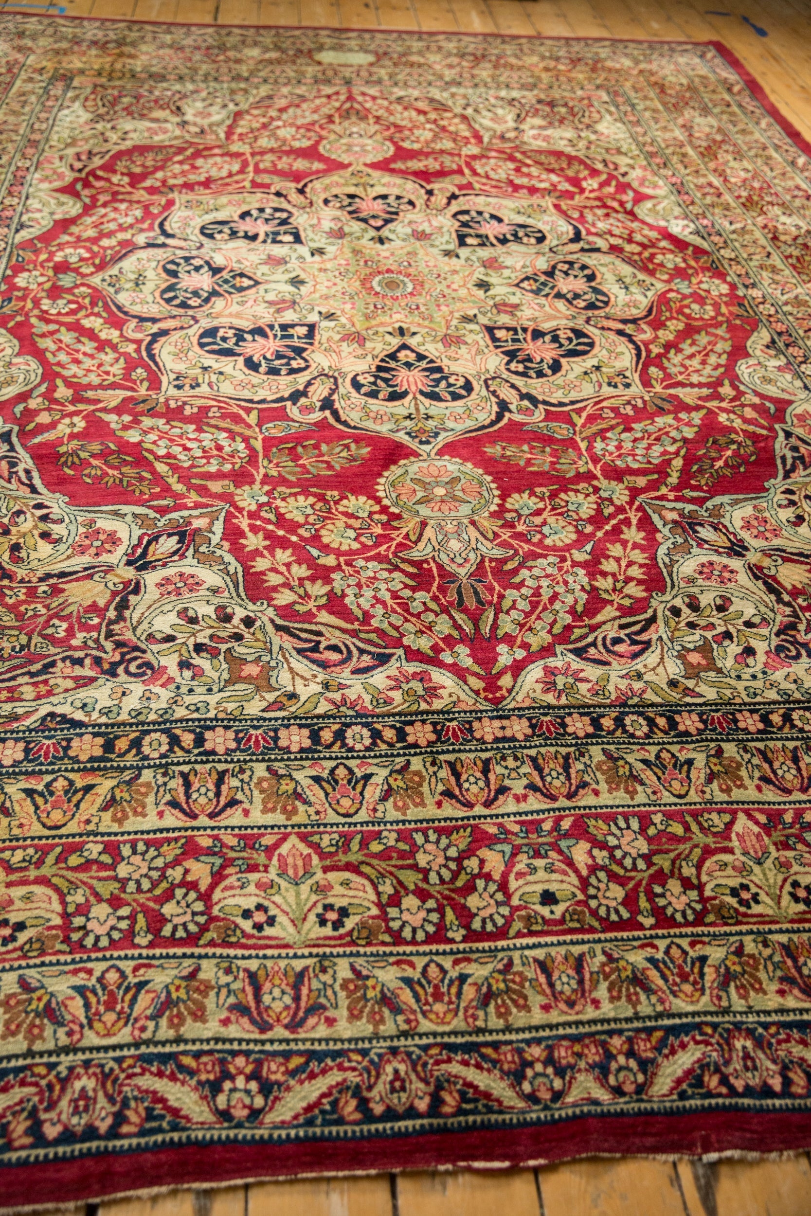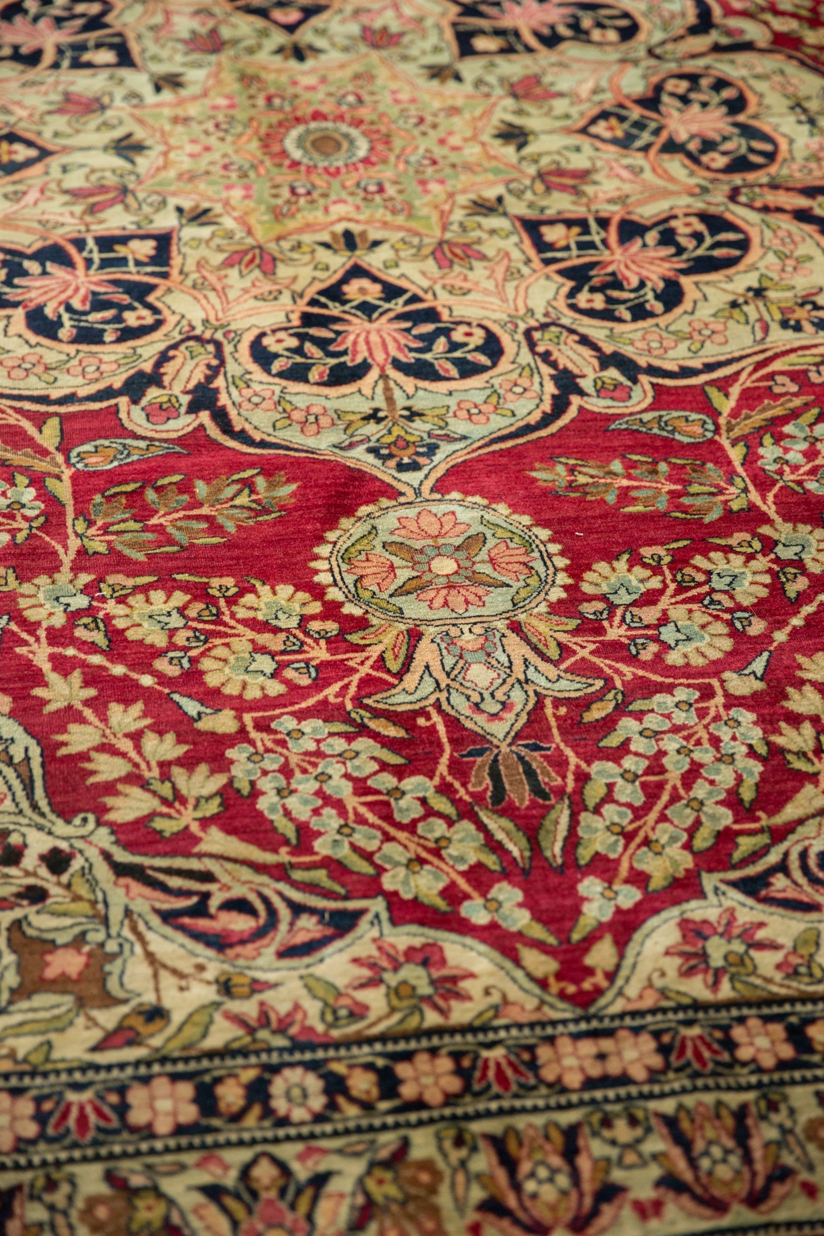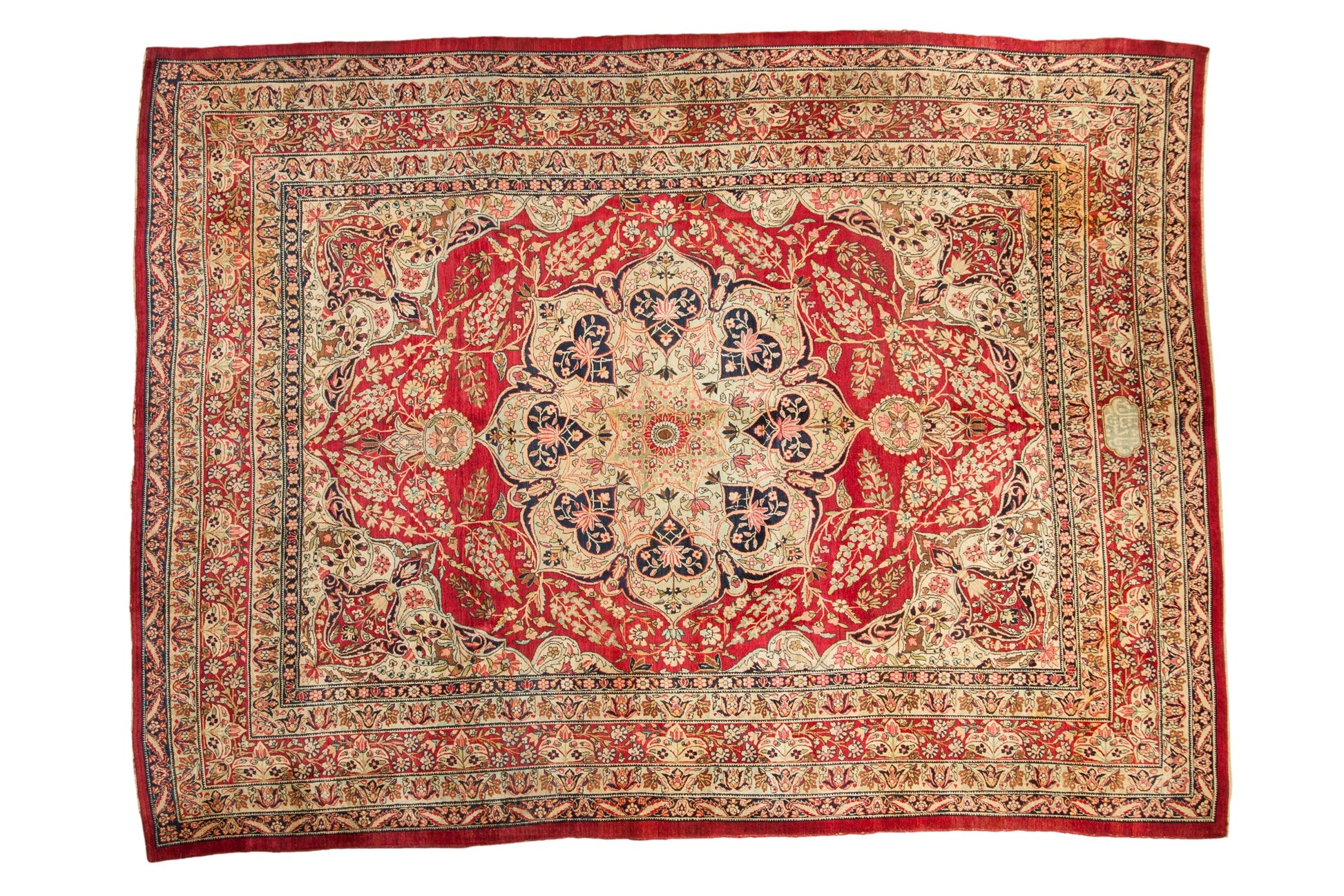 :: Starburst center medallion with trefoil contoured floral panels adorned at either end by roundel finials atop a covered field of interconnected floral sprays in cypress tree contour. Main border in a germinating lotus flower design motif. Signature cartouche in the top center of the main border. Elegantly drawn design and detailing in an unusual, closer to original pile height, rug for type and age. Colors and shades include: Cochineal red, antique ivory, navy blue, dusty powder blue, lime green, and more. Condition notes: Areas of pile and knot heads. Most of the original side cord selvages are intact or restored. Fully secured sides and ends. Several localized areas of spot tinting, possibly due in part due to an uneven absorption of the antique wash, and oxidation. Recently professionally cleaned ready for in-home use! Many years of enjoyment to come with this hand knotted Persian Kerman carpet made in Persia circa 1910's vintage. Size measures 9'2" x 12'1".