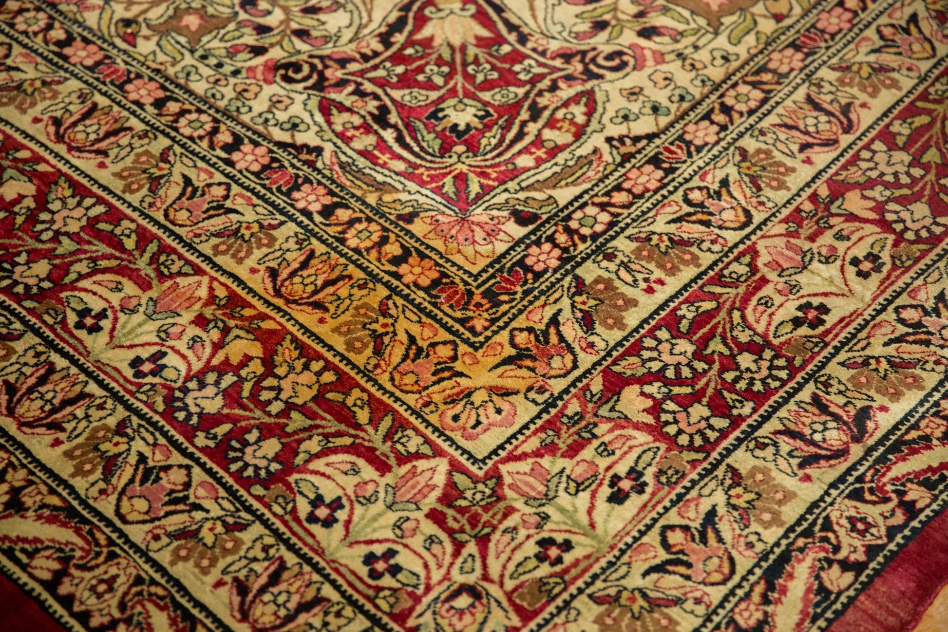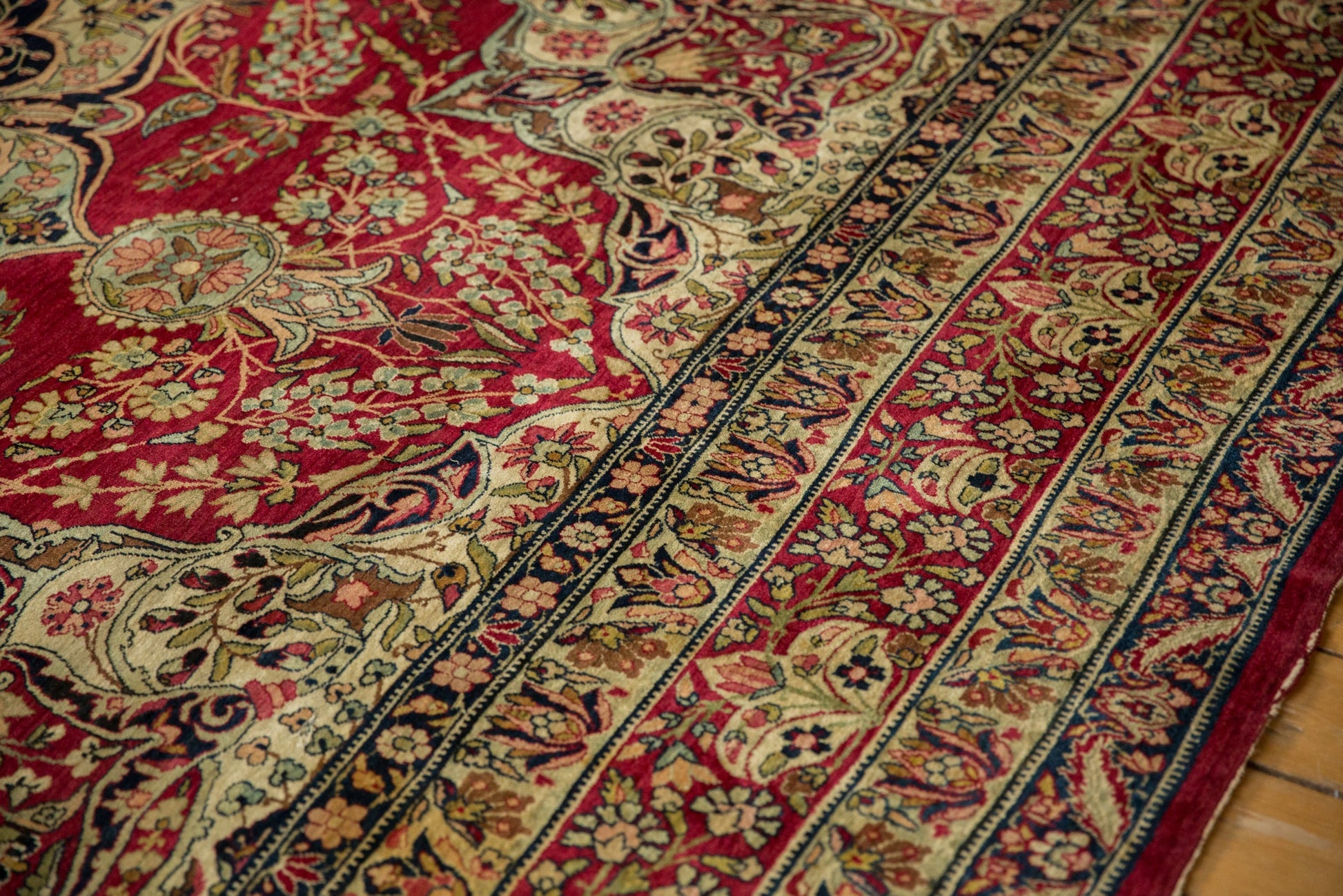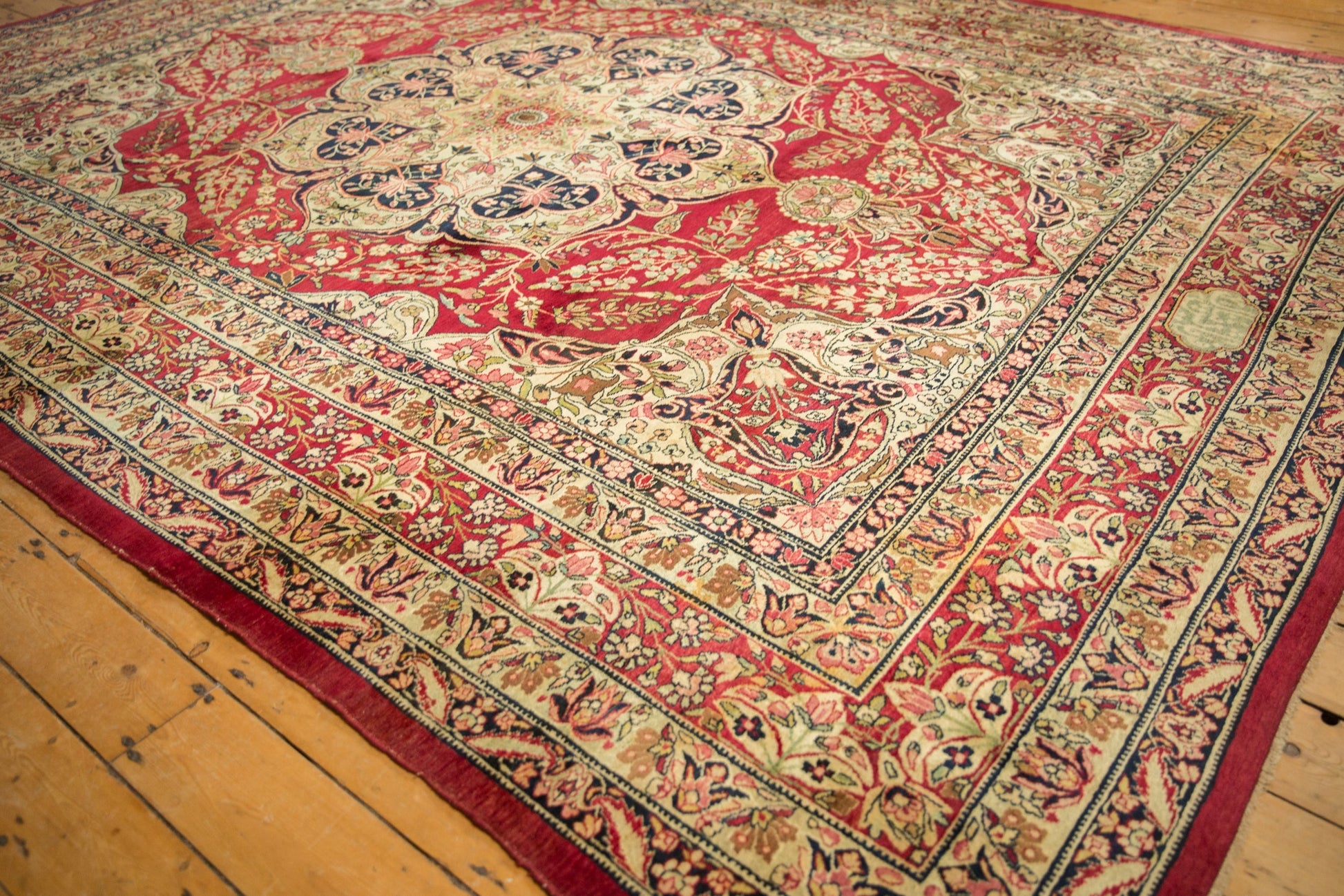:: Starburst center medallion with trefoil contoured floral panels adorned at either end by roundel finials atop a covered field of interconnected floral sprays in cypress tree contour. Main border in a germinating lotus flower design motif. Signature cartouche in the top center of the main border. Elegantly drawn design and detailing in an unusual, closer to original pile height, rug for type and age. Colors and shades include: Cochineal red, antique ivory, navy blue, dusty powder blue, lime green, and more. Condition notes: Areas of pile and knot heads. Most of the original side cord selvages are intact or restored. Fully secured sides and ends. Several localized areas of spot tinting, possibly due in part due to an uneven absorption of the antique wash, and oxidation. Recently professionally cleaned ready for in-home use! Many years of enjoyment to come with this hand knotted Persian Kerman carpet made in Persia circa 1910's vintage. Size measures 9'2" x 12'1".