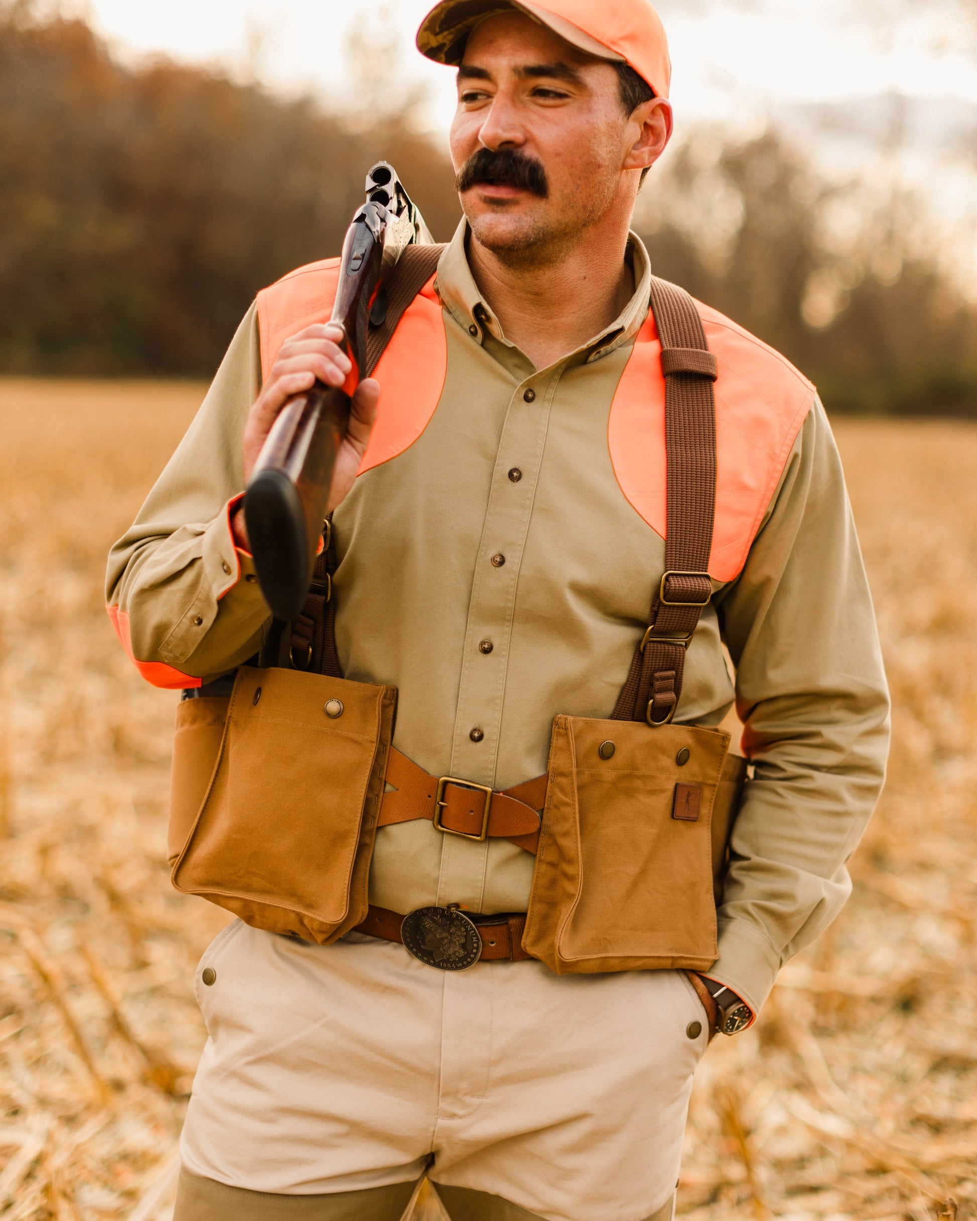 Le gilet à bretelles Ball and Buck est fabriqué à la main à partir de matériaux ultra-premium, y compris notre toile militaire signature de 12,29 oz, une sangle 100 % coton, une maille respirante, et orné de fermetures éclair, boutons-pression et accessoires en laiton massif. Le gilet comprend des poches cachées imperméables YKK derrière les poches avant de la coque drainante, une grande poche amovible fonctionnelle et déperlante pour le gibier, un réservoir d'hydratation intégré avec des points de fixation pour le tube d'hydratation, deux porte-bouteilles/équipement amovibles, des doubles anneaux en D pour appels ou fixation d'outils, et le gilet est ajustable sur les côtés et à l'avant pour un réglage précis de la coupe. Le gilet est disponible en deux tailles et deux versions – l'une axée sur la chasse en plaine et l'autre sur la chasse à la colombe/aux oiseaux d'eau.