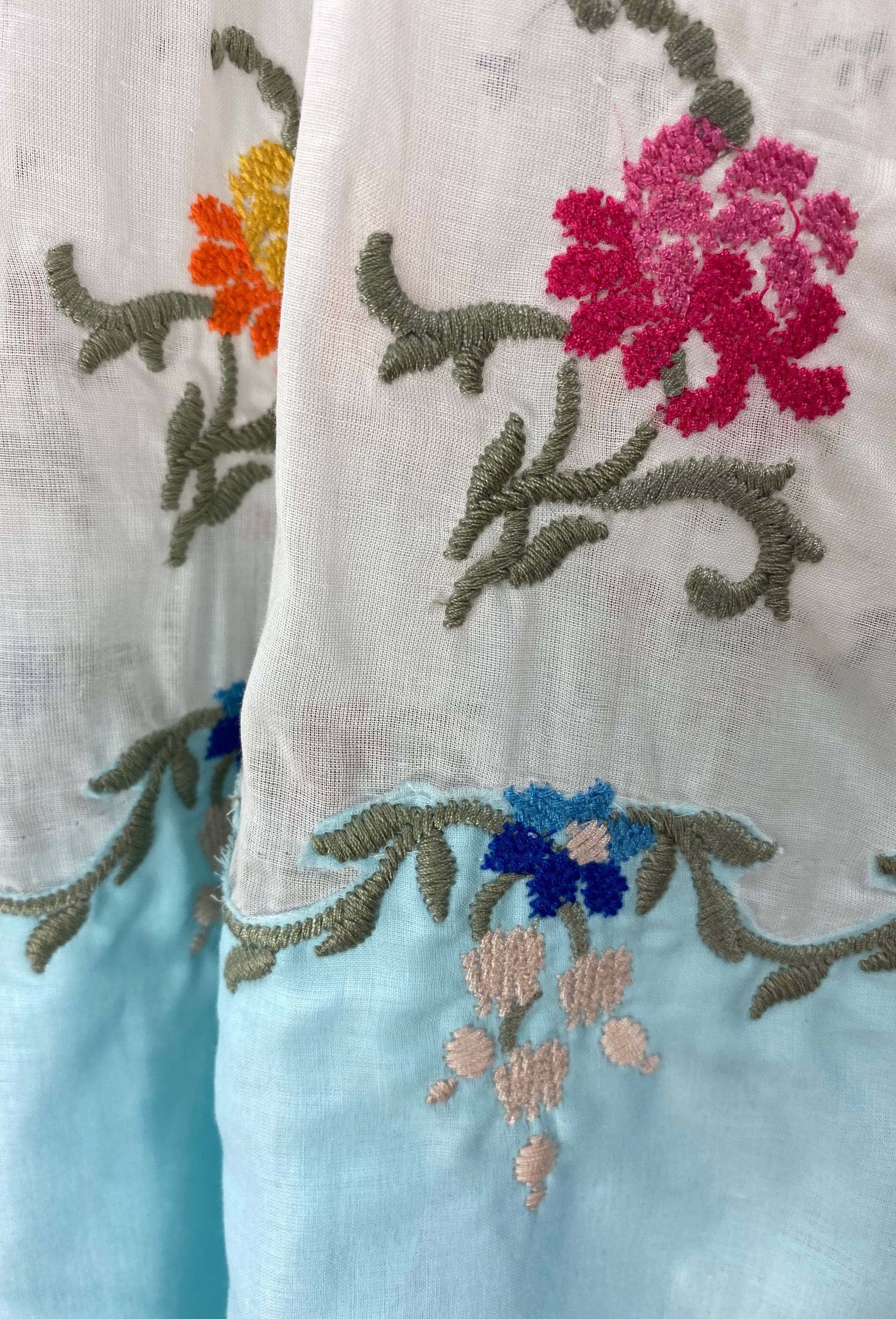 Nous avons découvert l'original lors d'un salon vintage sur le Queen Mary et avons simplement dû le reproduire ! Fabriquée dans le plus fin tissu de mouchoir (100 % voile de coton transparent), notre robe Posey est finement brodée à la main avec un délicat motif floral vintage. Plis complexes sur toute la surface également.