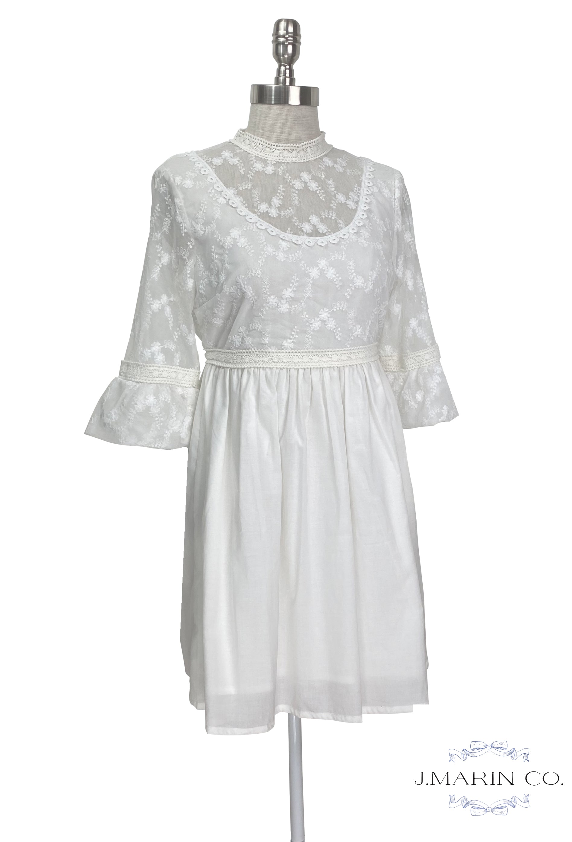 Avec un corsage en dentelle et une taille empire, notre robe présente un col bordé et des manches 3/4 à volants.