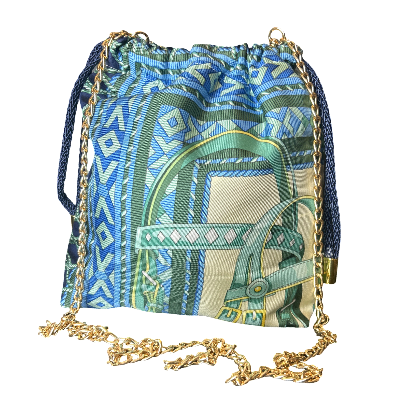 Reimagined from the world’s finest collection of vintage Gucci scarves, our drawstring bag is the ultimate accessory for your on-the-go lifestyle. Uniquely convertible from a crossbody to a handheld bag with both removable goldtone chain and silky drawstring cord.