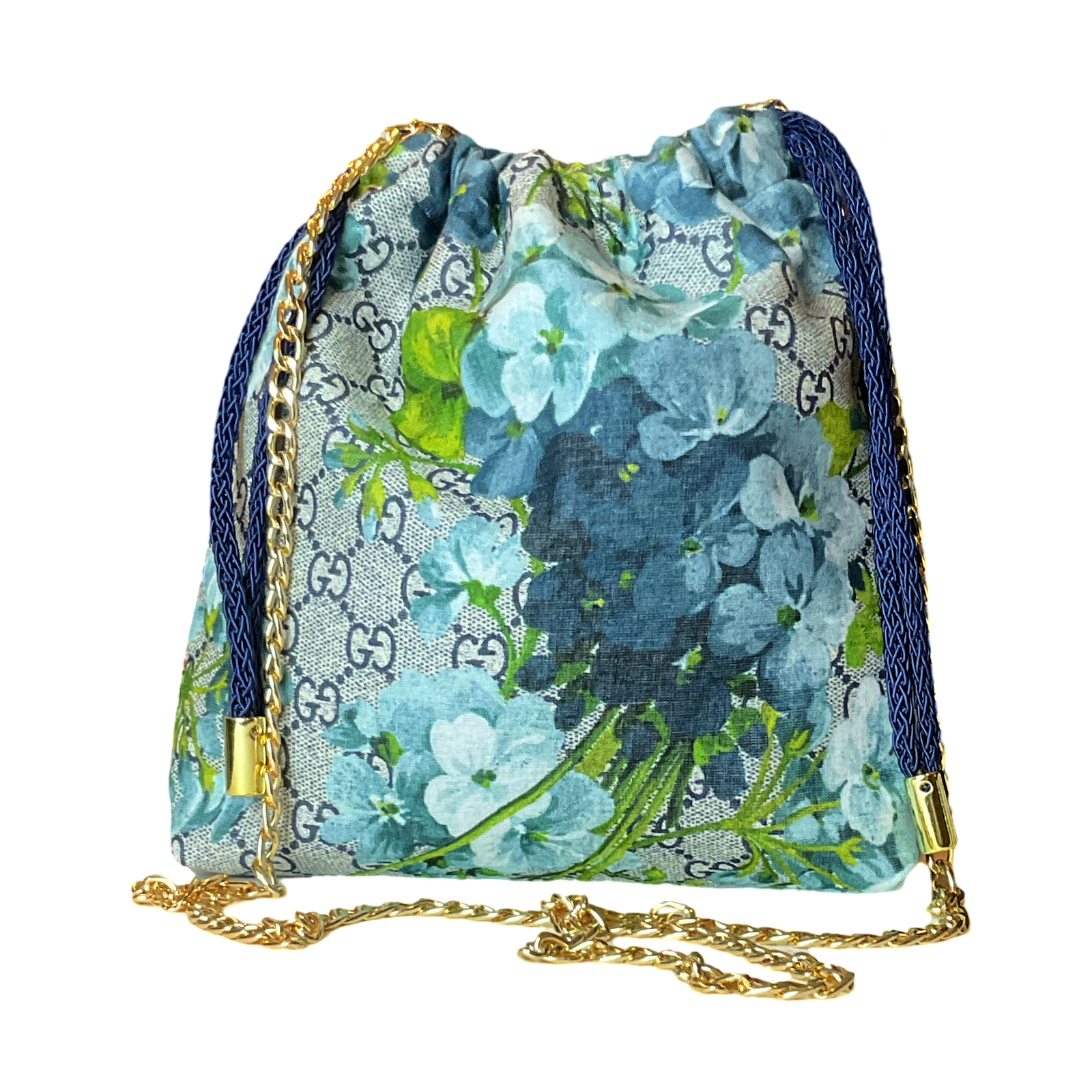Reimagined from the world’s finest collection of vintage Gucci scarves, our drawstring bag is the ultimate accessory for your on-the-go lifestyle. Uniquely convertible from a crossbody to a handheld bag with both removable goldtone chain and silky drawstring cord.