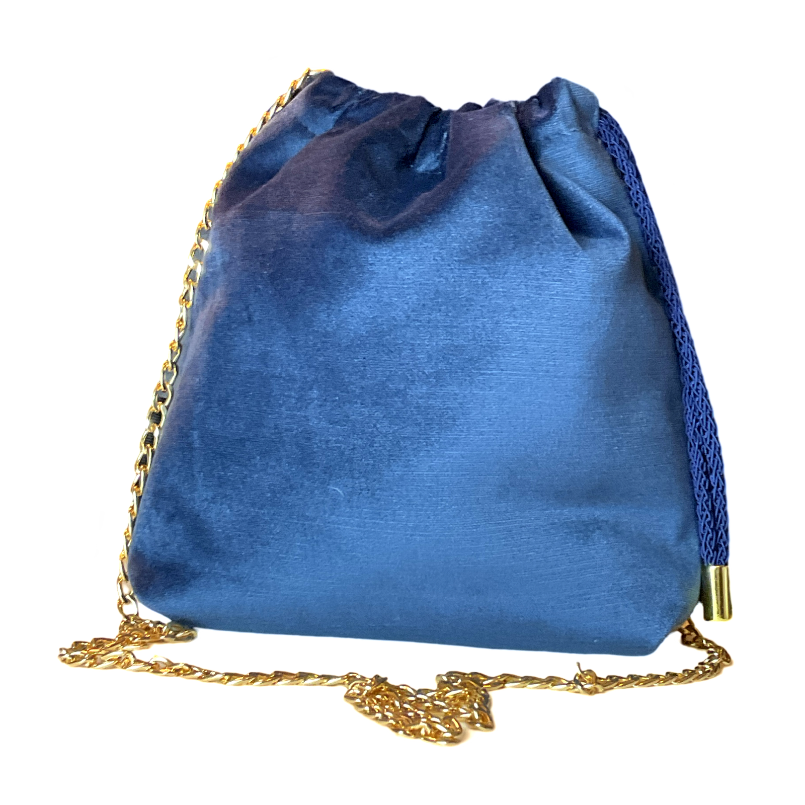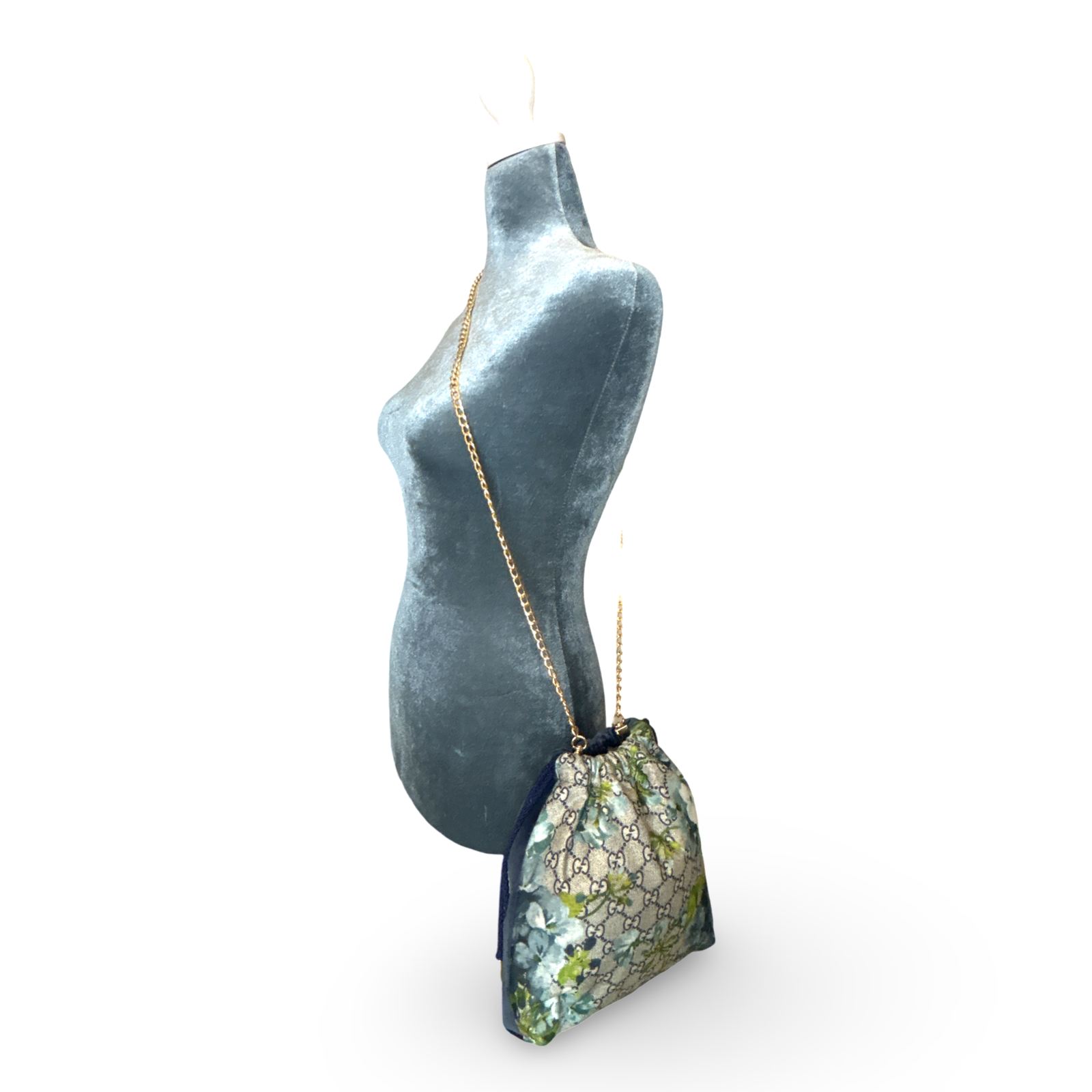 Vintage Gucci GG Logo Blooms Blue silk & modal scarf front paired with coordinating blue velvet reverse. Fully lined with internal pocket, silken drawstring cord closure and removable 23" drop gold-tone crossbody chain.