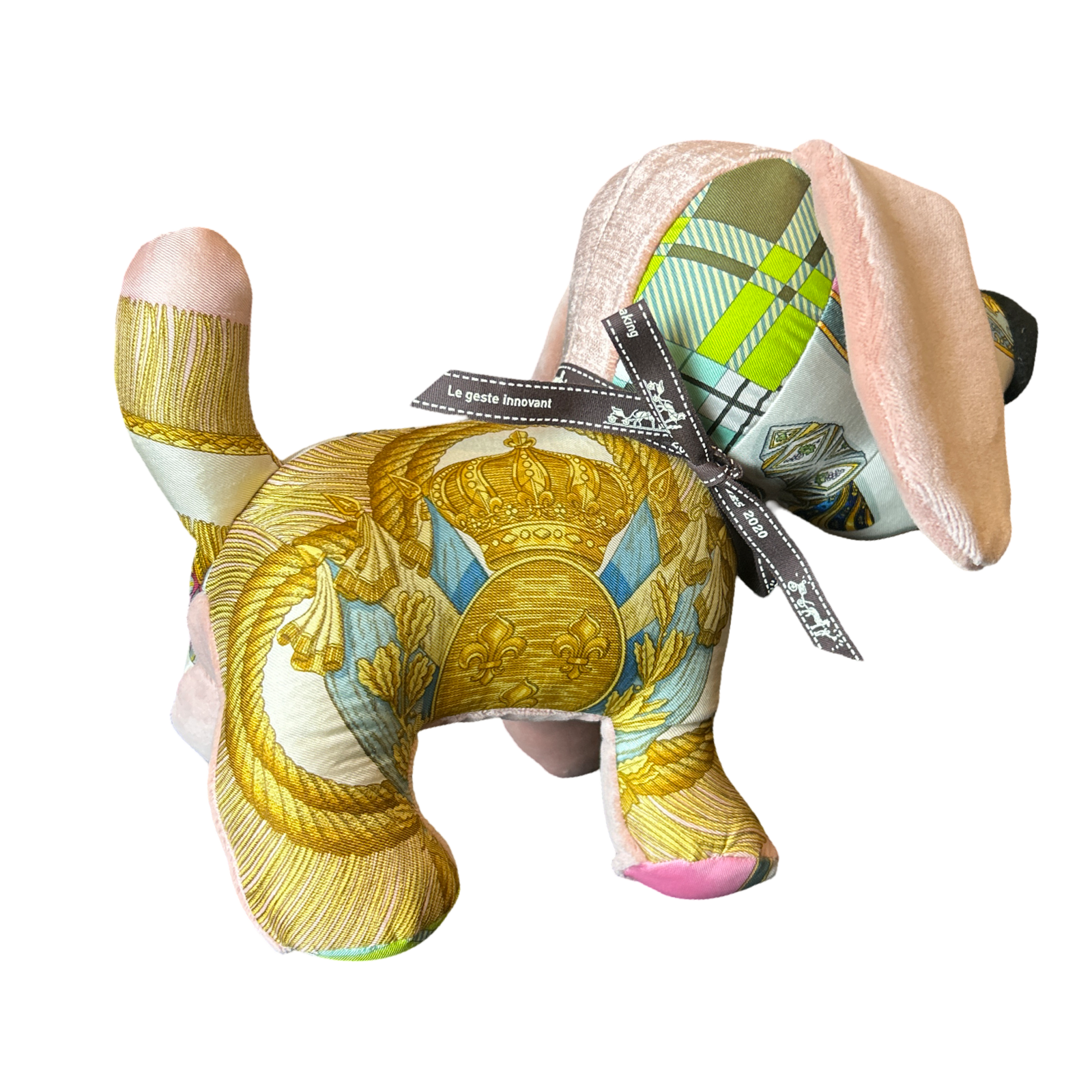 Vintage Hermès Qu'Importe le Flacon and Poste et Cavalerie scarves paired with velvet cloth handmade into a one of a kind animal. Non-Allergenic polyfill stuffing. For decorative use only.