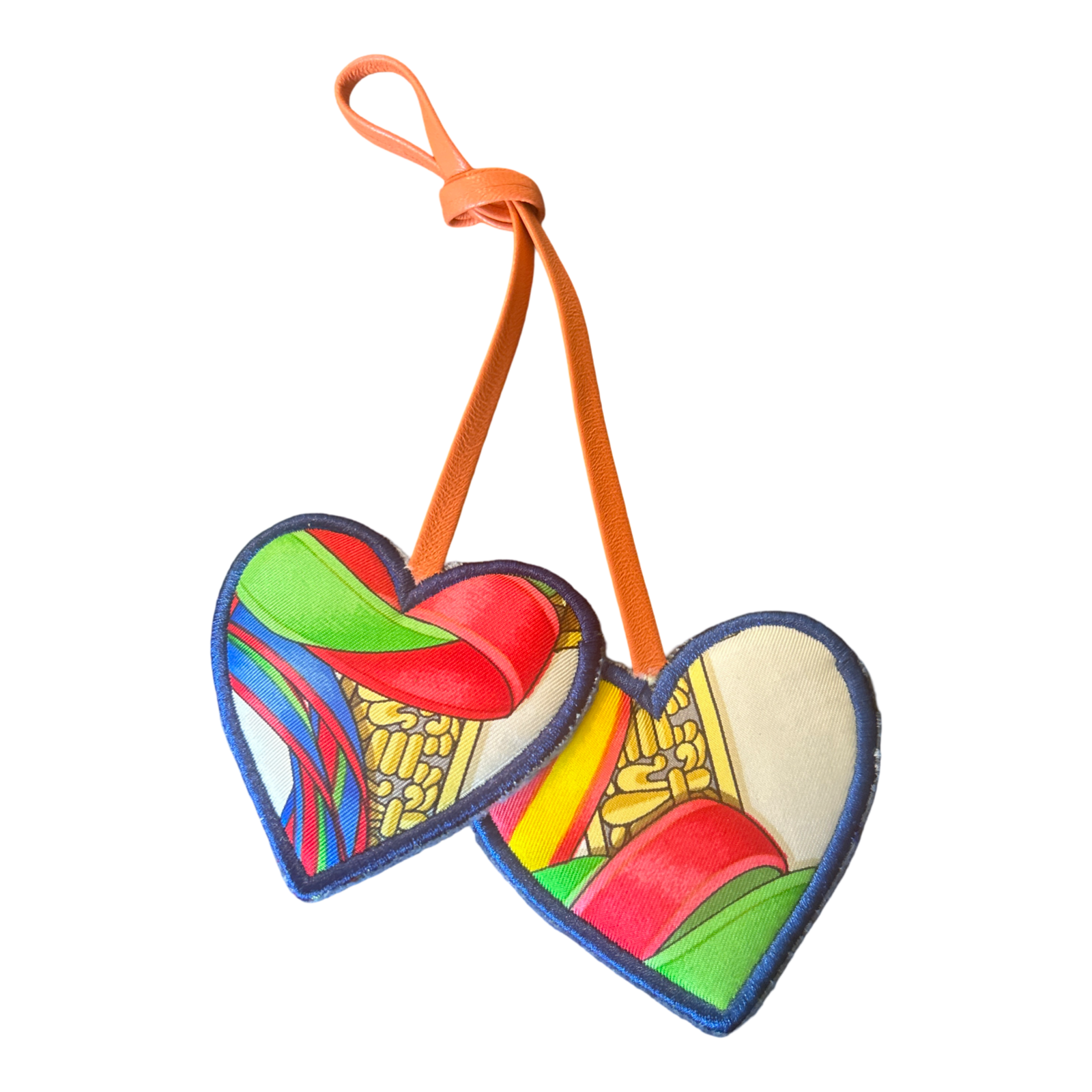 Reimagined from the world’s finest collection of vintage luxury scarves, our exclusive Double Heart Bag Charm is the must-have accessory of the season. Perfectly sized to give your cherished handbag a personalized pop of style.