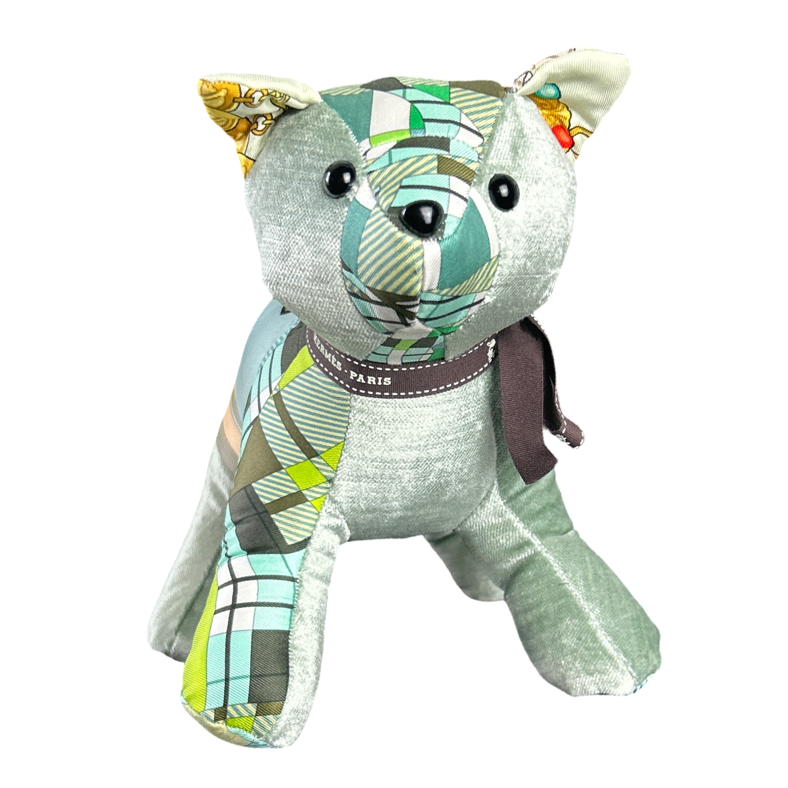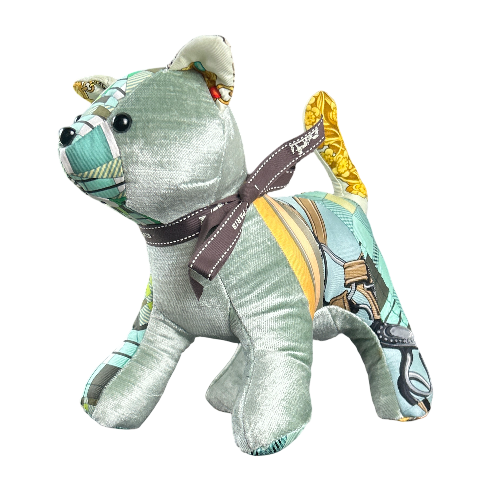 Vintage Hermès Bolduc Ribbon, Kosmima and Ex Libris a Carreaux silk scarves and velvet fabric handmade into a one of a kind animal. Non-Allergenic polyfill stuffing. For decorative use only.