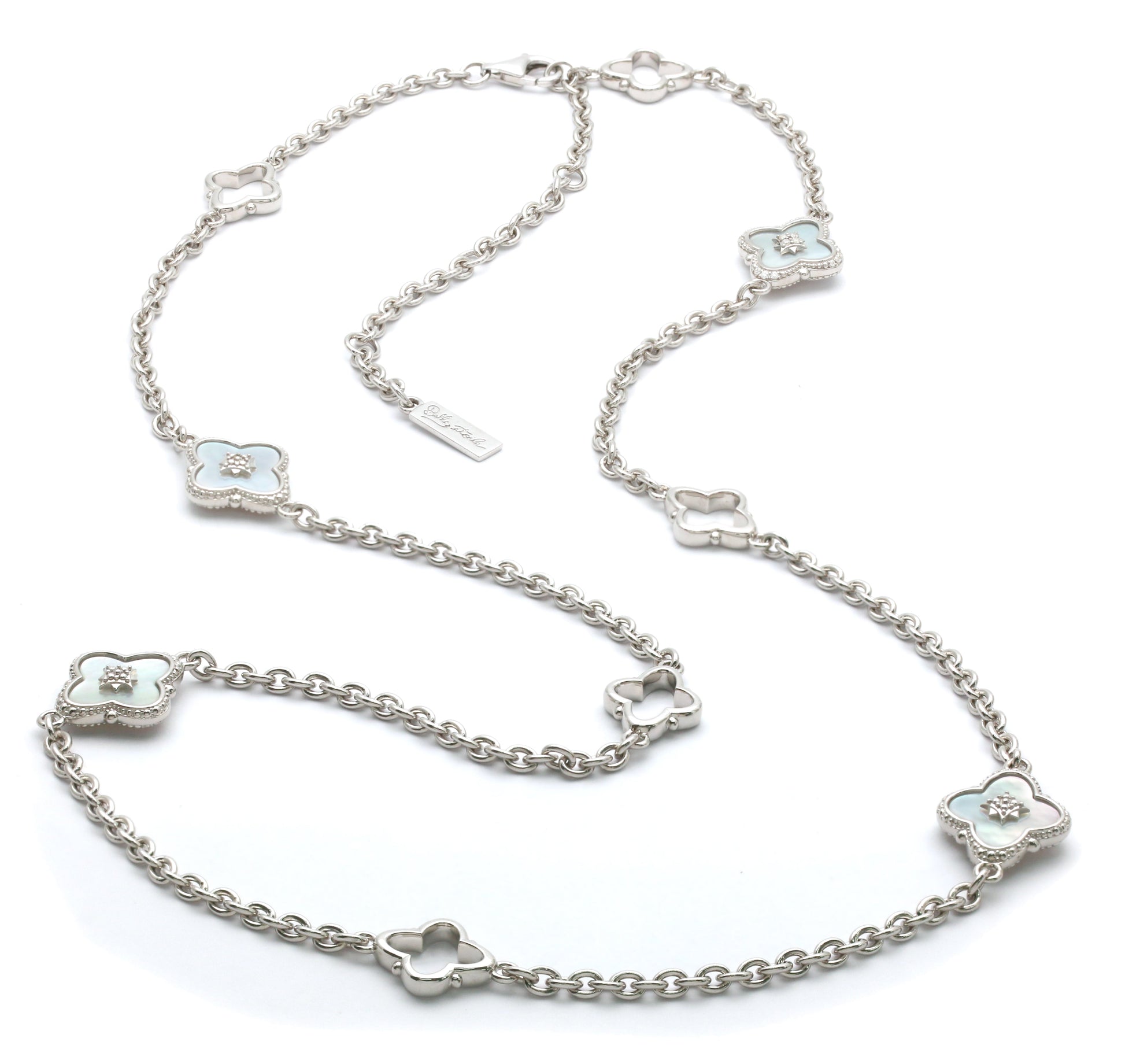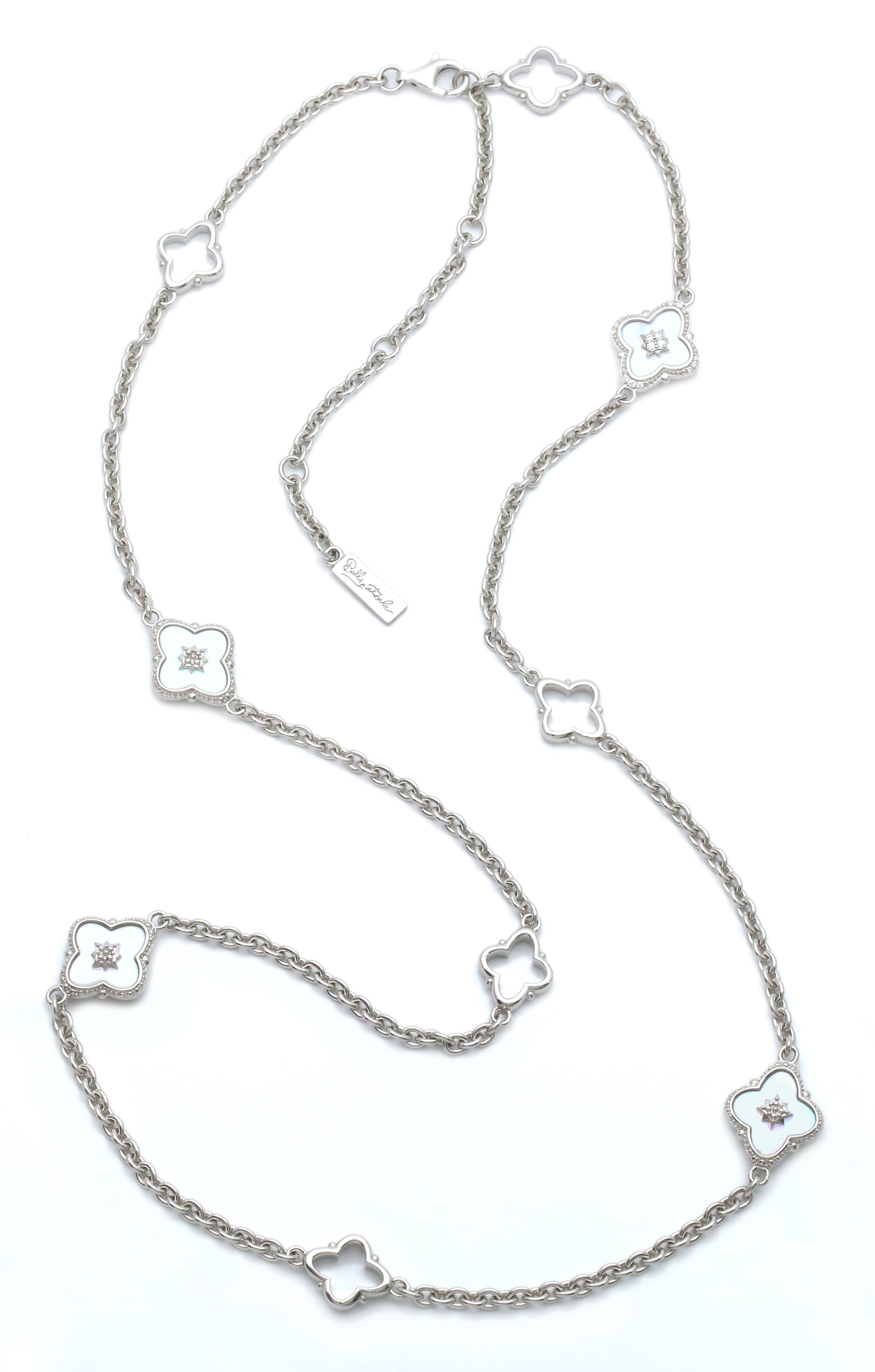 Materialen: Echte witte parelmoer en accentstenen gezet in platina-geplateerd, hypoallergeen sterling zilver