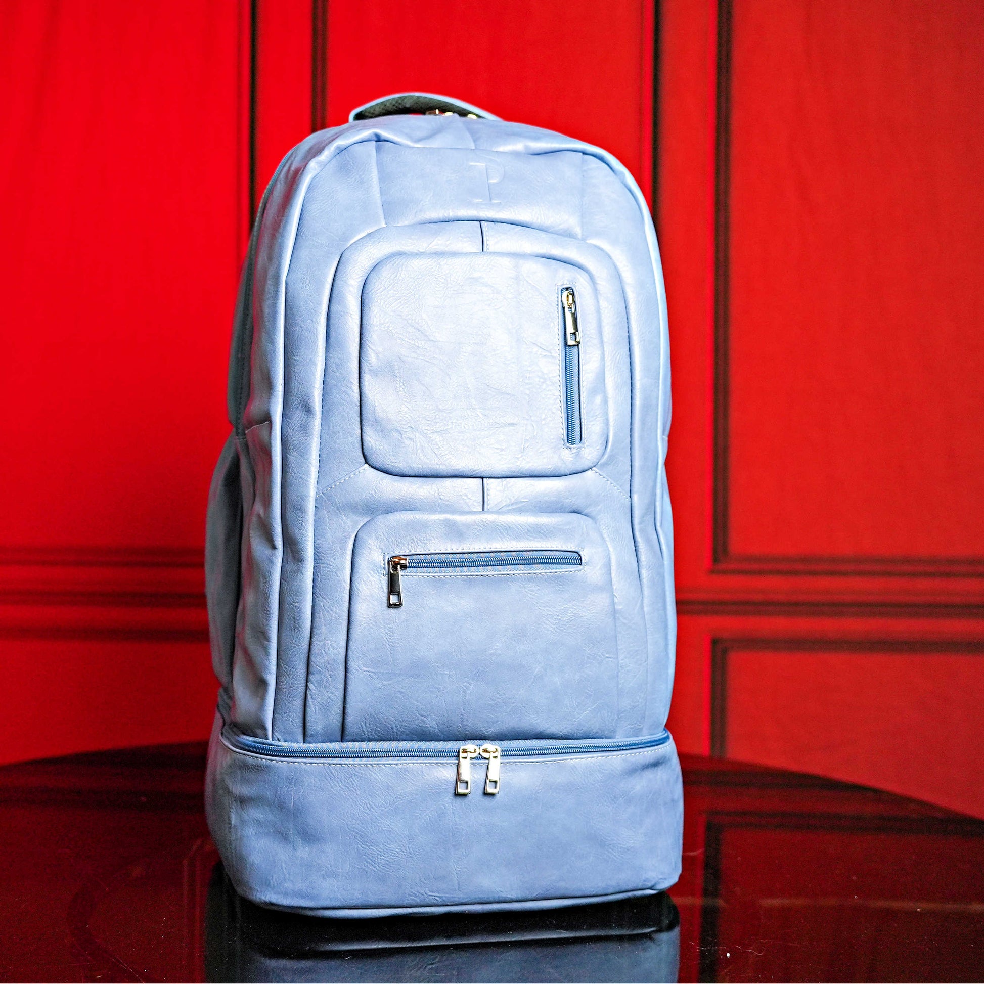Baby blauwe leren gepatenteerde handbagage rugzak