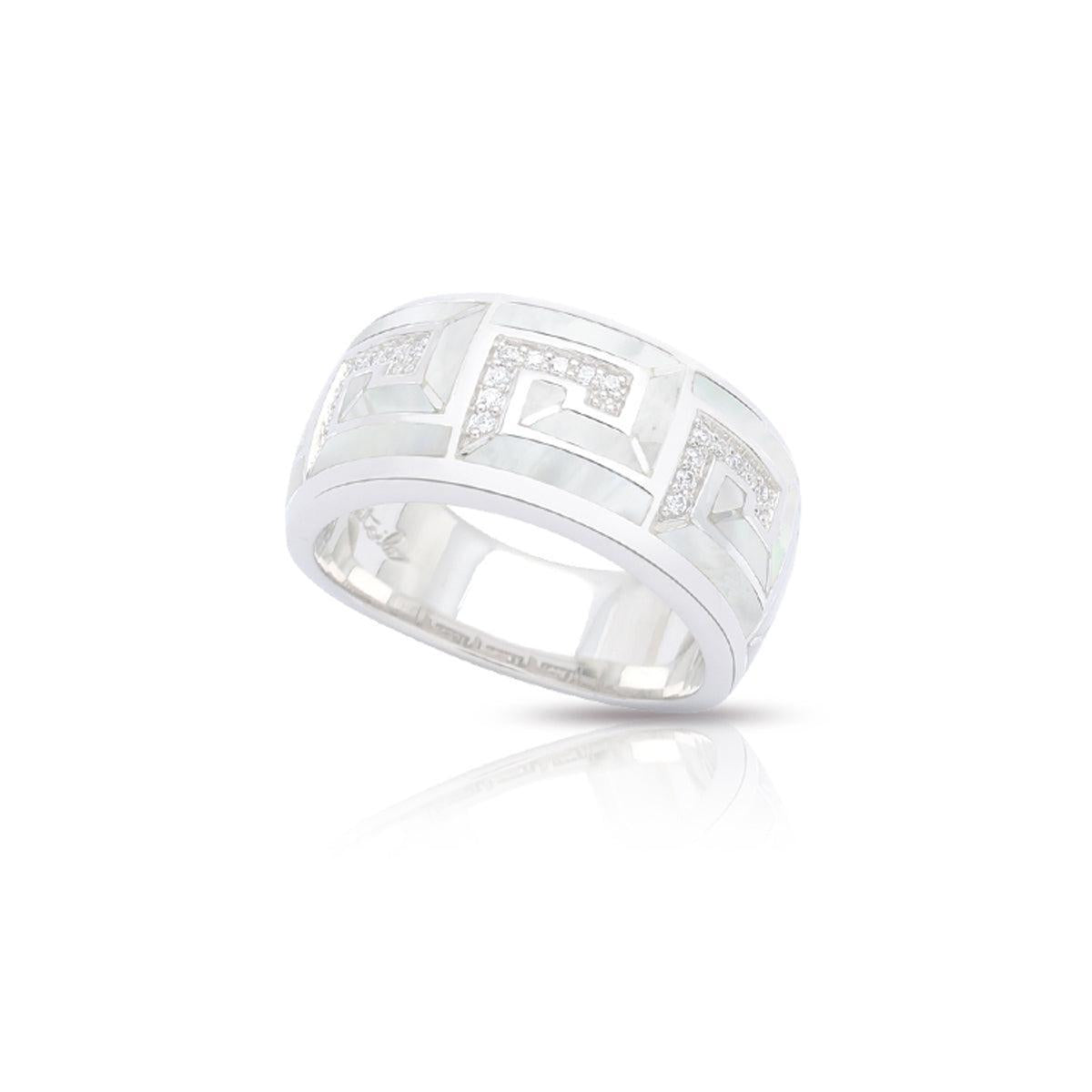 Omfavn det tidløse designet av Gresk nøkkel. Denne Belle Étoile-originalen gir nytt liv til det klassiske mønsteret med gresk nøkkel. Gjennom årene har dette designet symbolisert uendelighet, enhet og livets evige flyt, og bringer velstand og lykke til alle som bærer det. Hver seksjon har håndskåret perlemor satt i spor av platina-belagt sterlingsølv og aksentsteiner. La kreativiteten og lidenskapen din flyte med Gresk nøkkel!