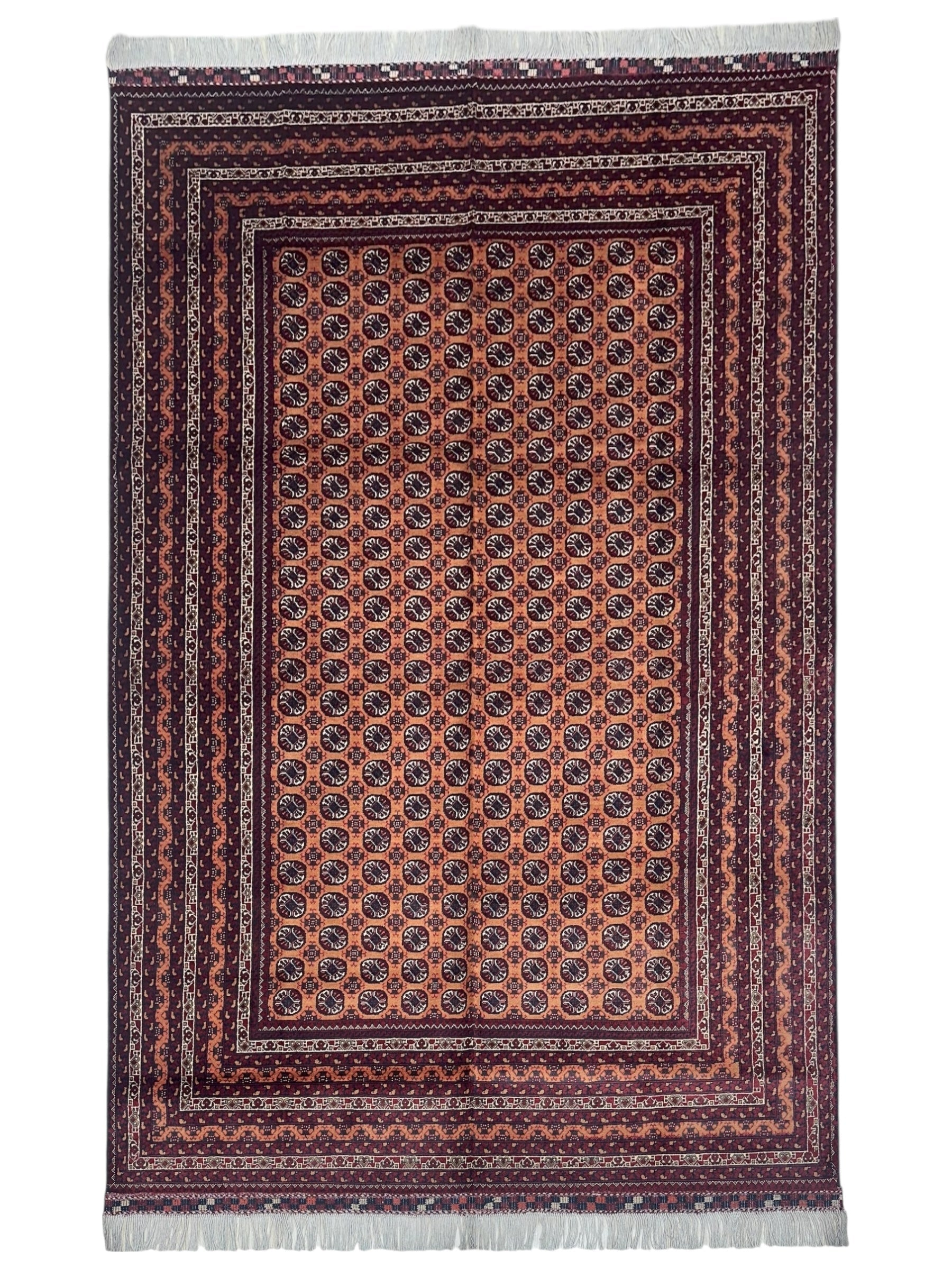 Dette håndknutne mawri-teppet har rike fargetoner og tradisjonell afghansk veving. Laget med høykvalitets ull på en bomullsgrunn, tilbyr det både skjønnhet og holdbarhet. Ideelt for å tilføre karakter og tekstur til inngangspartier, stuer eller kontorer.