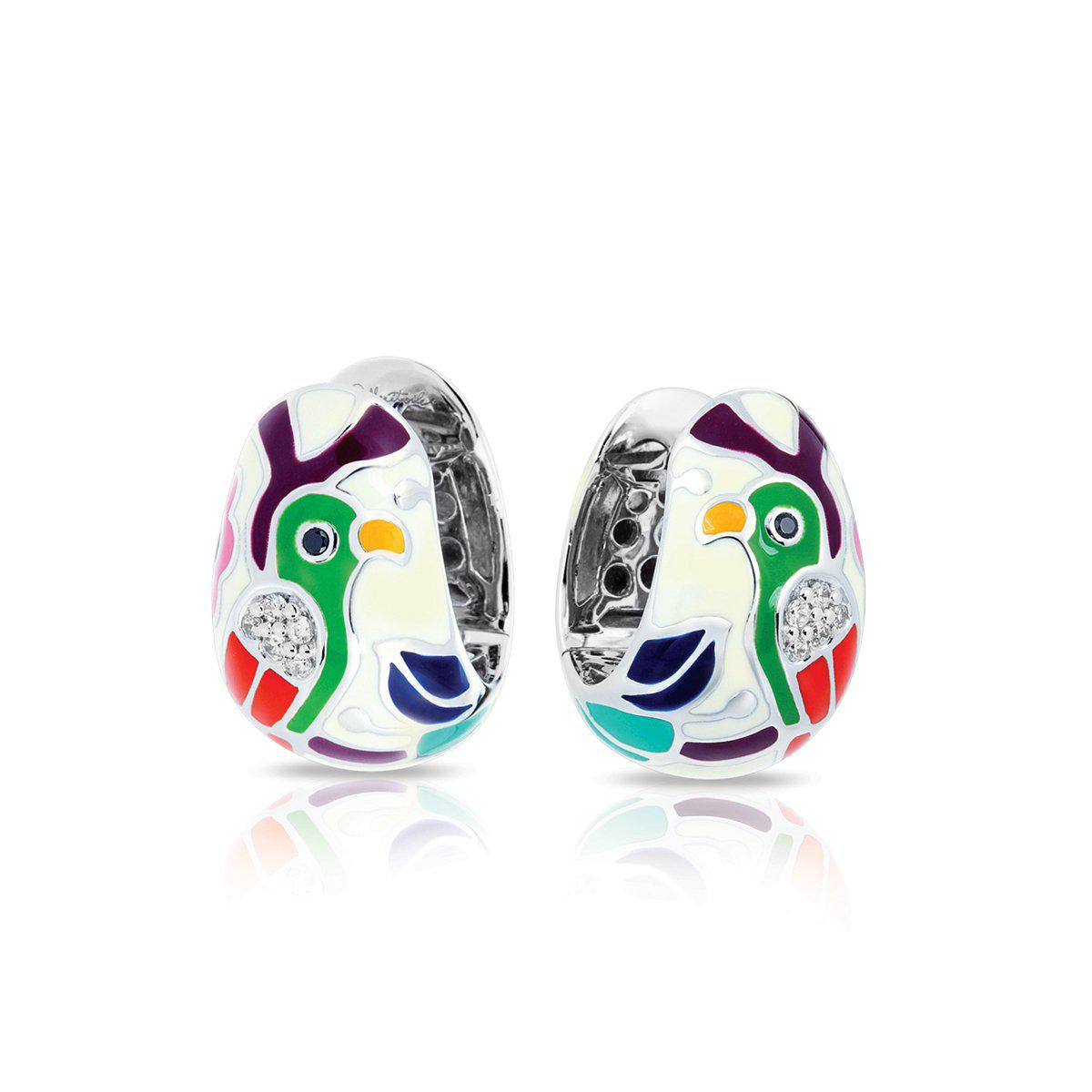 Inspirert av den livlige skjønnheten i villmarken, viser Perroquet-kolleksjonen en juvelbesatt papegøye som sitter blant et praktfullt utvalg av tropisk prakt. Rhodiumbelagt og nikkelfri, er Belle Etoiles design i sterlingsølv pyntet med fint kuttede steiner og håndmalt emalje. Ta tropene hjem med Perroquet.