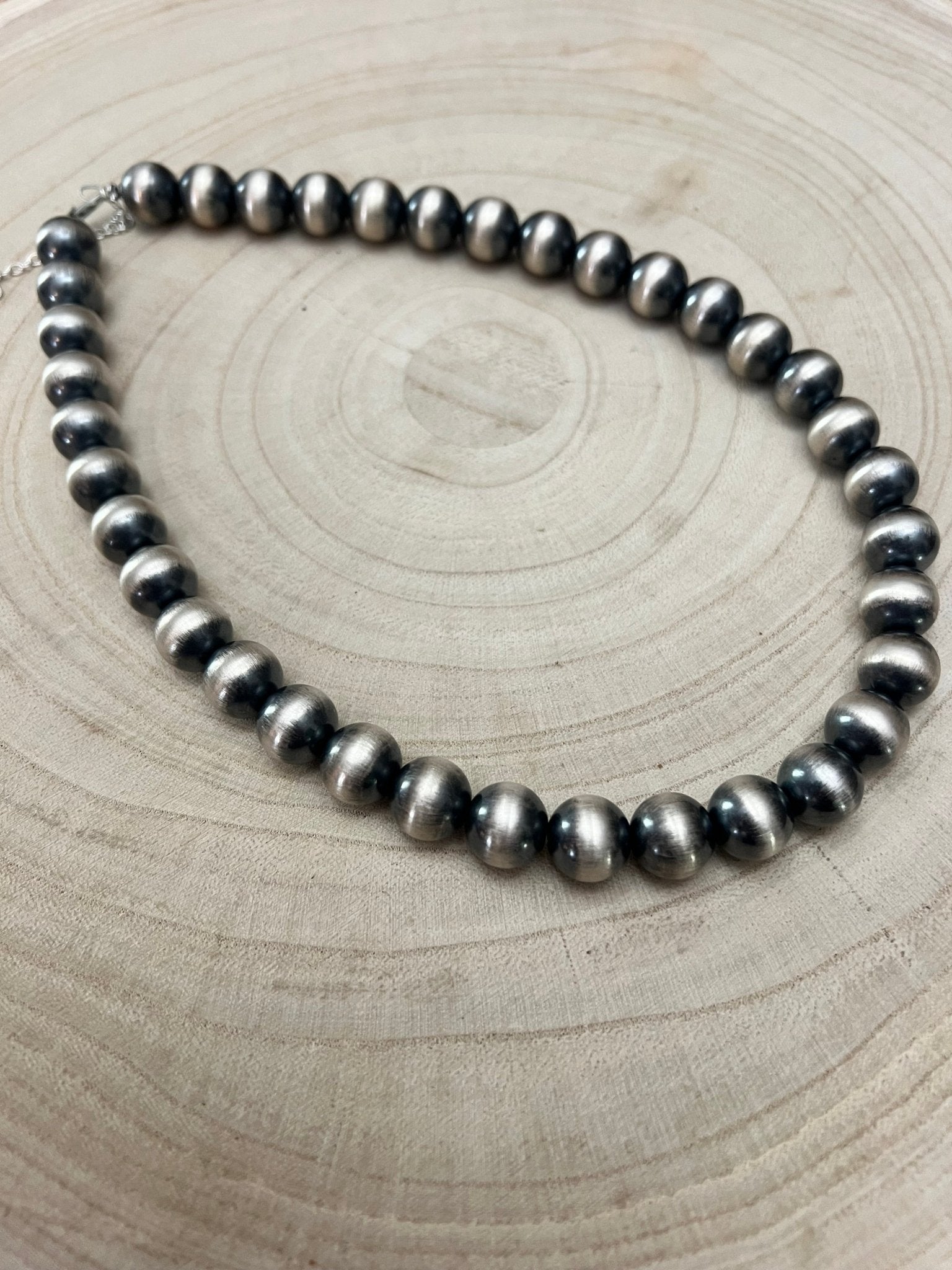 Uzupełnij swoją kolekcję biżuterii tym 18-calowym naszyjnikiem w stylu Navajo Pearl, zawierającym 12mm koraliki ze srebra Sterling oraz 2-calowy łańcuszek przedłużający. Idealny, aby dodać DUŻĄ dawkę swobodnej elegancji do każdej stylizacji, ten naszyjnik to must-have.