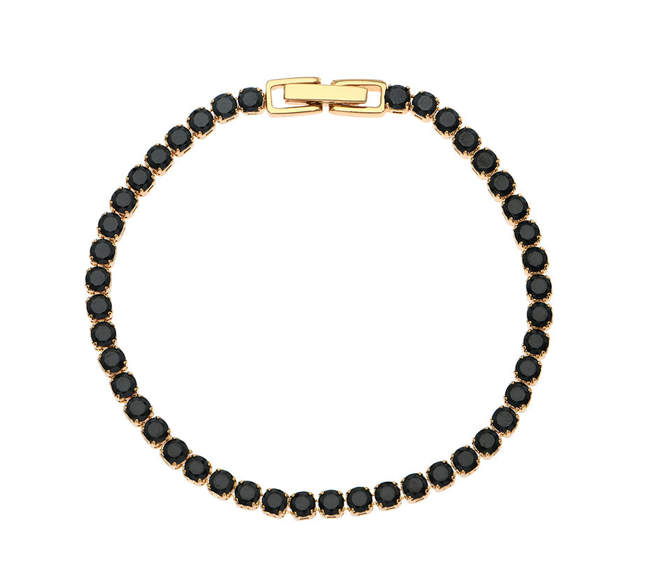 This 7.5" tennis bracelet features a sleek black design and is made with 18k goldfilled material, making it suitable for both men and women. Its sturdy yet stylish design is perfect for everyday wear and adds a touch of elegance to any outfit.