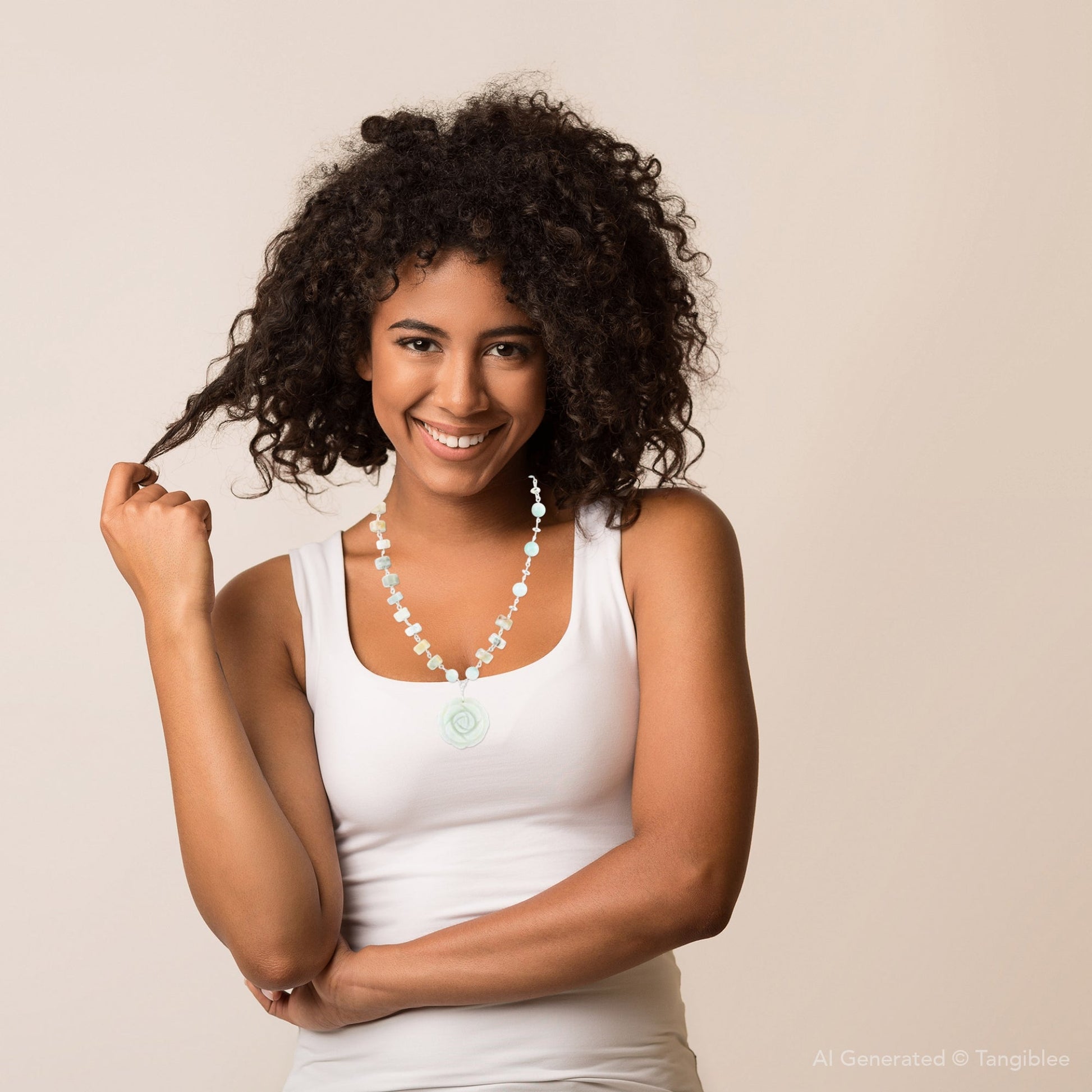 Podkreśl każdą stylizację naszym oszałamiającym naszyjnikiem Blue Amazonite Rosette Sterling! Wykonany z prawdziwego amazonitu i srebra próby sterling, ten ręcznie rzeźbiony wisiorek w kształcie róży jest symbolem elegancji i piękna. Naszyjnik jest regulowany od 16" do 18" z 2" przedłużką, dzięki czemu idealnie pasuje do każdego dekoltu. Czuj się pewnie i promiennie, nosząc ten wisiorek o wymiarach 1,5" x 1,5". Naszyjnik waży 47 gramów.