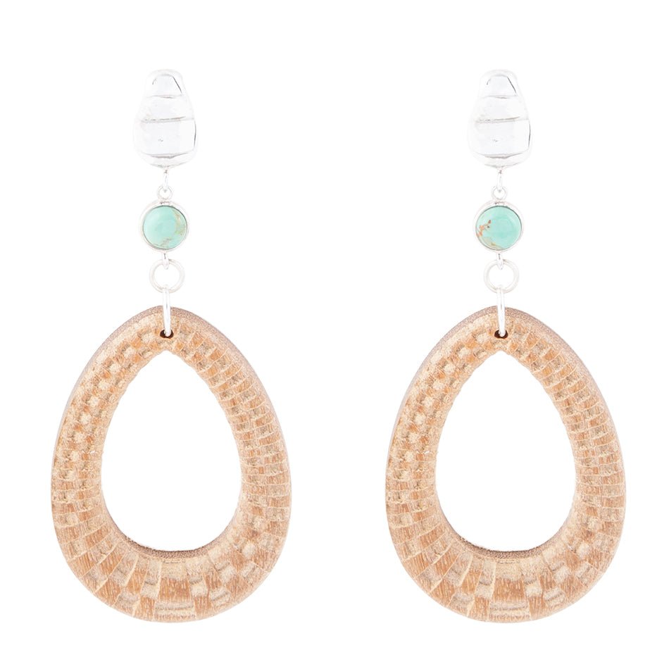 Niebieskie Turkusowe kolczyki z drewna rzeźbionego, srebro sterling