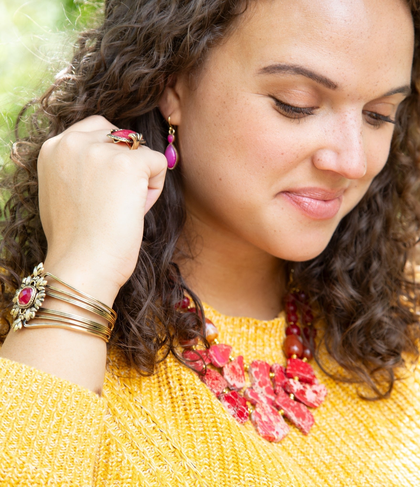 Ozdób się tym wykwintnym mankietem z bordowego kwarcu i ozdobnej brązowej bransoletki! Wykonany i wykończony ręcznie, ten element zawiera oszałamiający fasetowany bordowy kwarc o wymiarach 0,5" x 0,5" oraz piękny złocisty kolor brązu. Jego długość 1,75" jest regulowana, aby pasować do większości nadgarstków. Rozkoszuj się tym unikalnym, ozdobnym wzorem, który emanuje czerwonym i złotym odcieniem. 💎💛