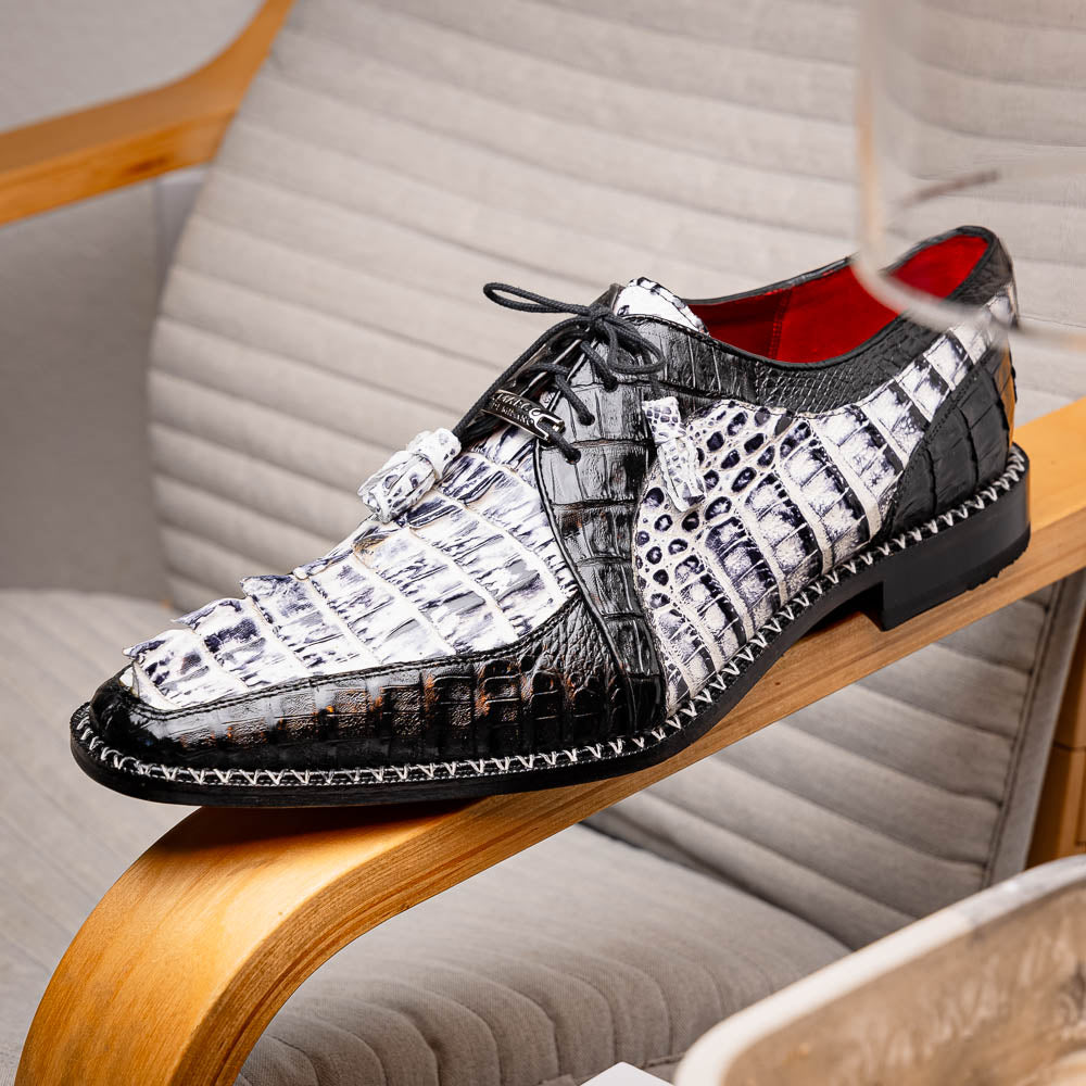 The CARIBE is our stunning genuine hornback caiman crocodile dress derby's featuring a 3D crocodile scale toe box, tasseled laces, stitched outsole, and a polished hand finish that makes the crocodile texture pop. Dress these up with your favorite jeans or slacks for an out-of-this-world look.