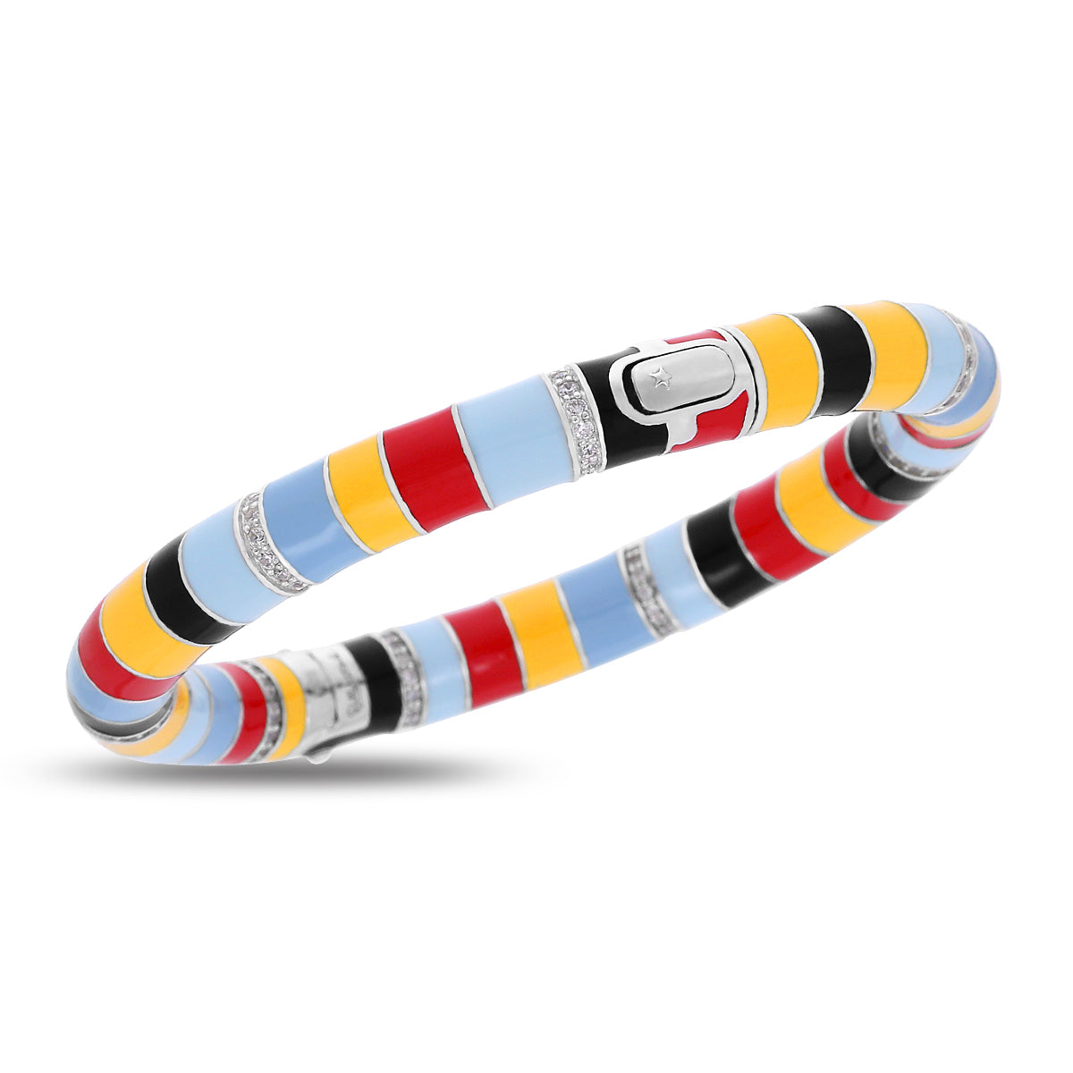 Opis: Ręcznie malowana, wielokolorowa włoska emalia z kamieniami osadzonymi w pavé, osadzona w rodowanym, wolnym od niklu, srebrze próby 925.