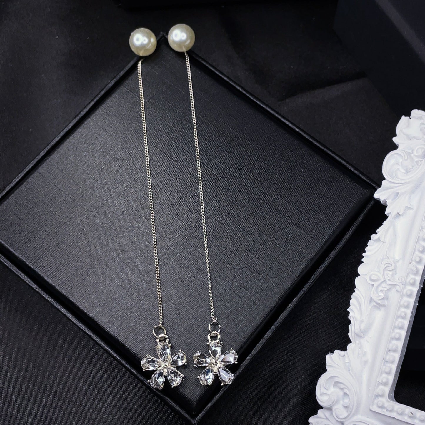 Kolczyki przewlekane z kryształowym kwiatem i perłowymi sztyftami