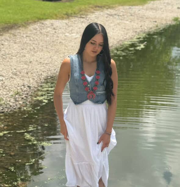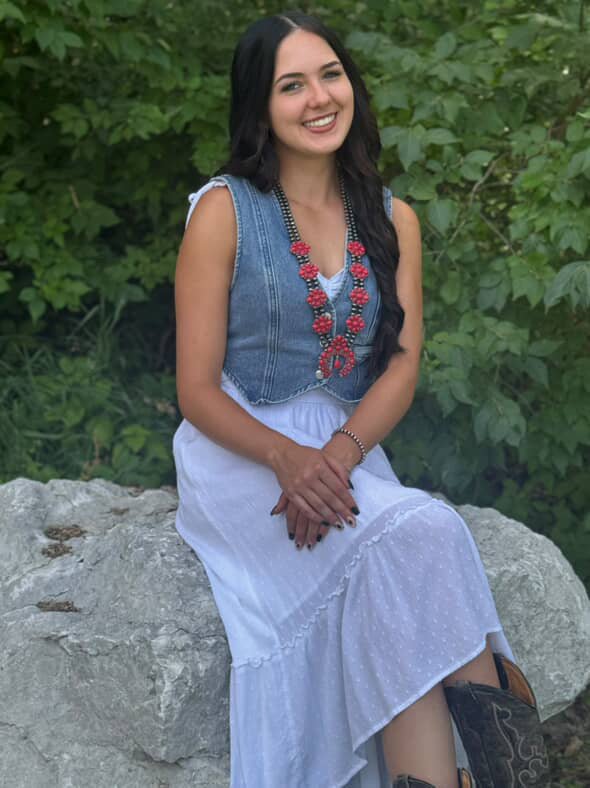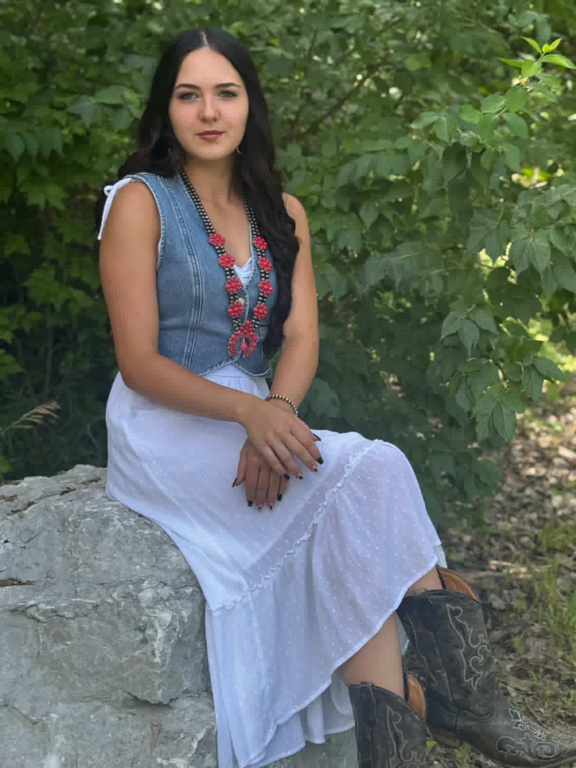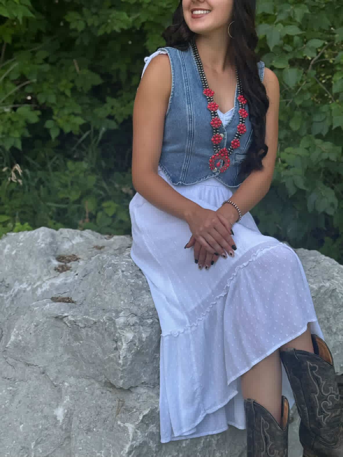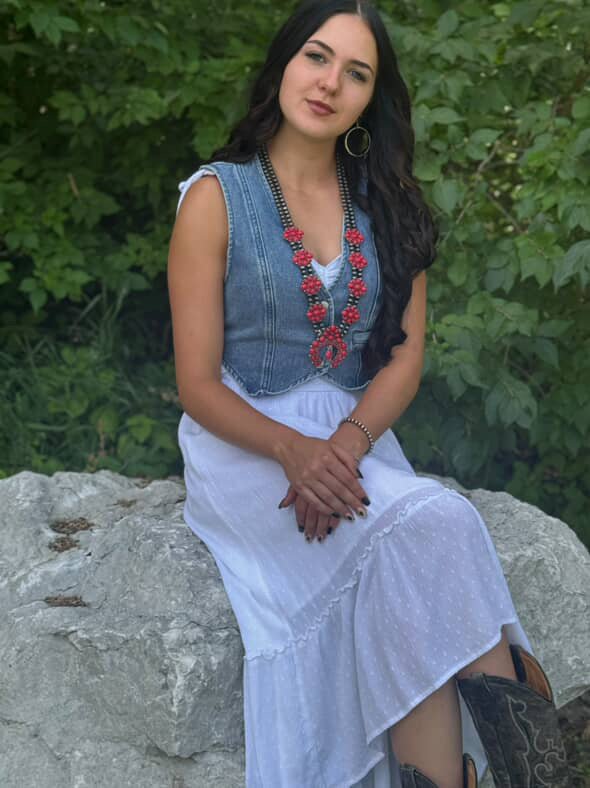 Podkreśl swój zachodni styl dzięki temu naszyjnikowi Faux Coral Long Squash Blossom. Mierzący 32 cale, zawiera klasyczne elementy wzoru squash blossom połączone z żywymi akcentami z sztucznej koralowej biżuterii, oddając ducha biżuterii południowo-zachodniej.