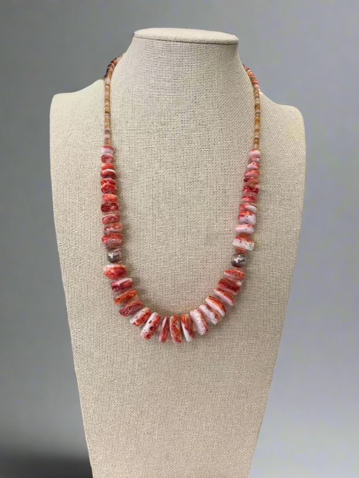 Dzięki żywym pomarańczowym koralikom z kolczastej ostrygi i turkusowym koralikom ułożonym w stopniowany wzór, ten 22-calowy naszyjnik dodaje odważnego akcentu w stylu western do każdej stylizacji.