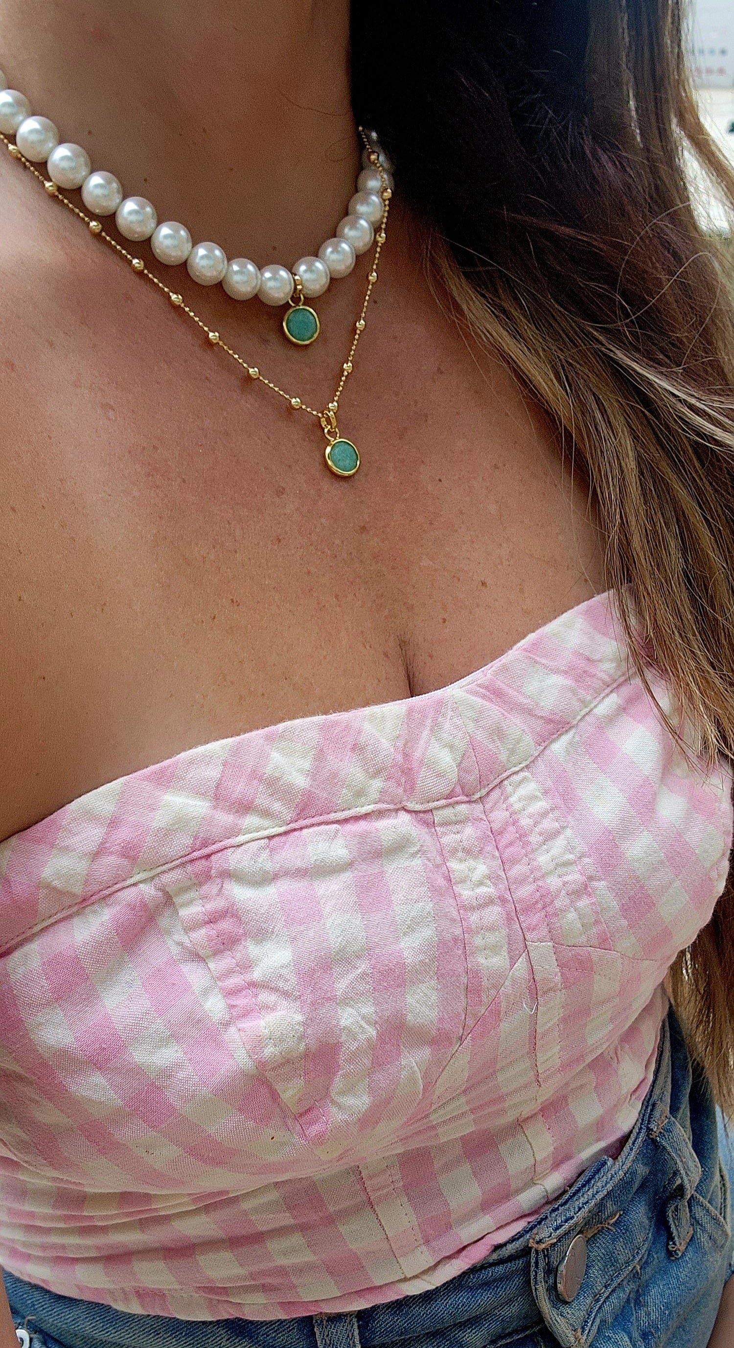 Elevate your style with this sophisticated 16" pearl necklace featuring a 2" extension for versatile wear. Crafted from hypoallergenic 925 sterling silver and dipped in 14k gold, it offers both luxury and comfort. The bold amazonite charm adds a vibrant, playful touch, making this piece a stunning statement accessory for any occasion.