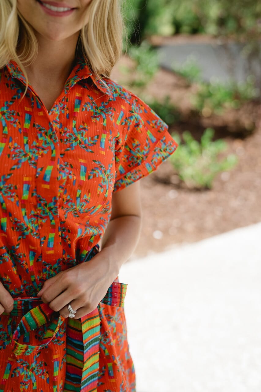 Przygotuj się na prawdziwe tropikalne wibracje z naszym topem Joanna! W intensywnym pomarańczowym kolorze i z zabawnym nadrukiem palm, ten top rozświetli każdą stylizację. Falbaniaste rękawy i ukryte guziki z przodu dodają kobiecości, a kołnierzyk utrzymuje całość w eleganckim stylu. Idealny na wesoły dzień na mieście!