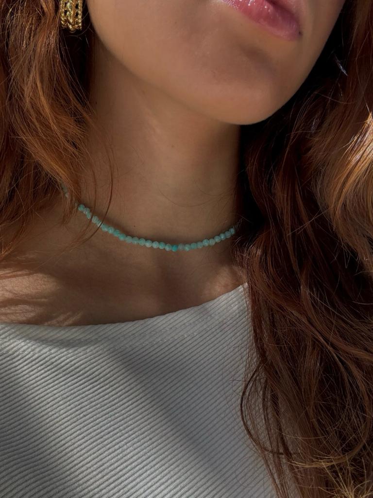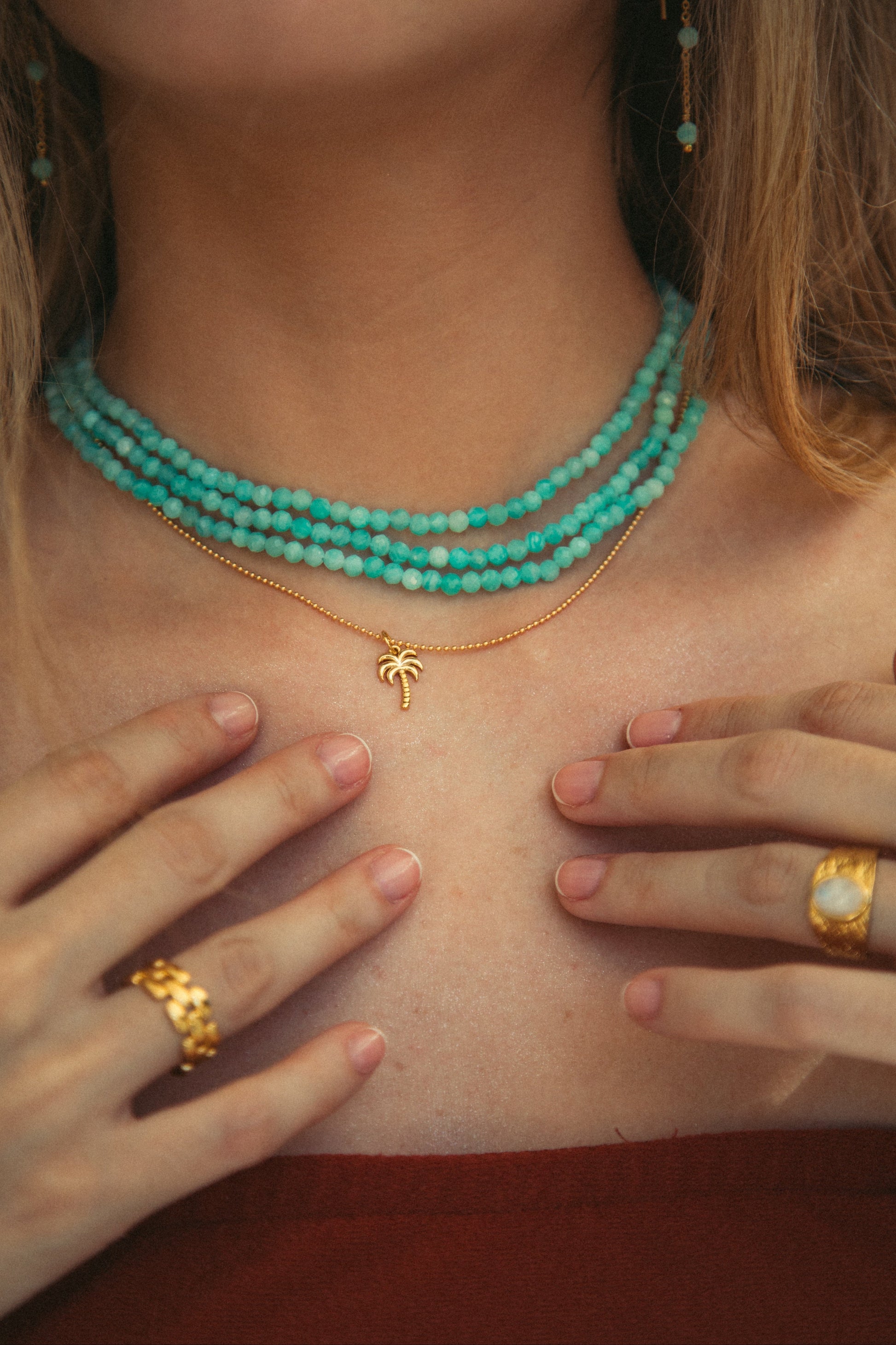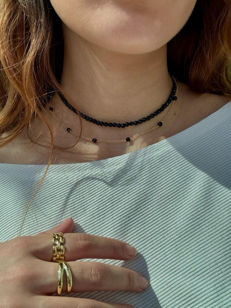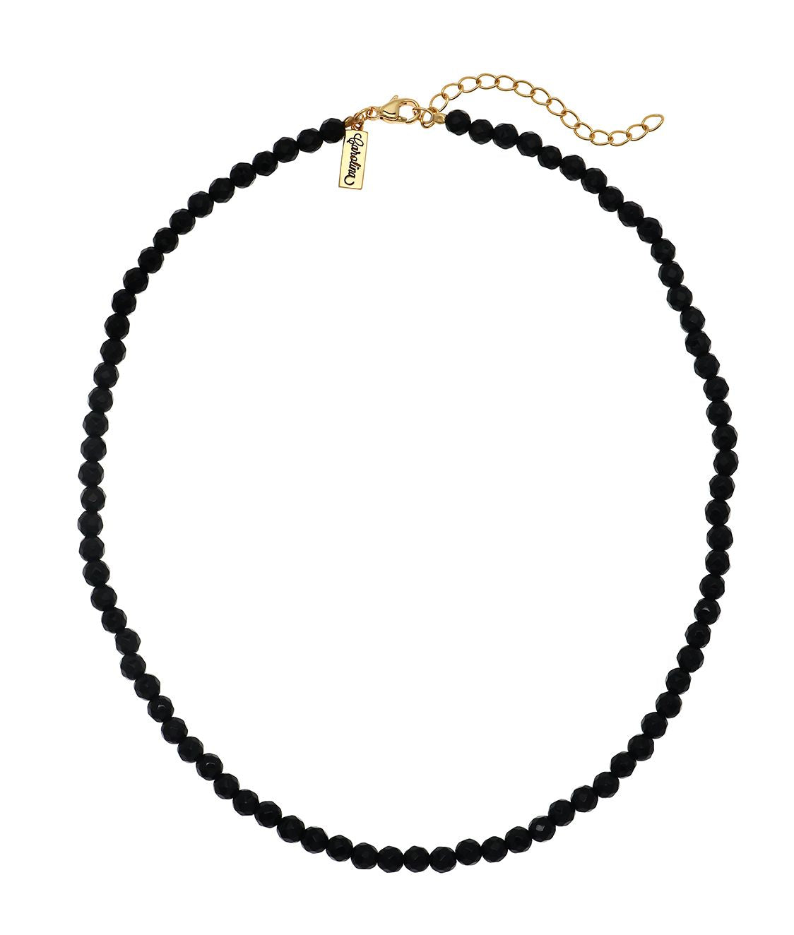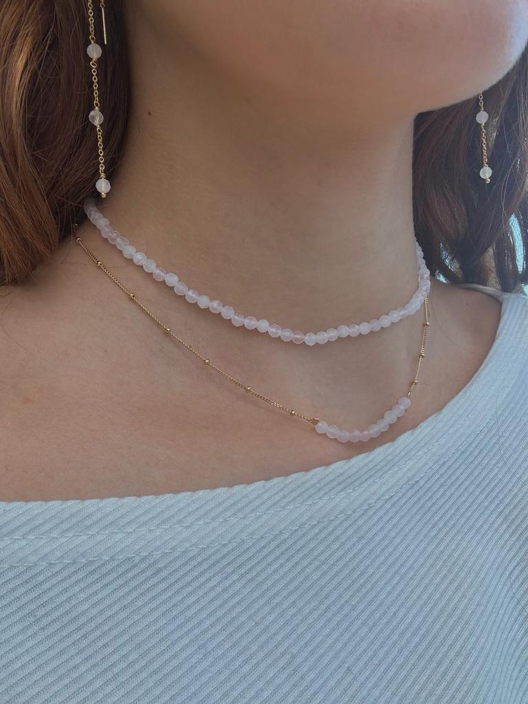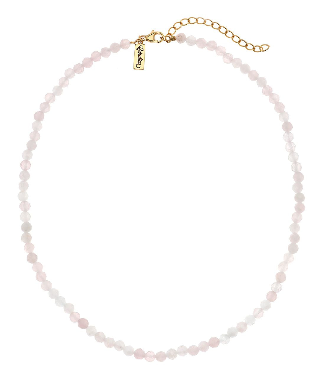 This KATALINA CHOKER is an exquisite accessory crafted from 14" of natural stones (rose quartz, amazonite and black onyx) and 18k goldfilled. Its adjustable 2" extension provides a personalized fit for any neck size. The classic, timeless design adds an effortless touch of glamour to your look.