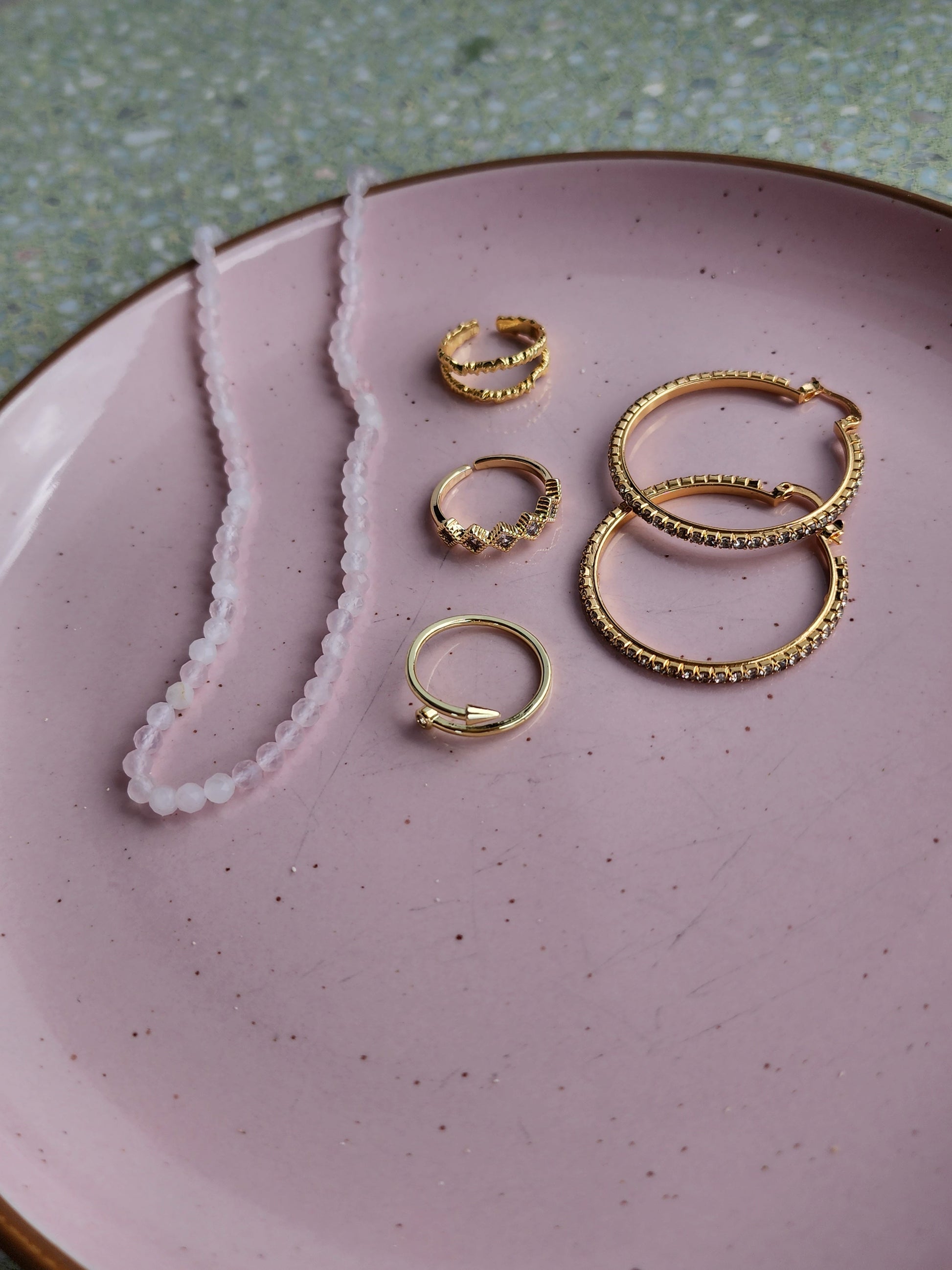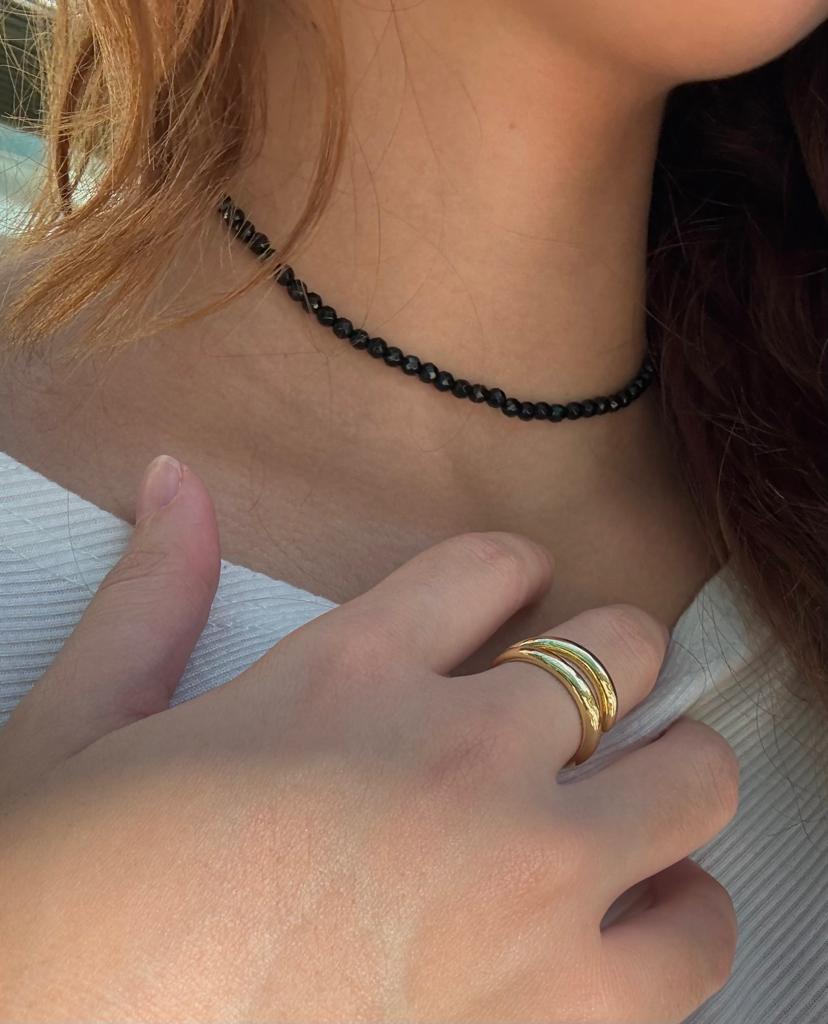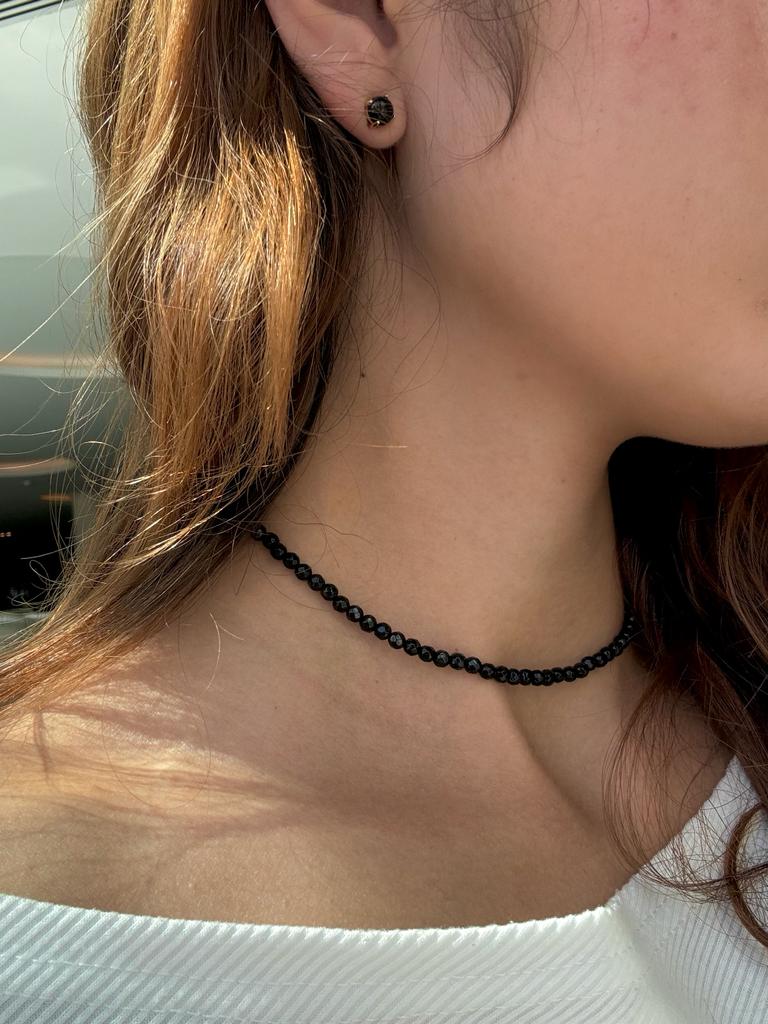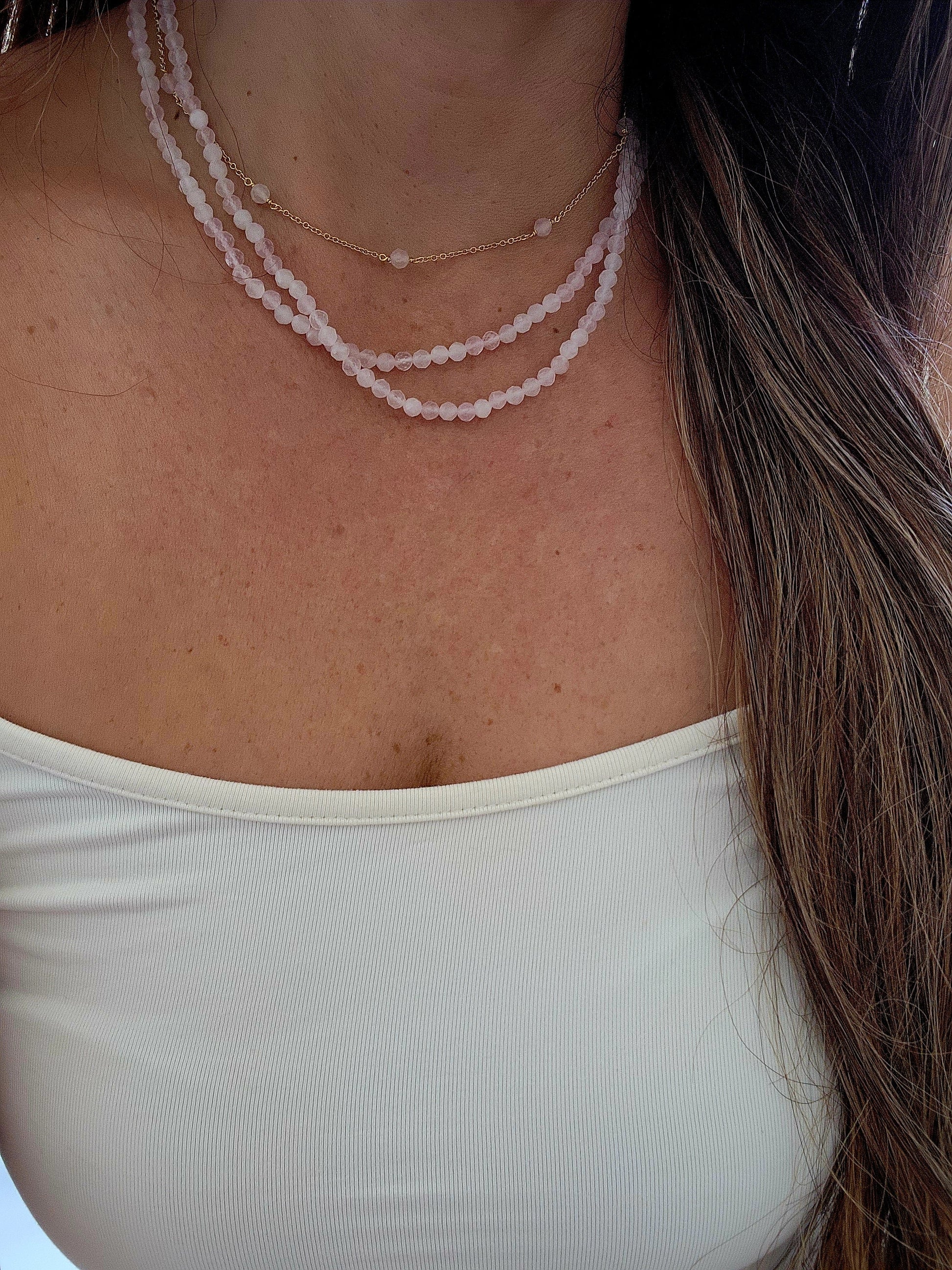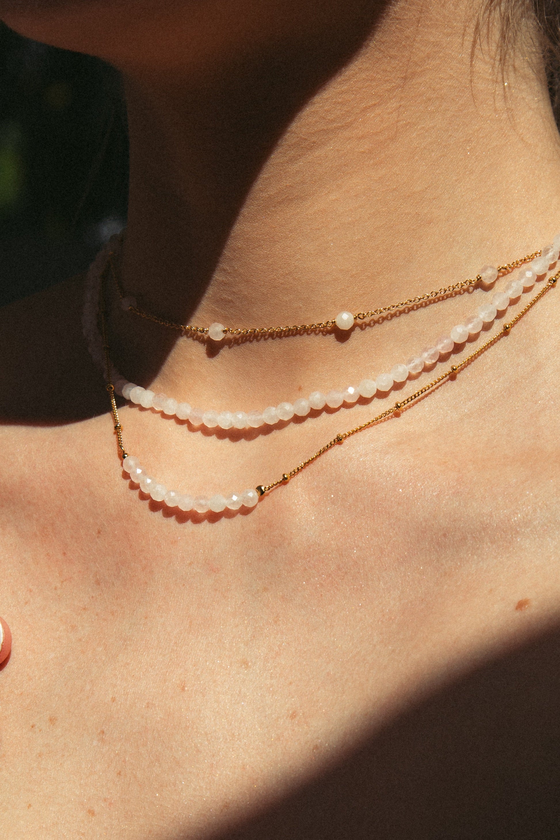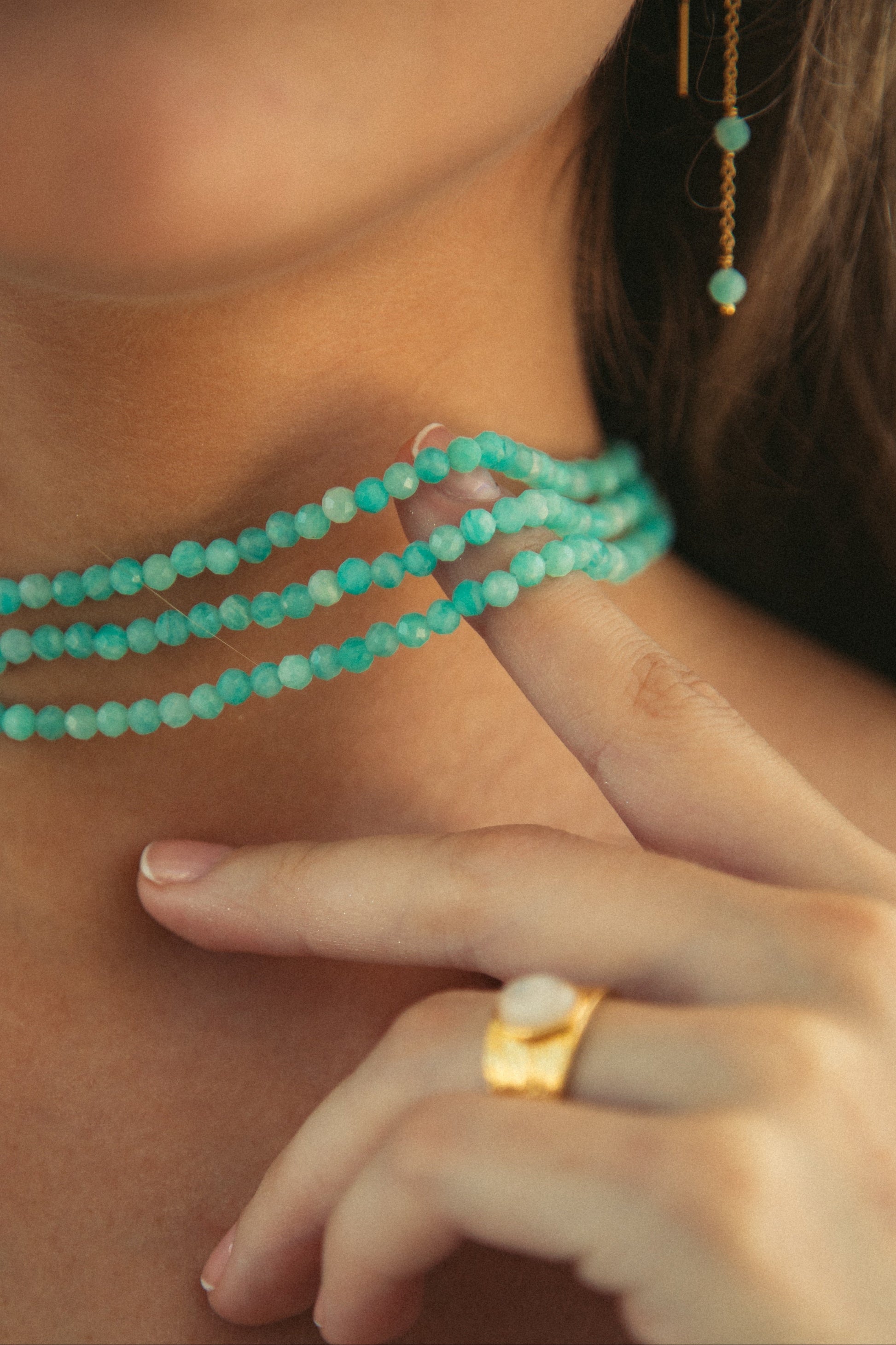 This KATALINA CHOKER is an exquisite accessory crafted from 14" of natural stones (rose quartz, amazonite and black onyx) and 18k goldfilled. Its adjustable 2" extension provides a personalized fit for any neck size. The classic, timeless design adds an effortless touch of glamour to your look.