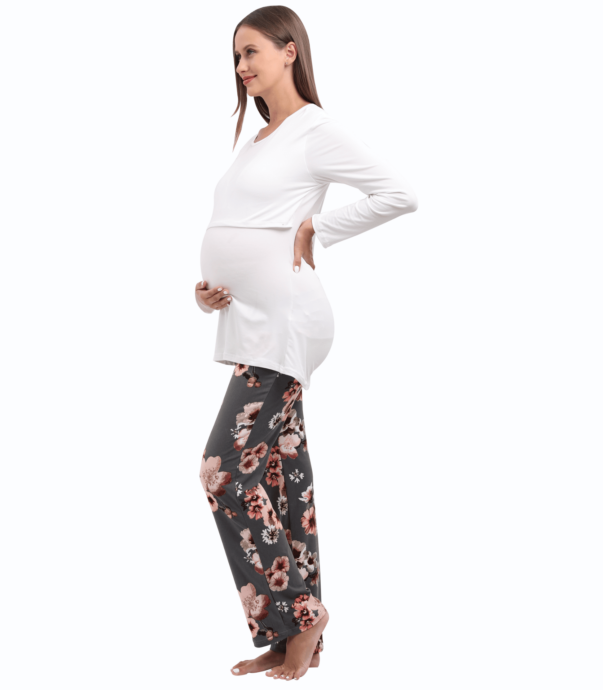 Nasze ulubione spodnie do piżamy w zestawie z pasującą koszulą do karmienia z długim rękawem! Ten zestaw oferuje spodnie do piżamy poniżej brzucha, które nigdy nie będą ograniczać rosnącego brzuszka ani przeszkadzać w nacięciach po cesarskim cięciu. Zawiera także przyjazną dla brzucha białą koszulę do karmienia z długim rękawem, którą można nosić w ciąży i po porodzie. Super miękki materiał, idealny do przytulania z dzieckiem.
