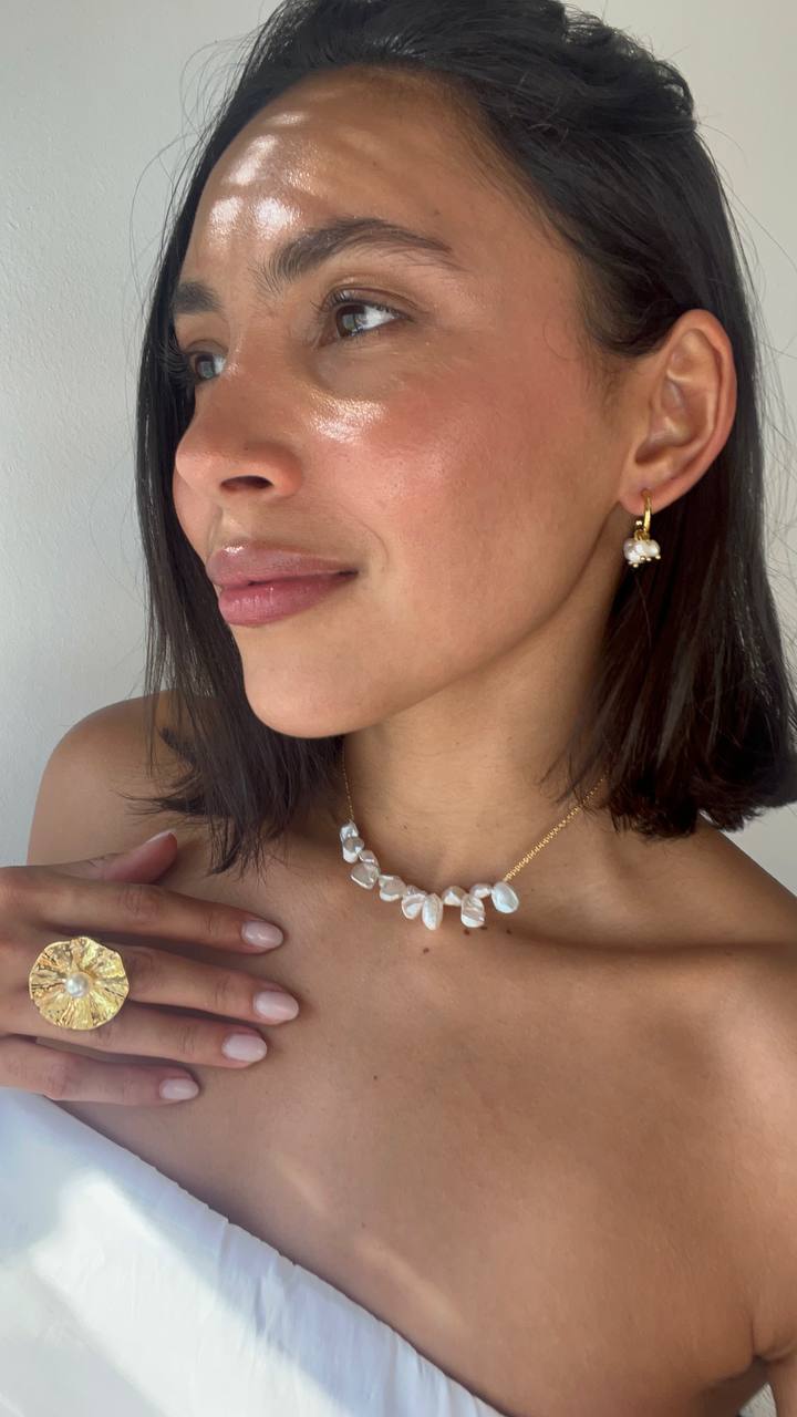 Indulge in the exquisite MAREIA collection, featuring distinctive corn flake popcorn pearls that create a captivating textural statement. These hypoallergenic pieces offer both refined elegance and comfort for sensitive skin, allowing you to embrace sophisticated style without compromise.