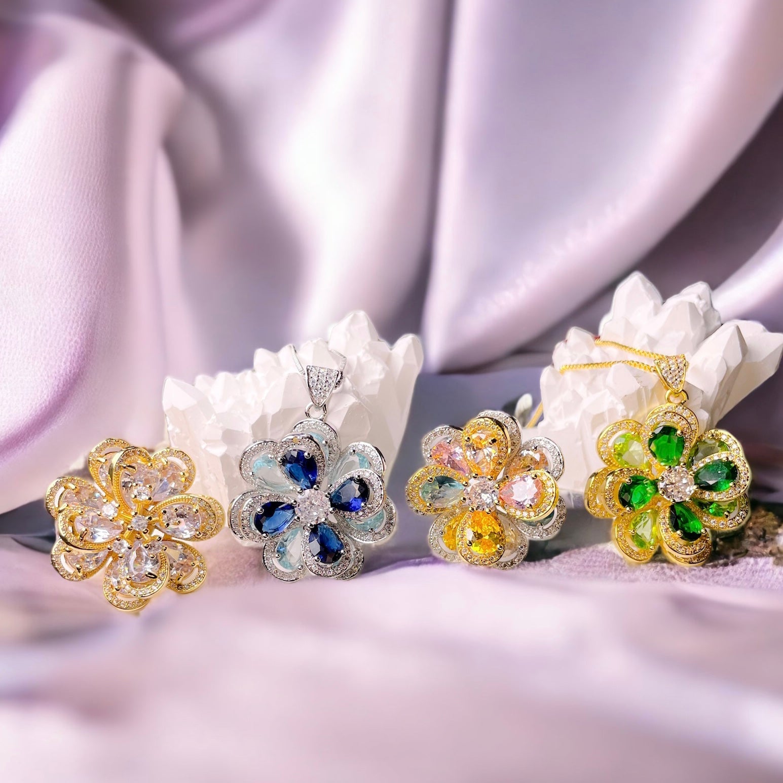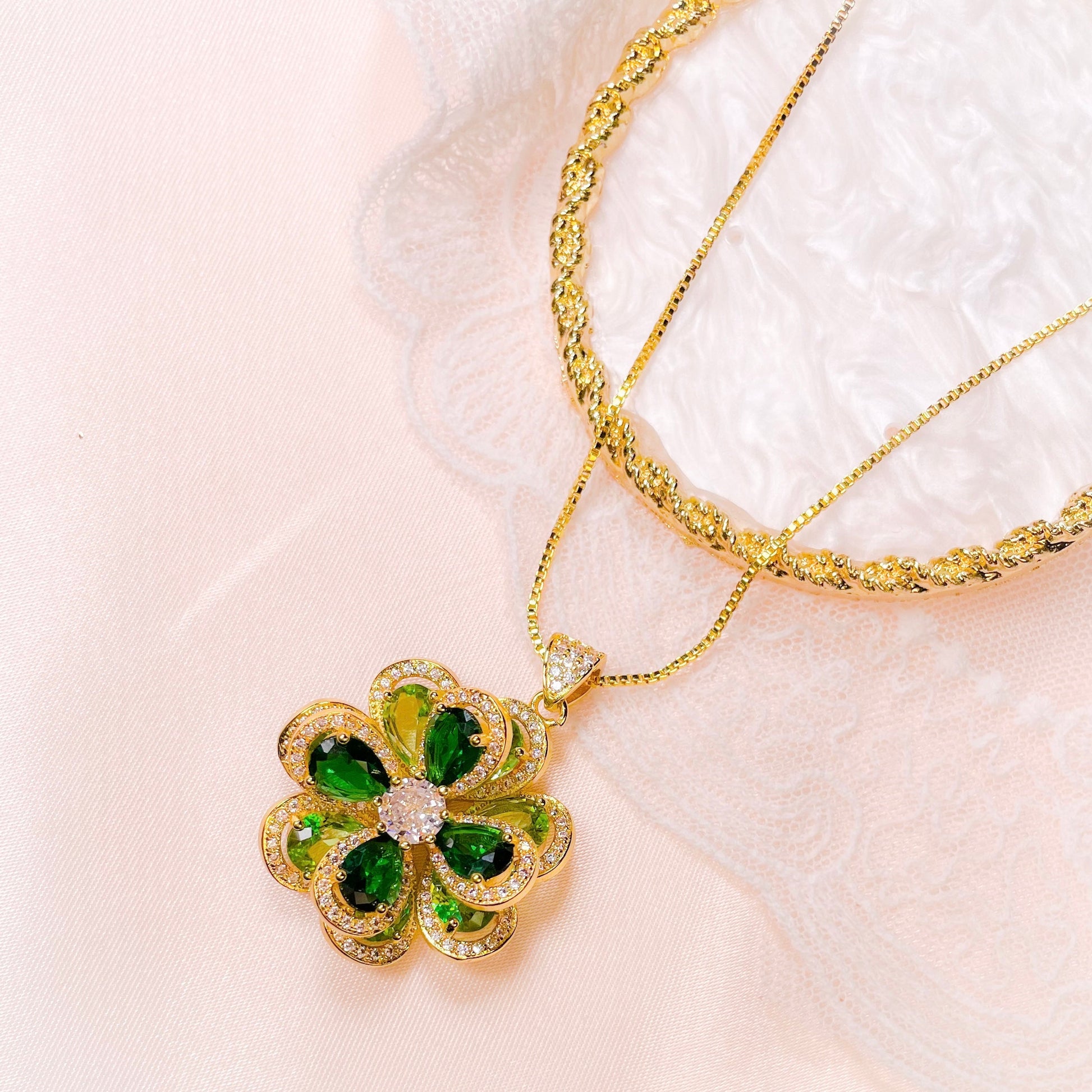 Uwolnij swoją wewnętrzną boginię dzięki naszyjnikowi Messalina. Ten odważny naszyjnik z dużym kwiatowym wisiorkiem ozdobionym błyszczącymi kryształami i szmaragdowymi kamieniami emanuje elegancją i luksusem. Idealny, aby dodać blasku na imprezy i specjalne okazje.