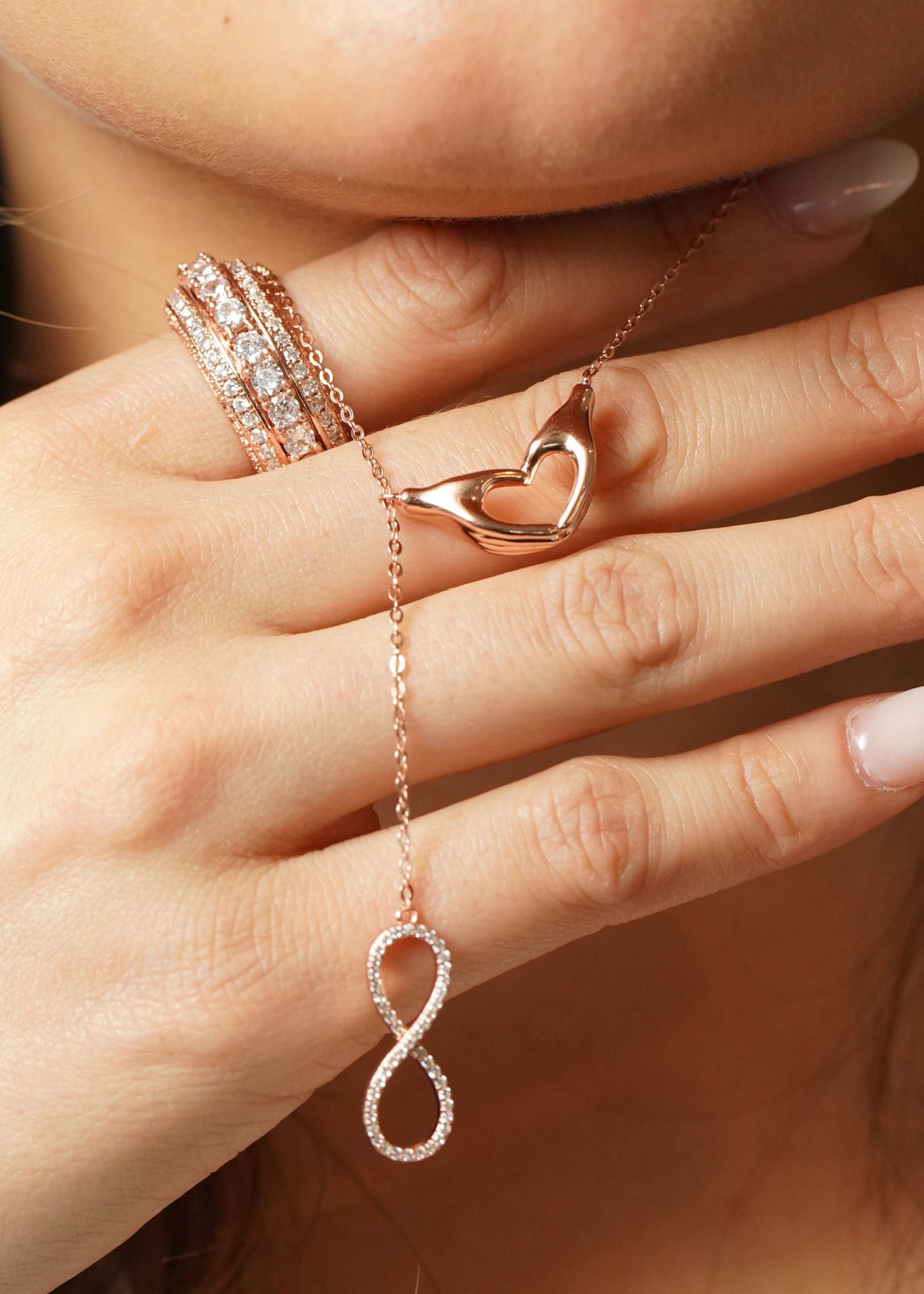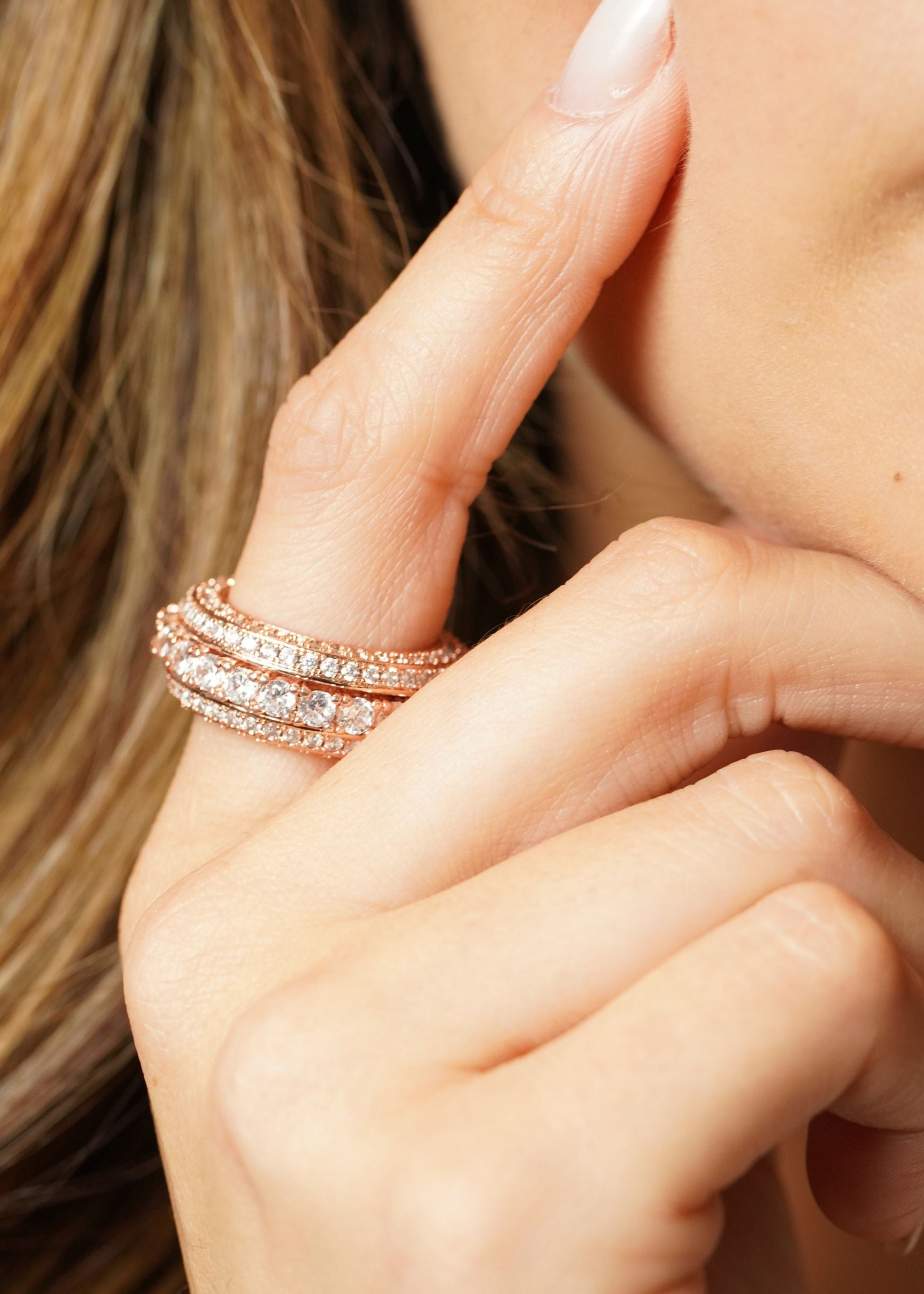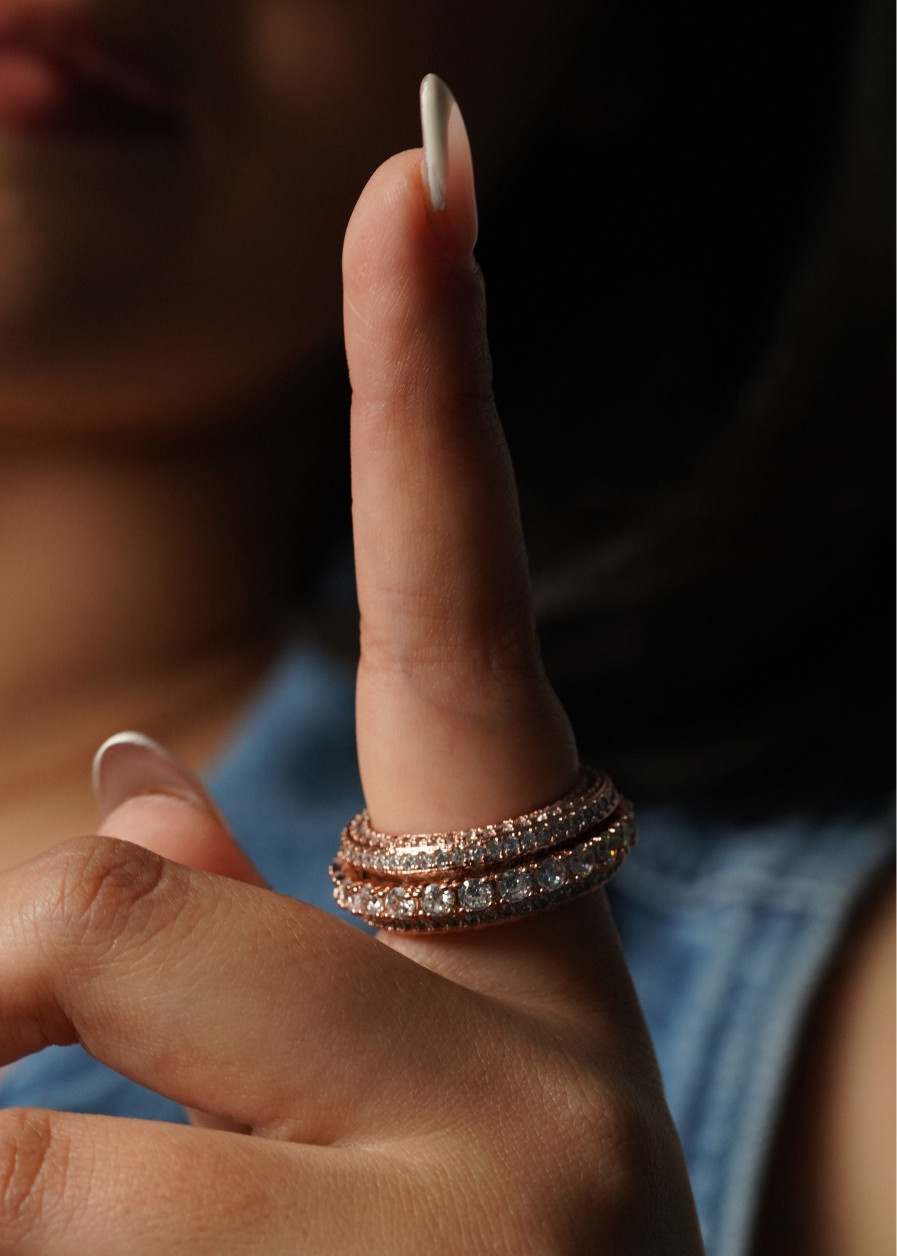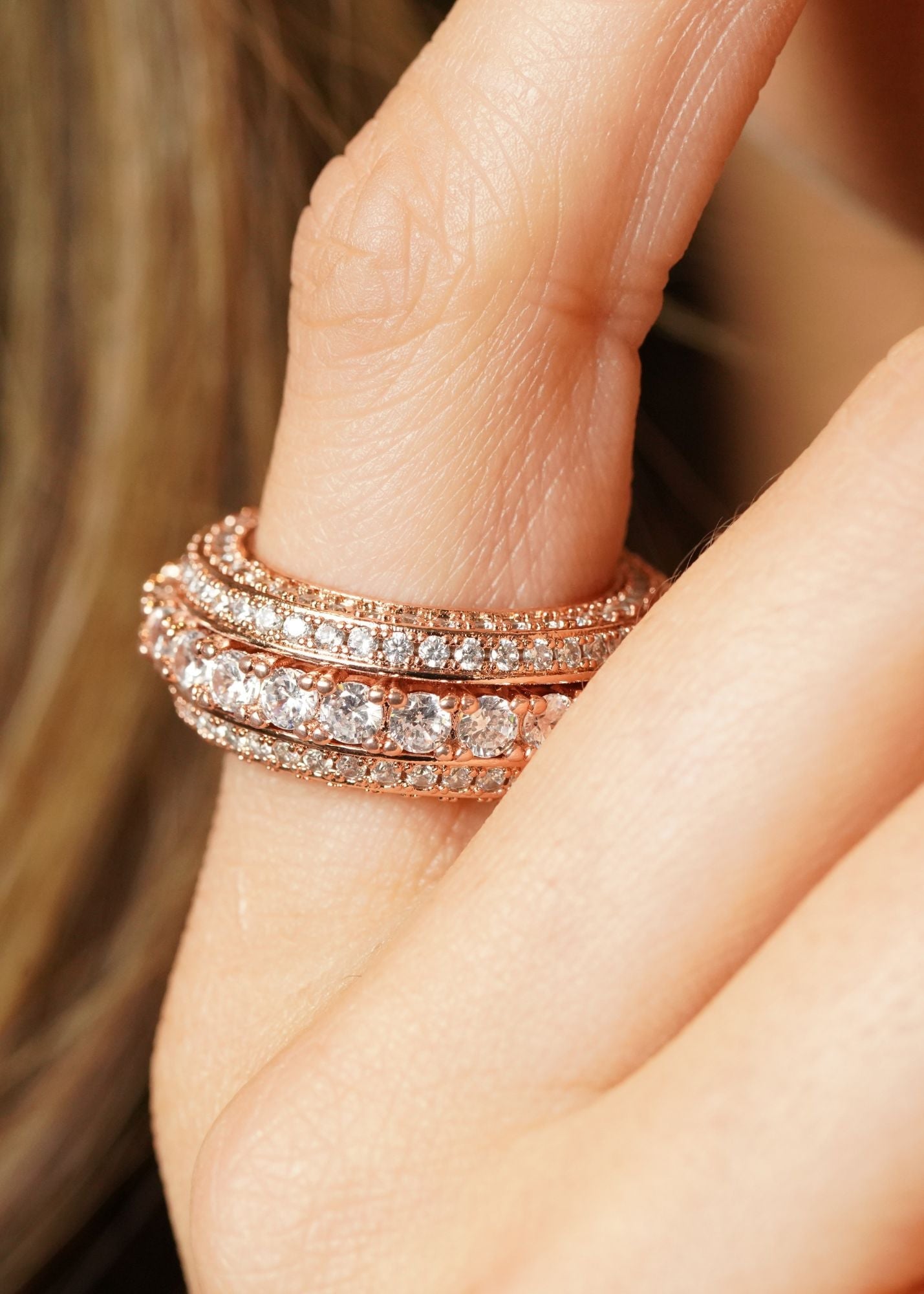 Nasza charakterystyczna obracająca się obrączka Center Stage w kolorze różowego złota. Najdelikatniejszy odcień różu, idealnie dopasowany do naszego naszyjnika Heartfelt. Rose Center Stage jest zaprojektowany, aby robić wrażenie, dawać poczucie luksusu i być funkcjonalny. Ten pierścionek będzie Twoim najlepszym towarzyszem, służąc jako spinner redukujący stres, a jednocześnie przyciągając uwagę wszystkich, których spotkasz. Innowacja w najlepszym wydaniu.
