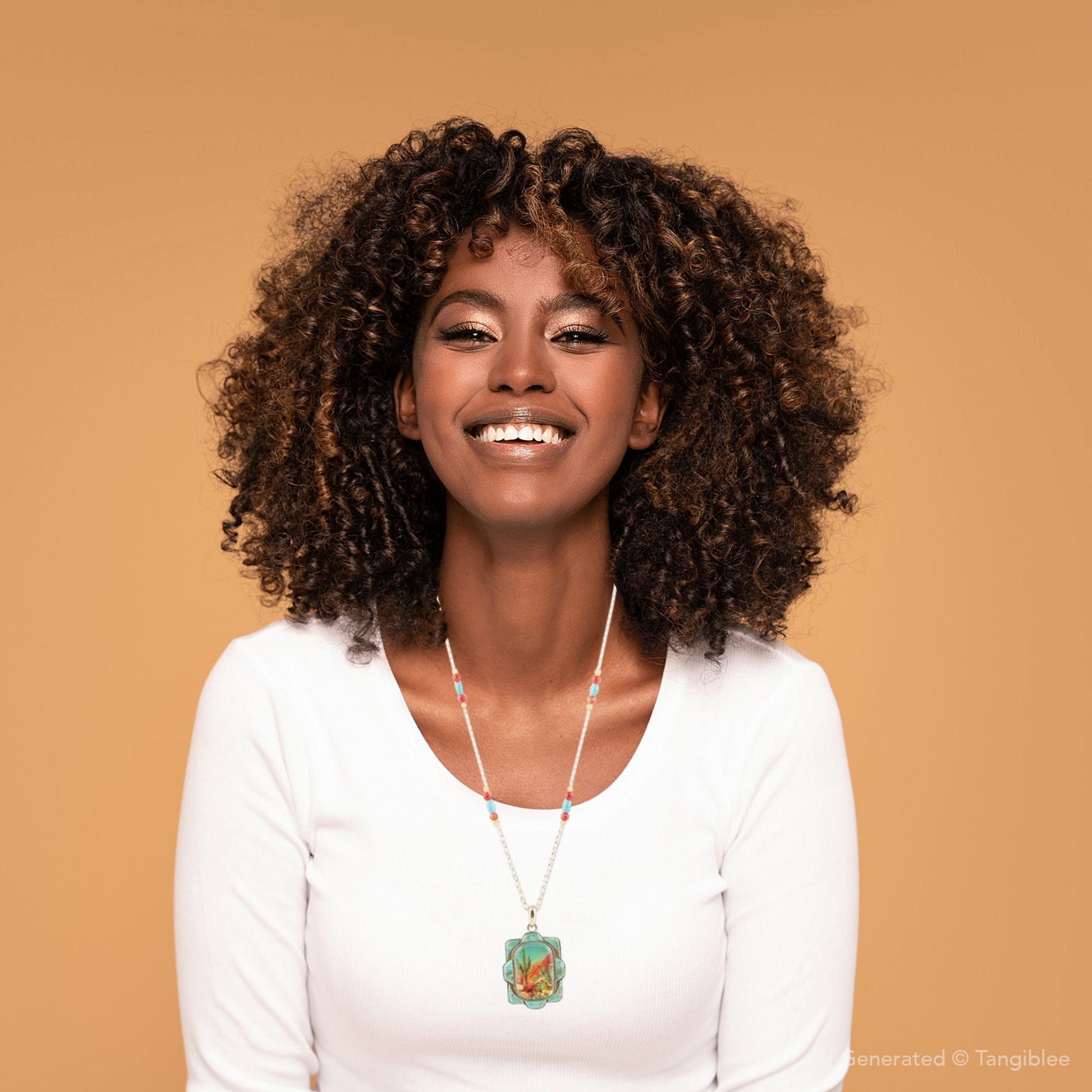 Poczuj zapierające dech w piersiach piękno malowniczej pustyni Sedona dzięki naszemu naszyjnikowi z zawieszką Desert Blue Turkus Golden Pendant. Ten oszałamiający element zawiera prawdziwy kamień turkusowy otoczony żywym obrazem pustyni pod przezroczystą powłoką z kwarcu. Regulowany naszyjnik można nosić do 30" z bezpiecznym zapięciem typu lobster clasp. Podziwiaj długość 2,25" od zawieszki i szerokość 1,5" w najszerszym miejscu. Naszyjnik waży 1,12 oz i jest mistrzowsko wykonany i wykończony ręcznie. Spraw sobie tę naprawdę niezwykłą i jedyną w swoim rodzaju ozdobę.