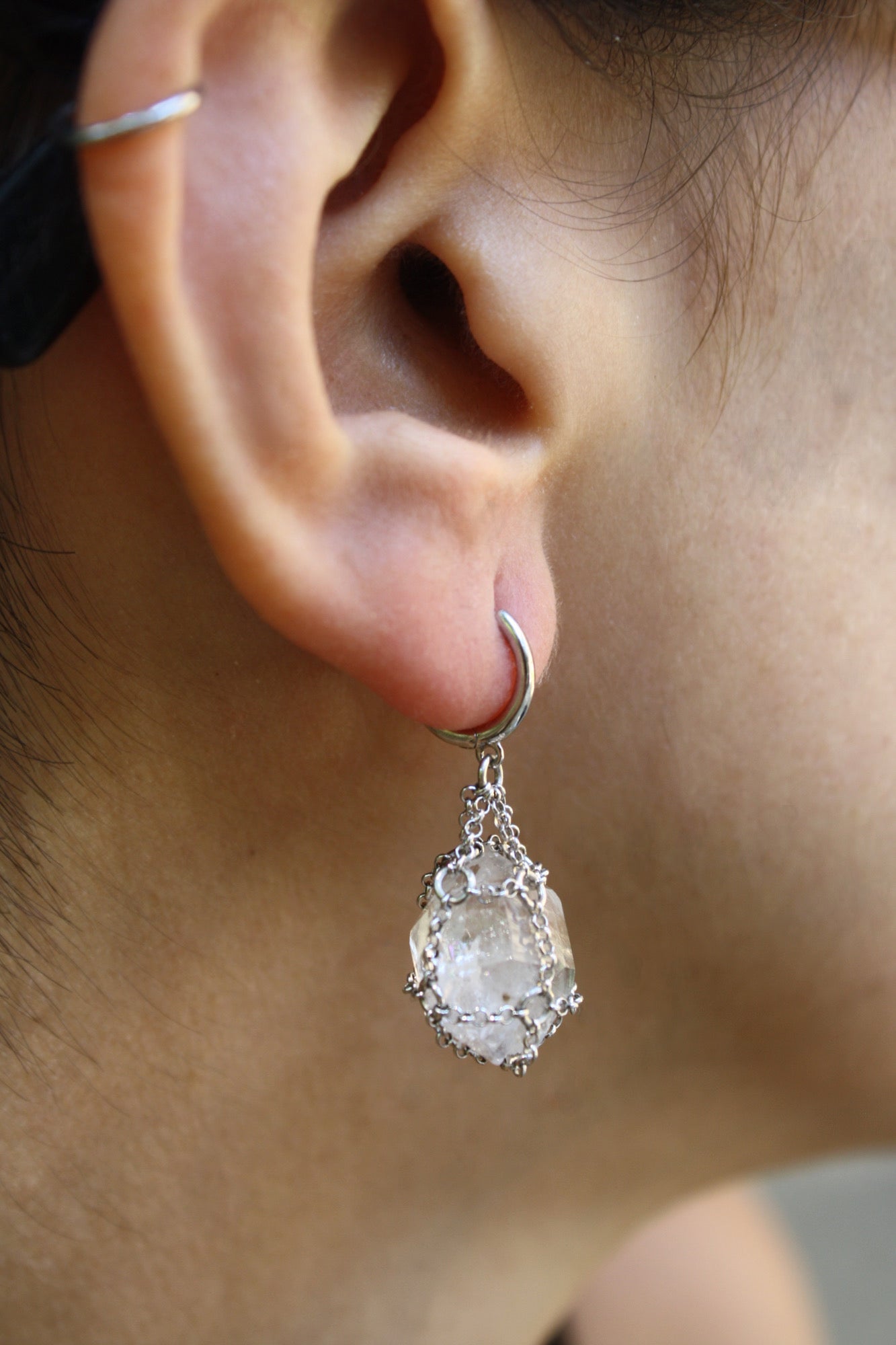 Ręcznie wykonany z unikalnego kamienia kwarcowego zamkniętego w łańcuszku ze srebra próby sterling, ten kolczyk jest lekki i idealny do codziennego noszenia. Kamień kwarcowy błyszczy w świetle i podkreśli każdy strój.