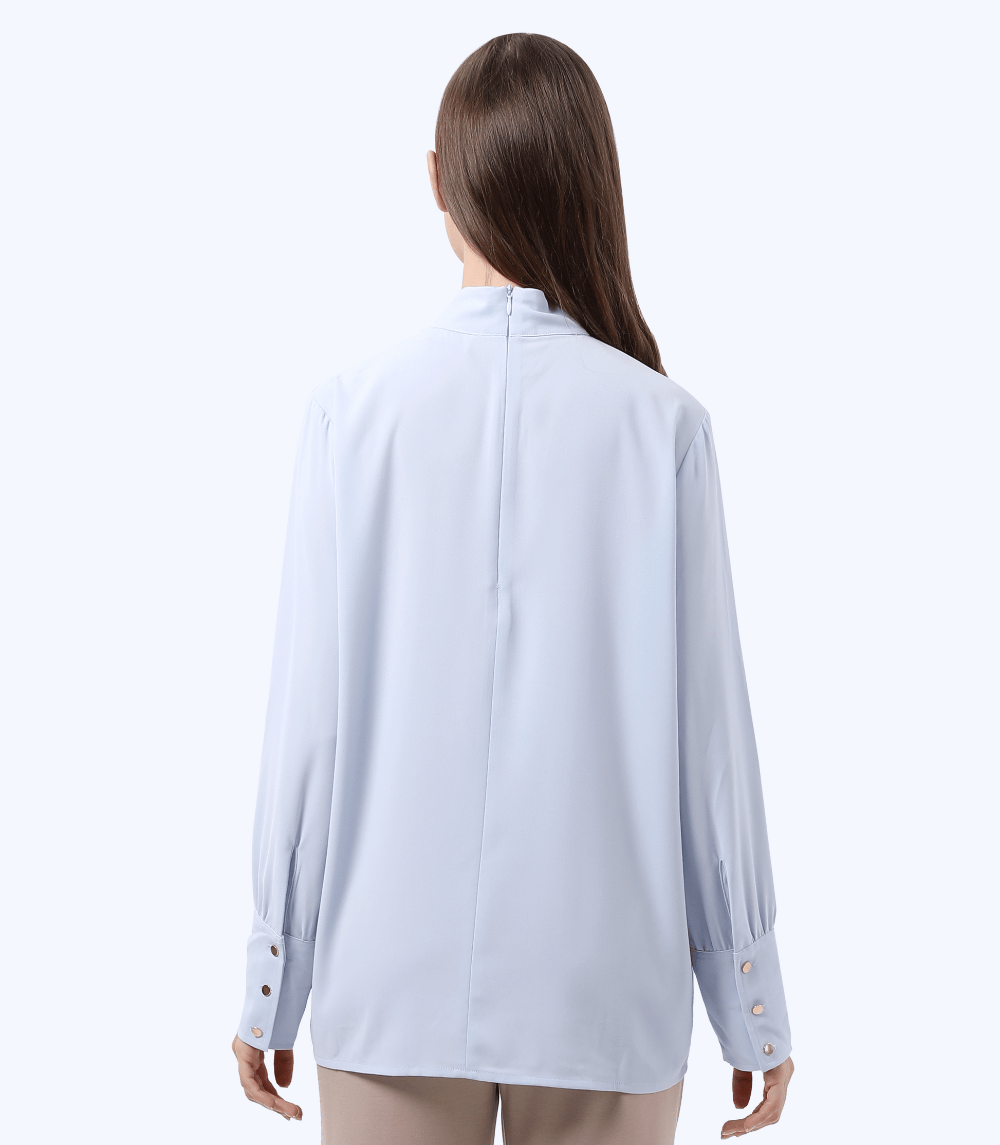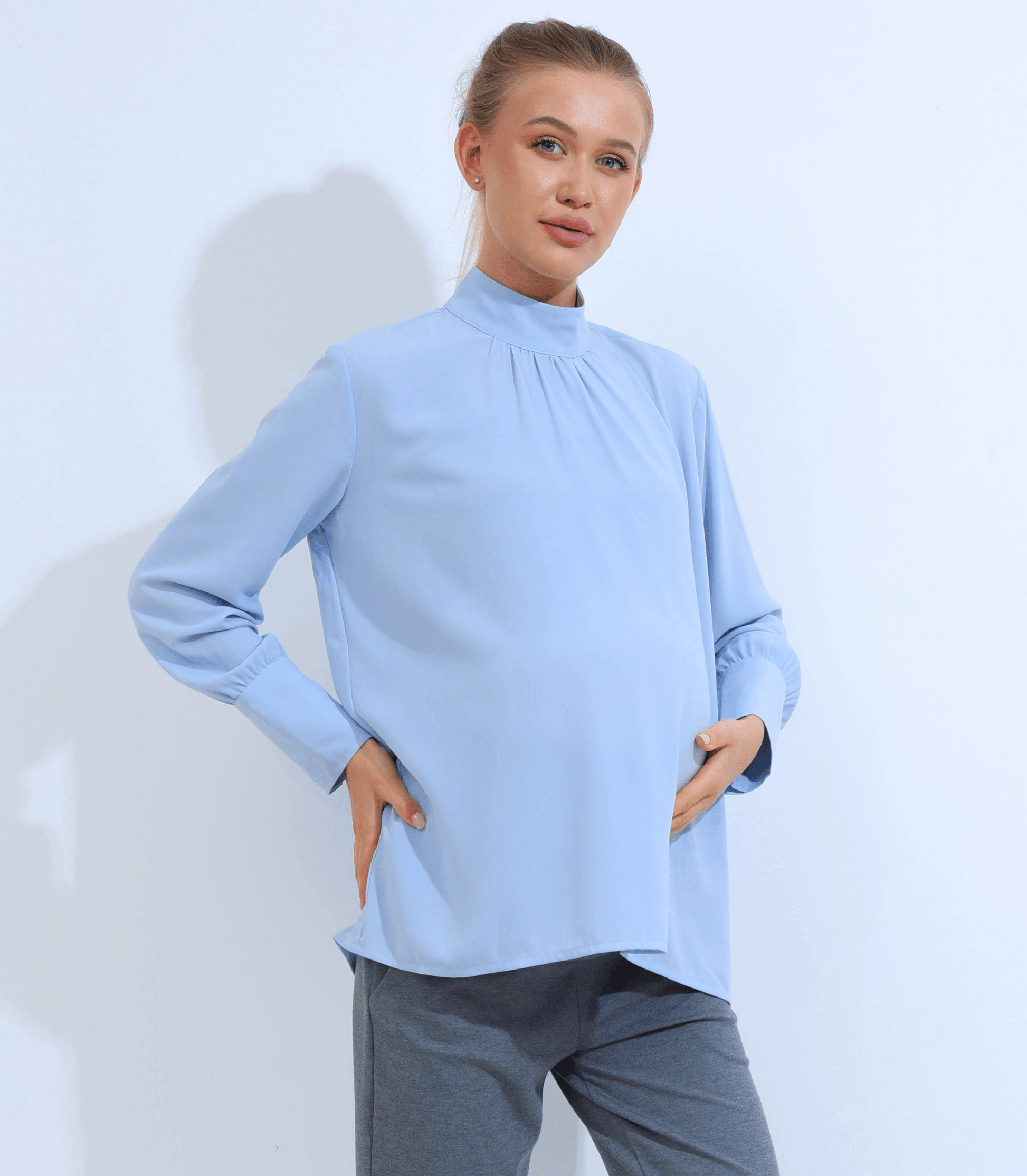 Błękitna niebieska bluzka ciążowa z długim rękawem i stójką