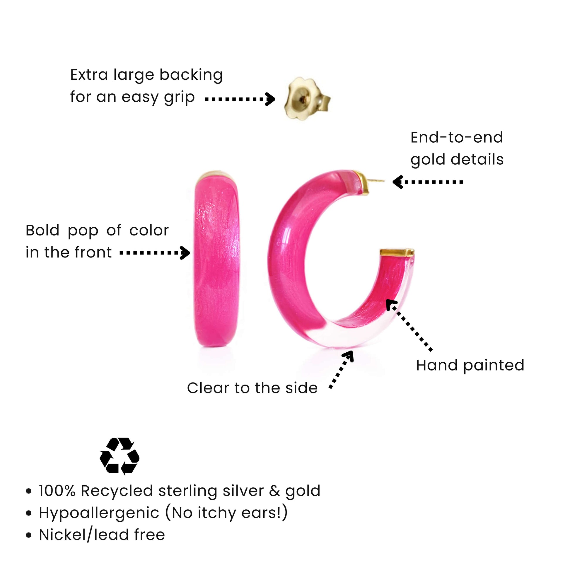 - Duże zapięcie do kolczyków, które łatwo chwycić i które zapobiegnie opadaniu kolczyka na uchu