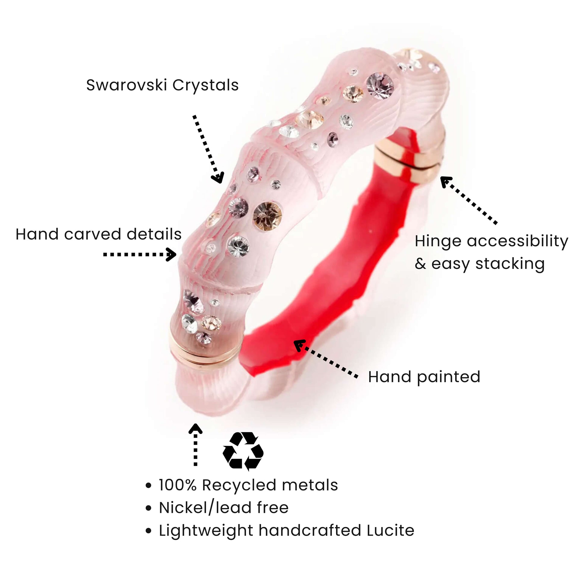 Ta szykowna bransoletka z lucytu w stylu bambusowym ma gładki zawiasowy design dla łatwego noszenia i jest ozdobiona błyszczącymi kryształami Swarovski, dodającymi odrobinę blasku. Ręcznie rzeźbiona faktura bambusa dodaje artystycznego charakteru.
